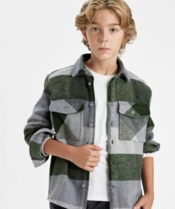 پیراهن قالب گشاد پارچه پشمی آستین بلند یقه سه دکمه چهارخانه پسرانه برند Defacto کد 1737788631