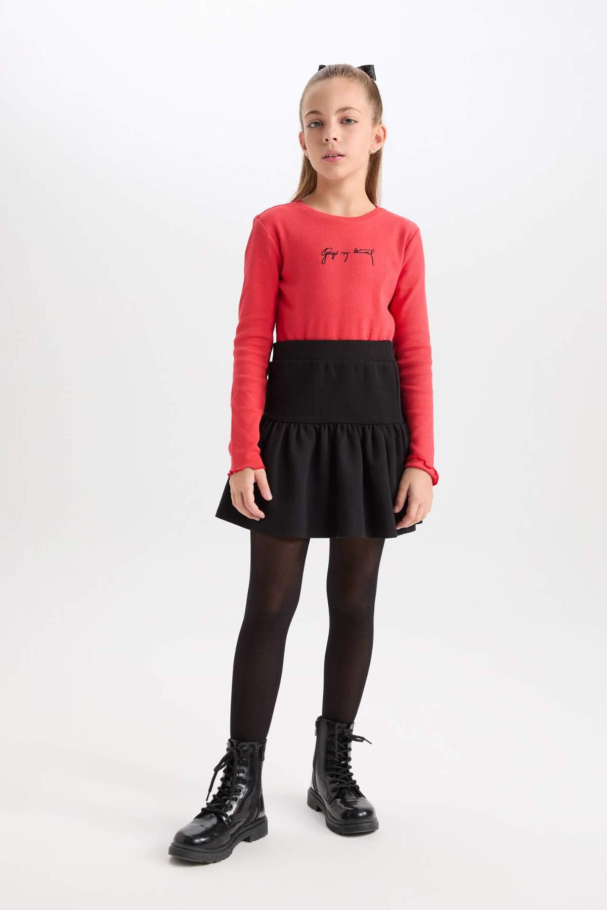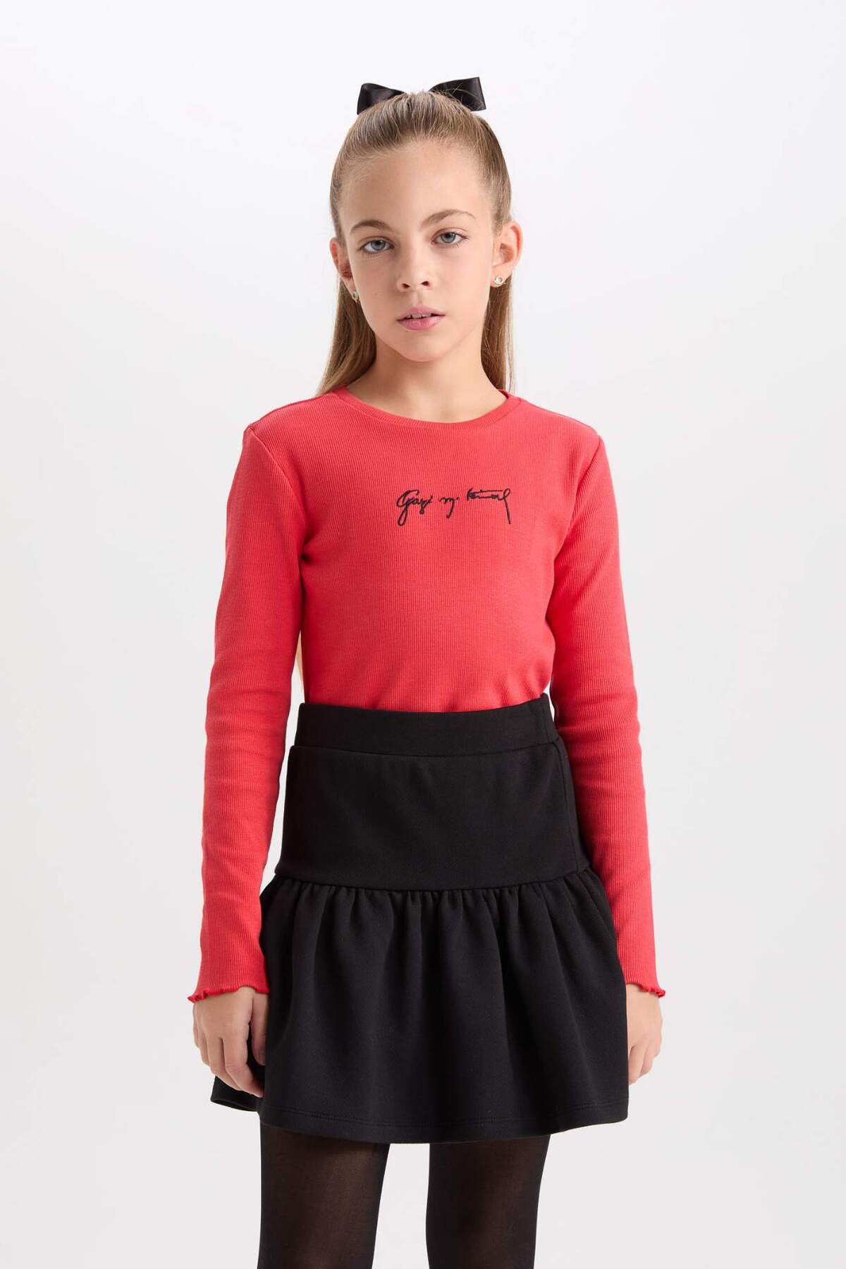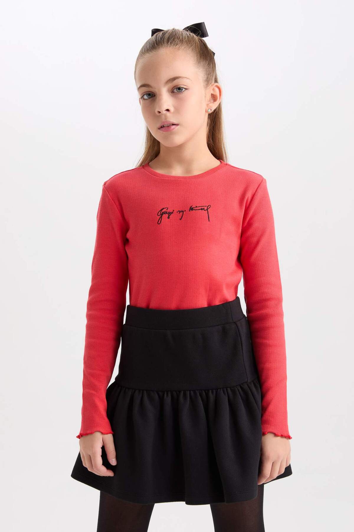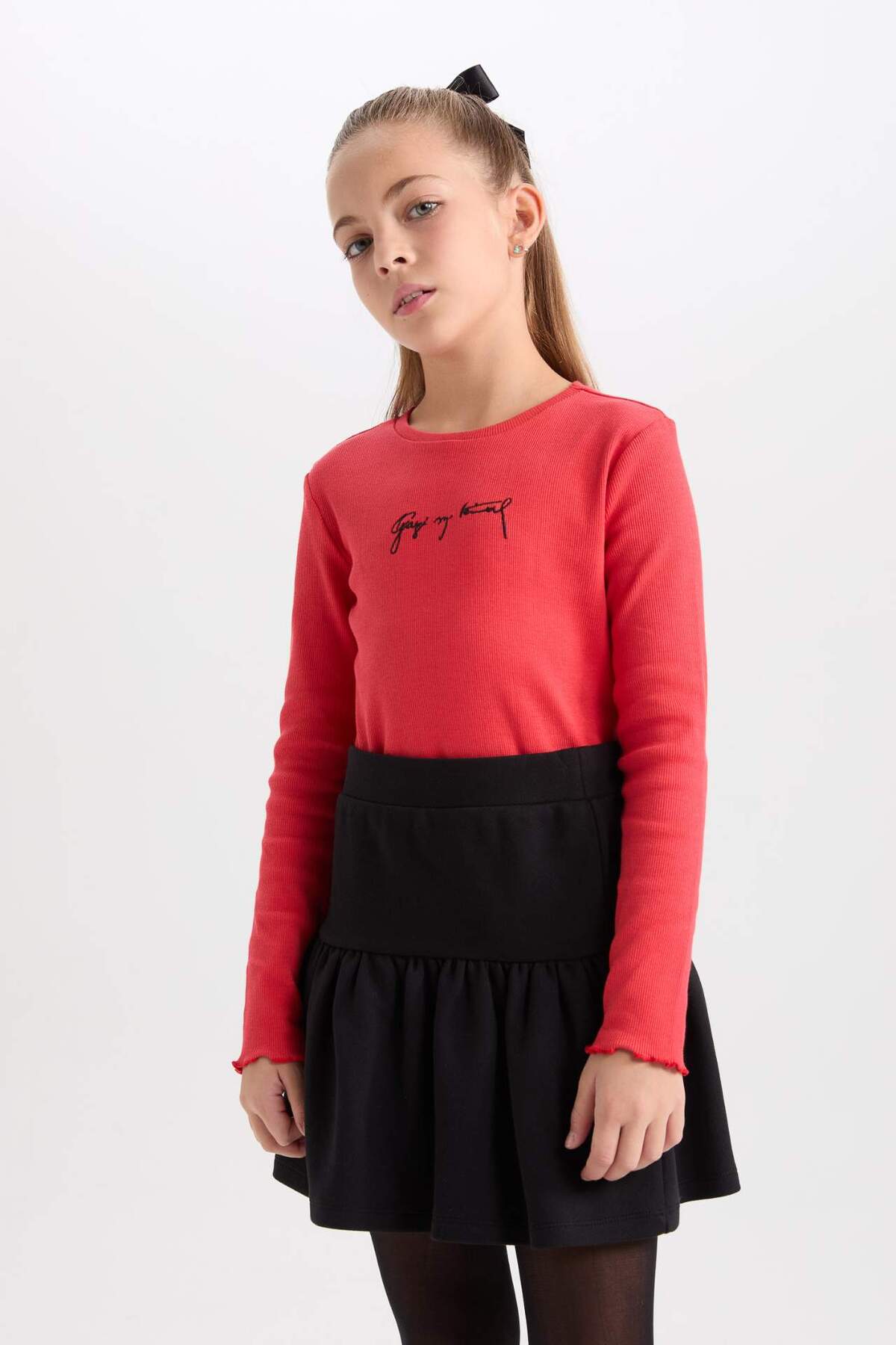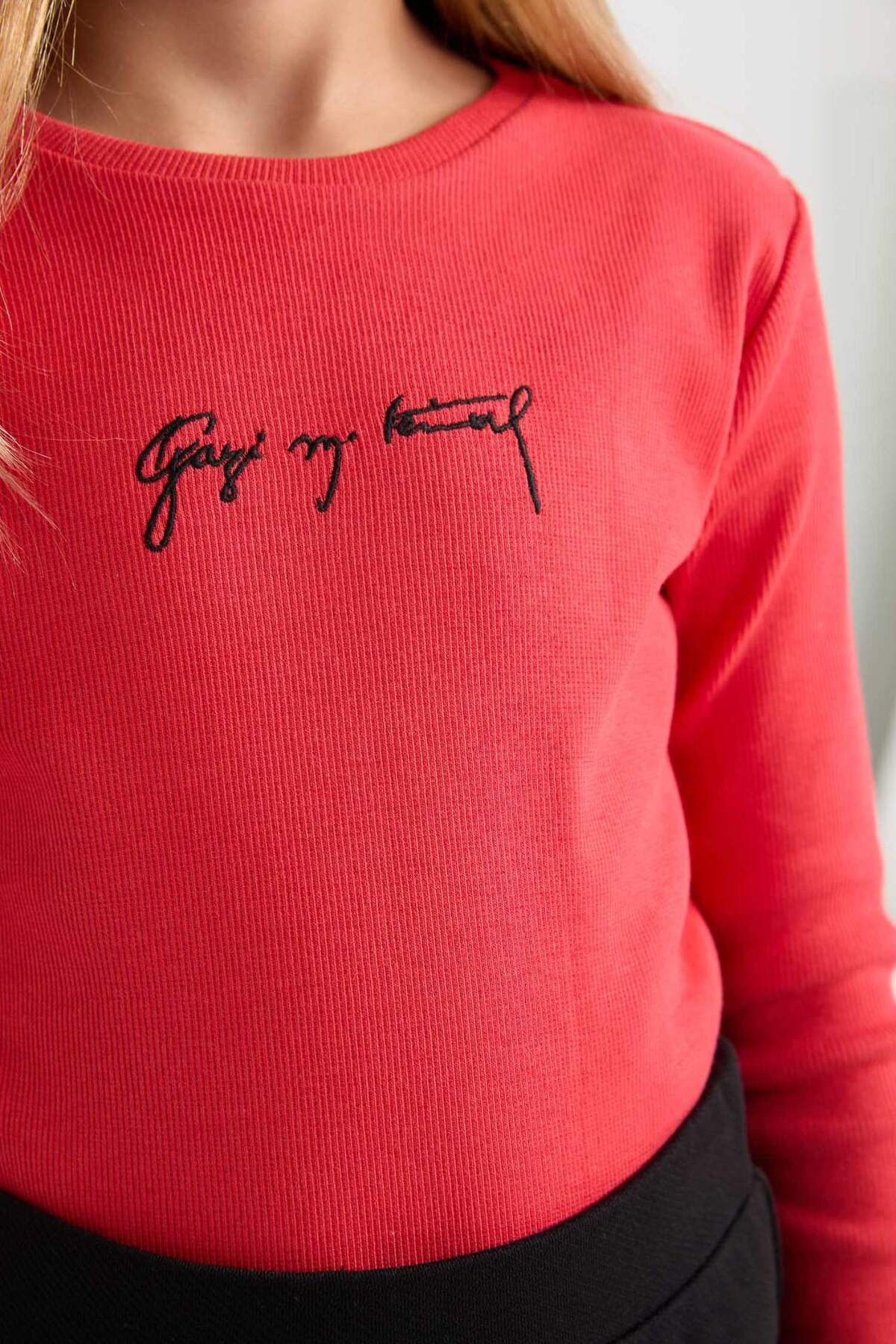 ست دو تکه دخترانه با یقه گرد و یقه دوخته شده با طرح تمثال آتاتürk، رنگ قرمز، با آستین بلند و شامل یک تیشرت و گیره مو. برند Defacto