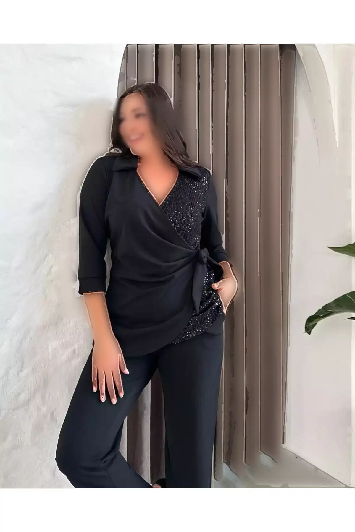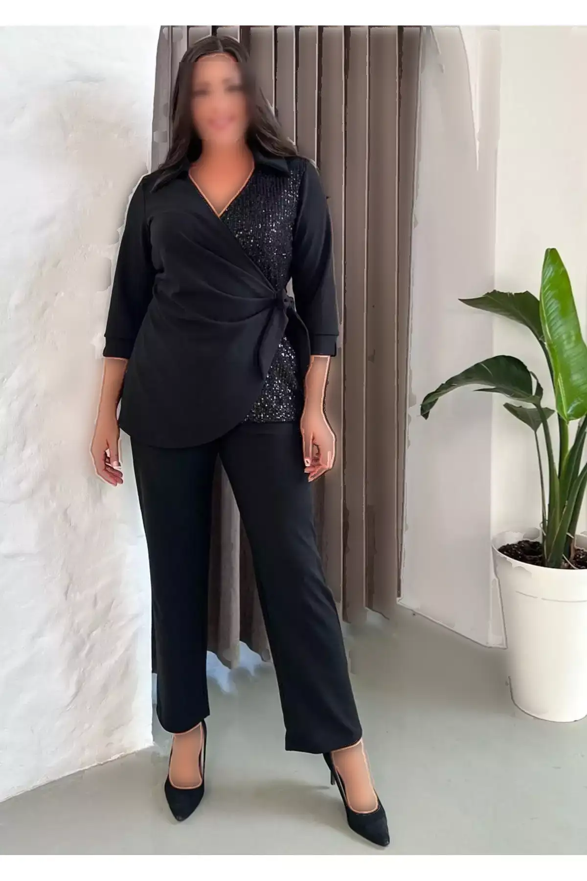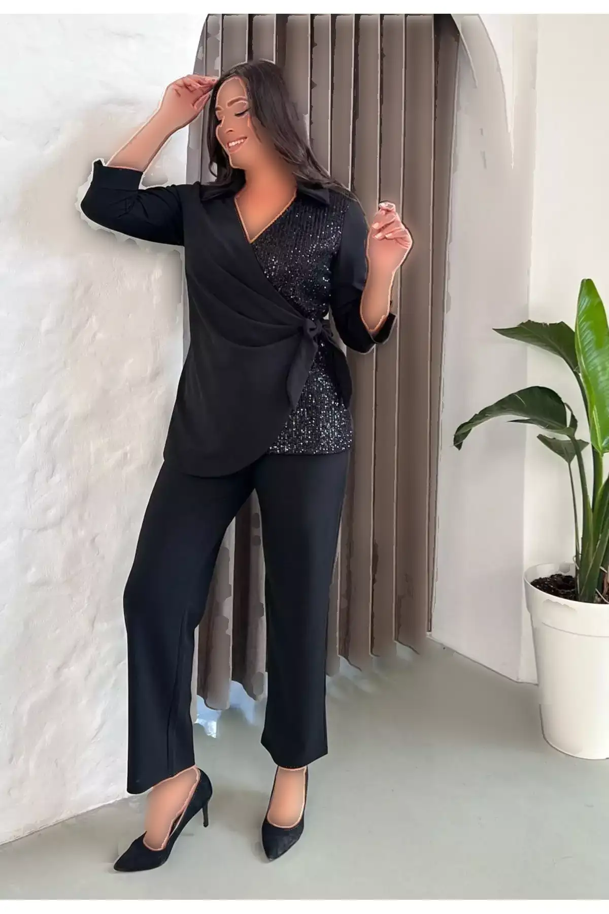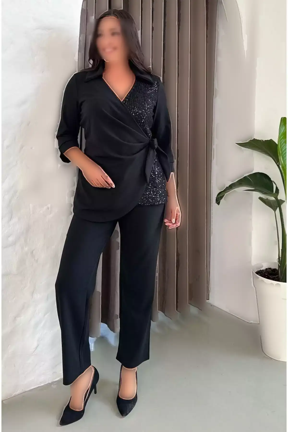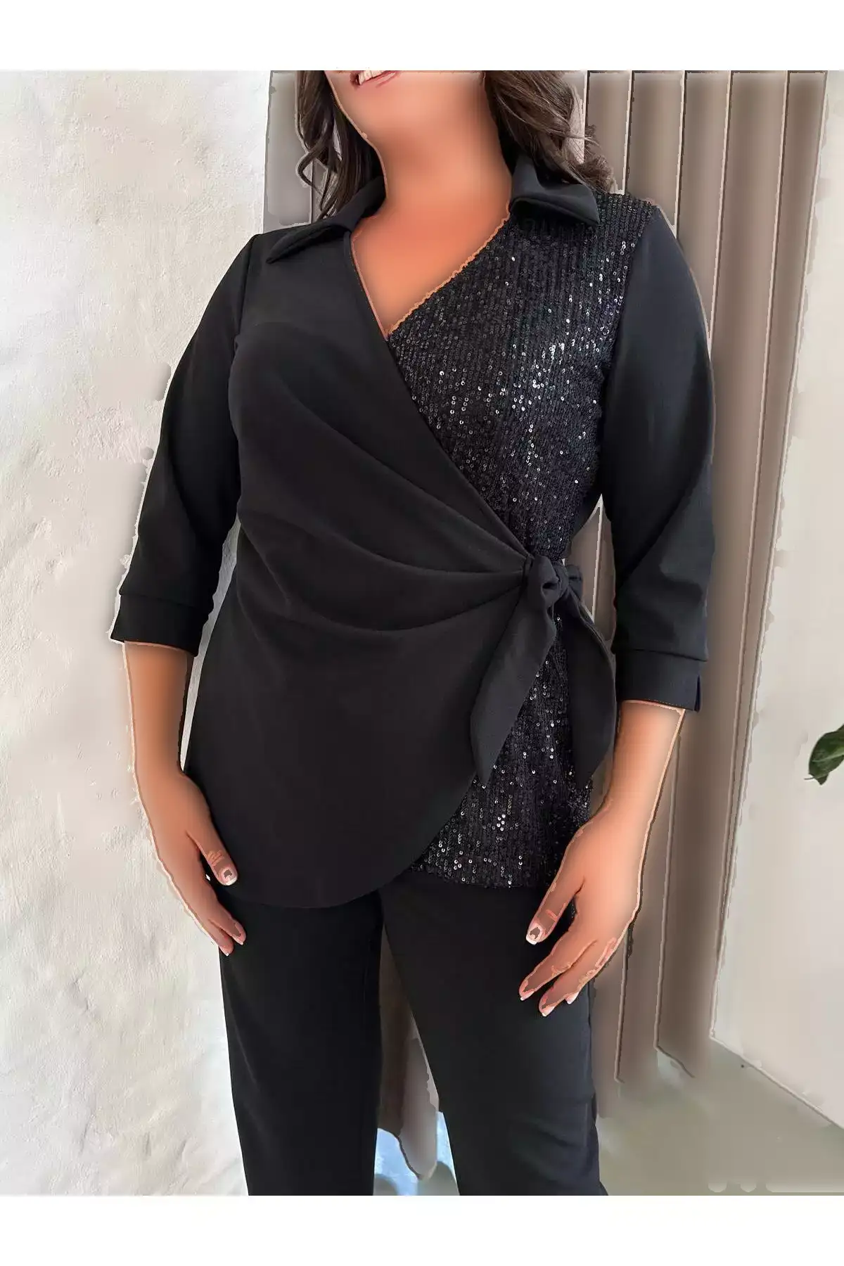 لباس شب زنانه با یقه کراوات، با جزئیات سنگدوزی و آستین بلند، سایز بزرگ ۲۴۷۱۶ برند Butik Nilyam
