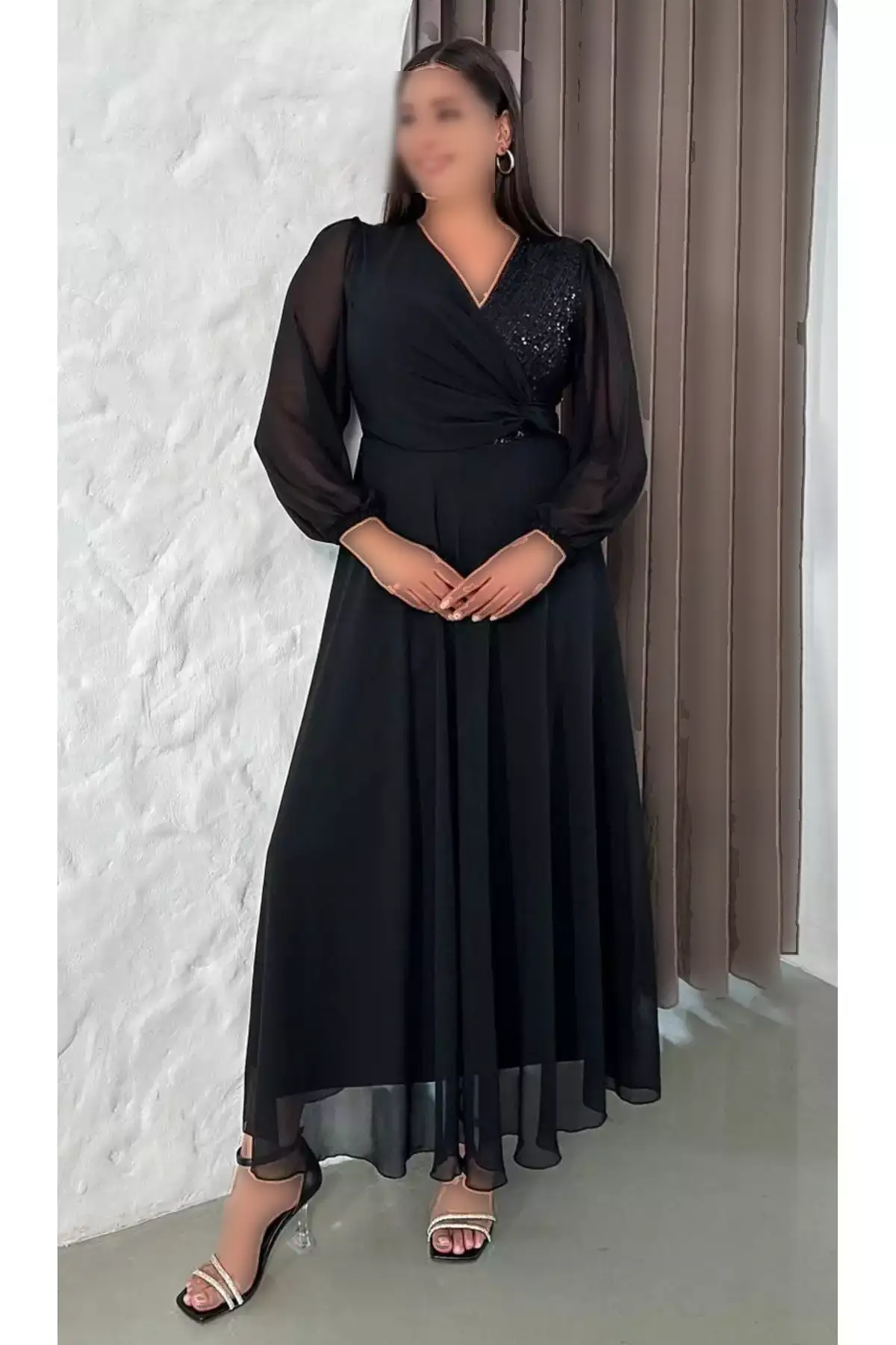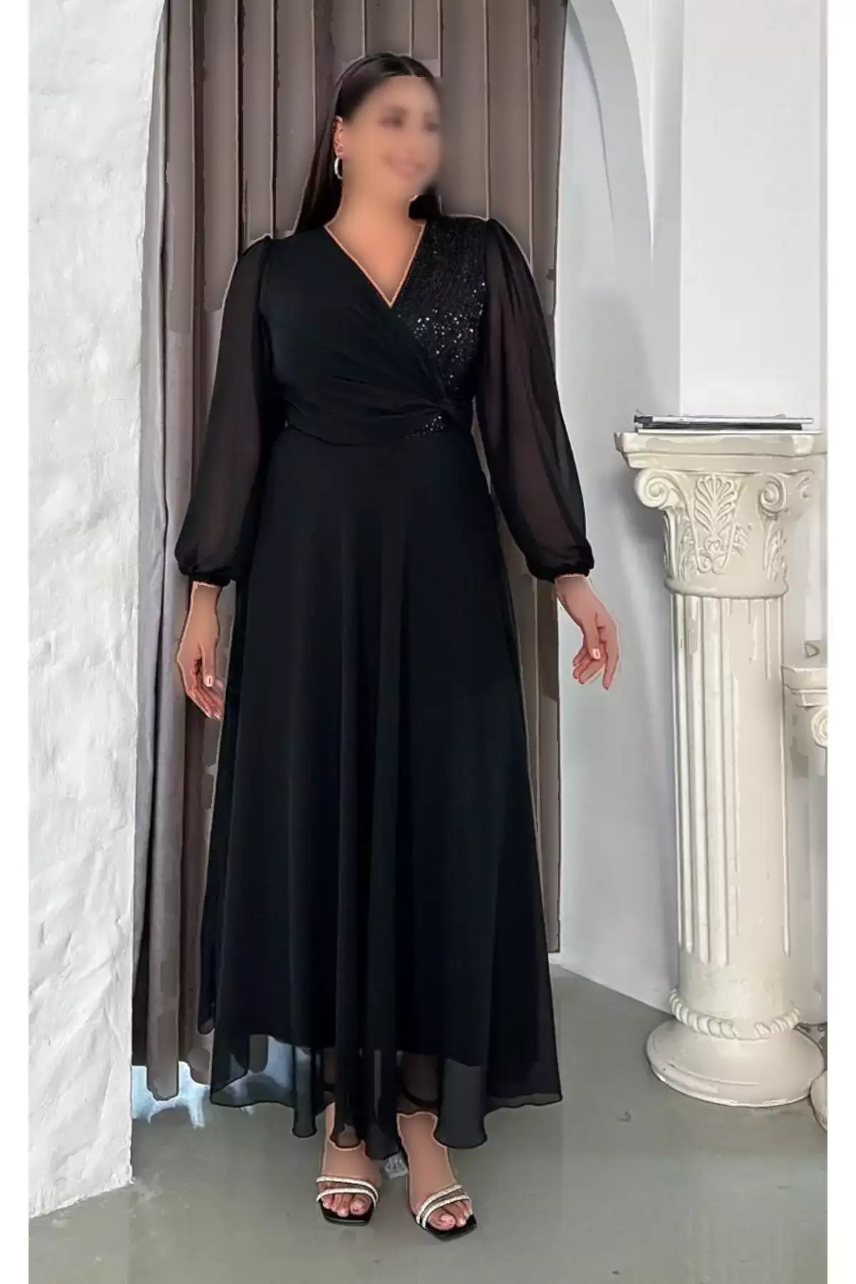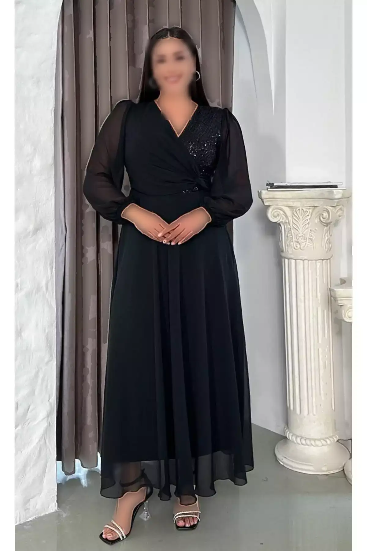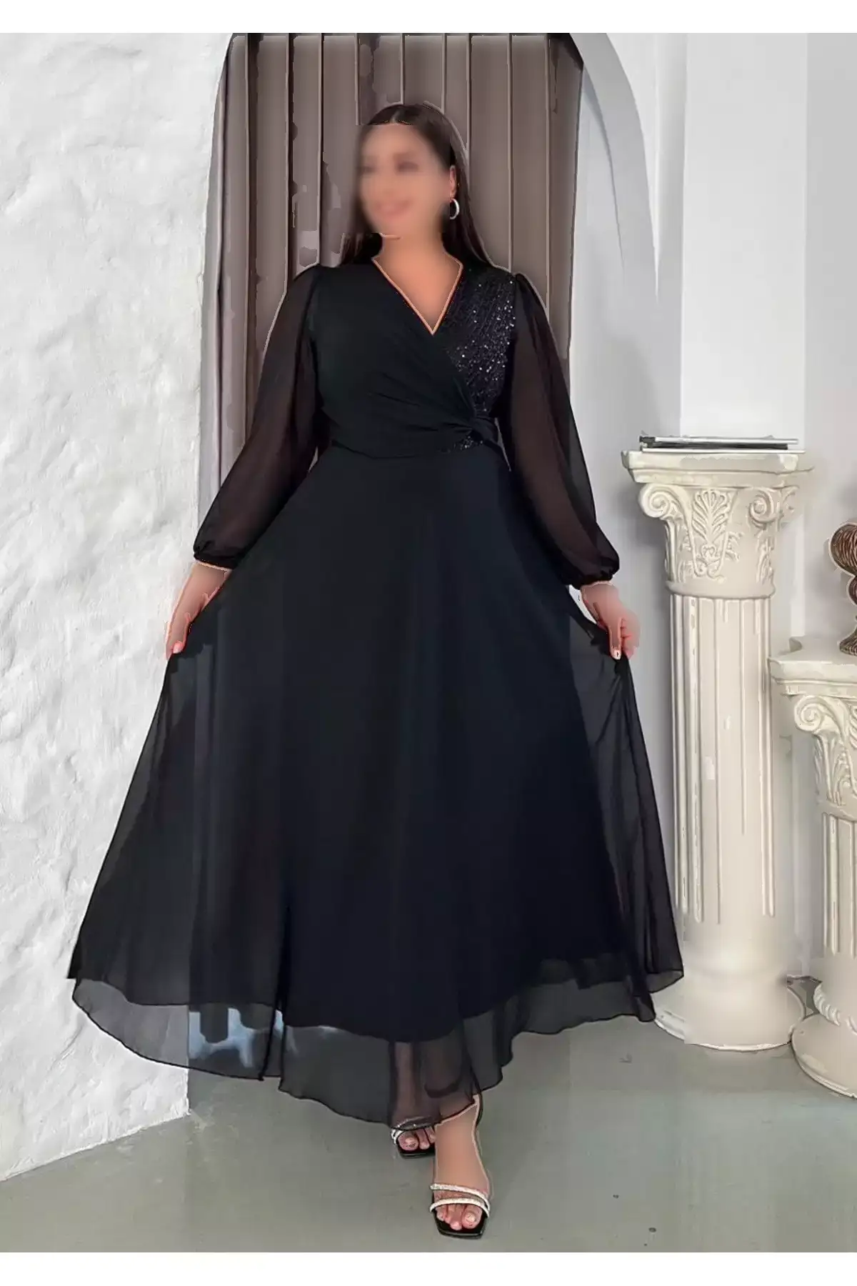 پالایش مشکی بزرگ سایز زنانه با یقه کراوات و آستین بلند، با جزئیات تزیینی از پولک، مناسب برای مهمانی و مراسم 24087 برند Butik Nilyam