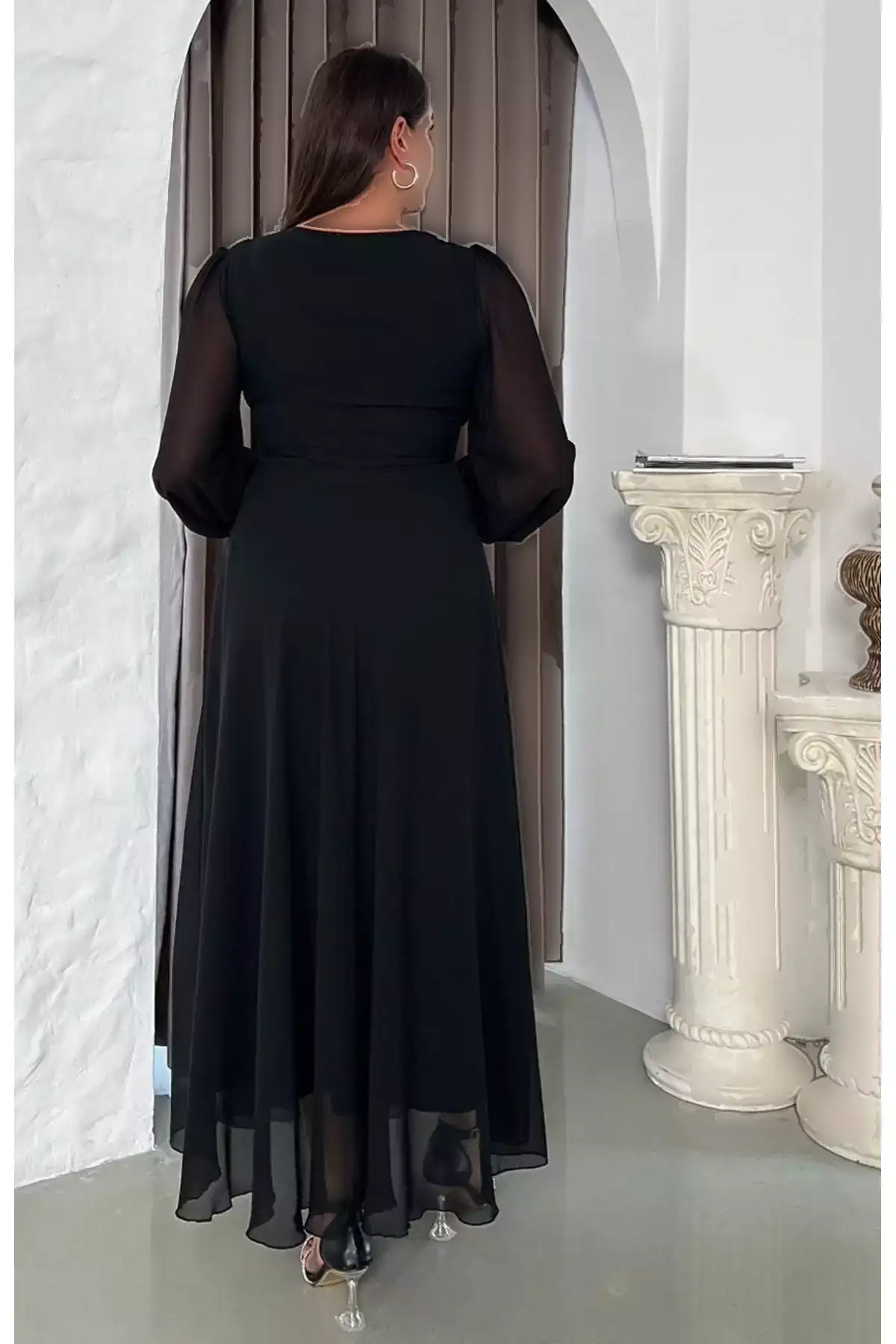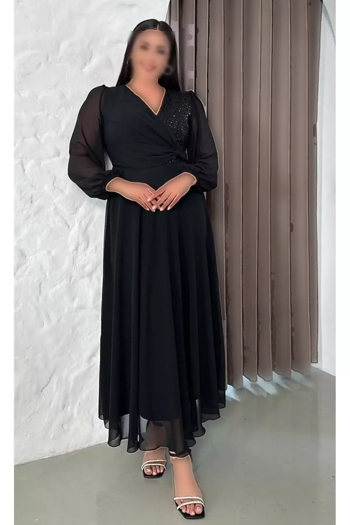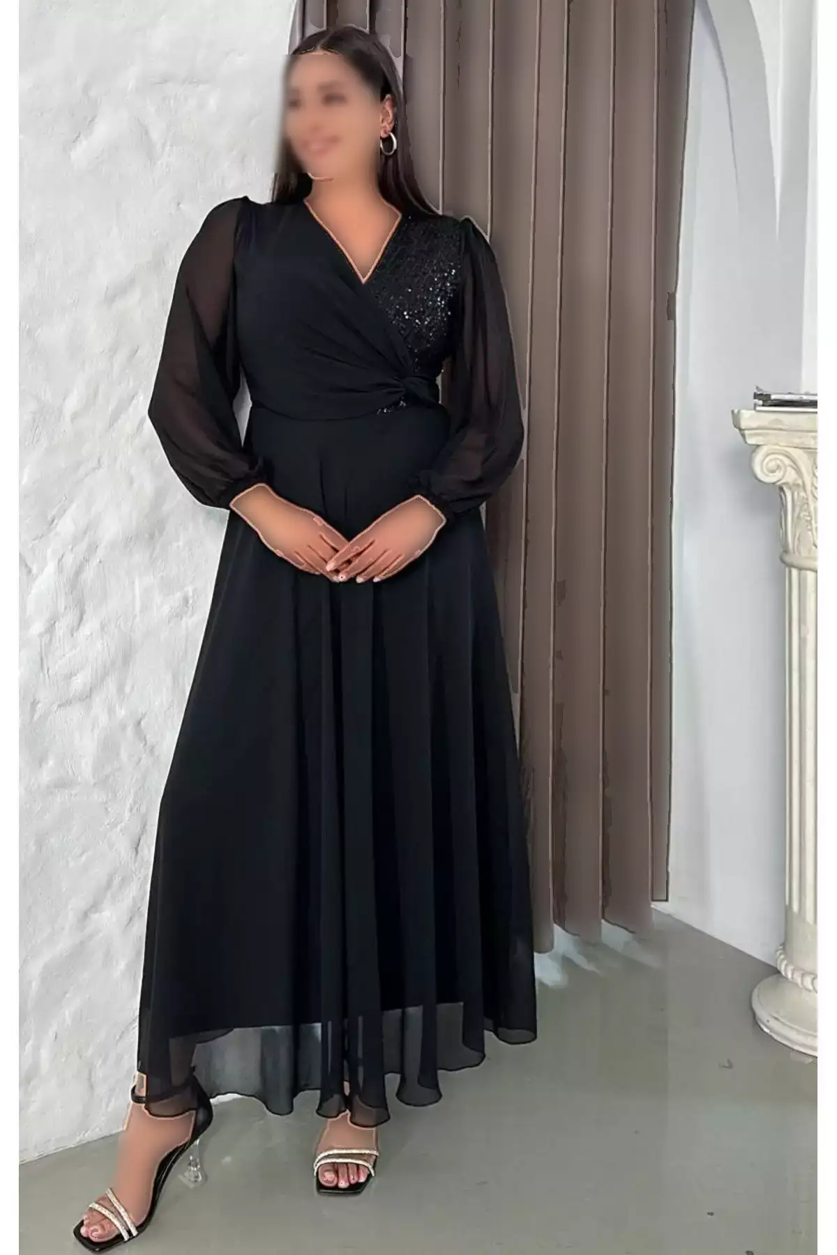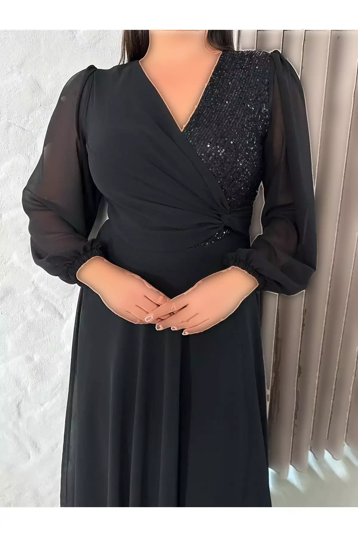 پالایش مشکی بزرگ سایز زنانه با یقه کراوات و آستین بلند، با جزئیات تزیینی از پولک، مناسب برای مهمانی و مراسم 24087 برند Butik Nilyam