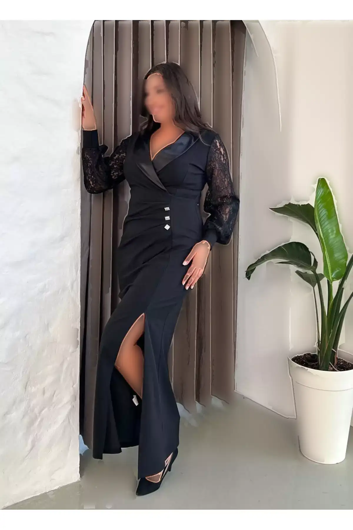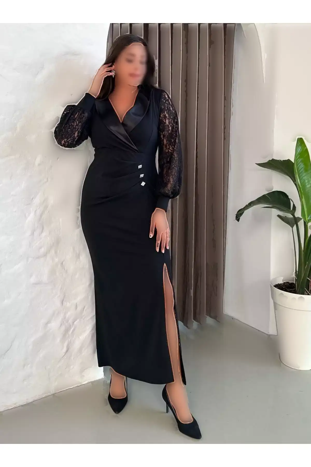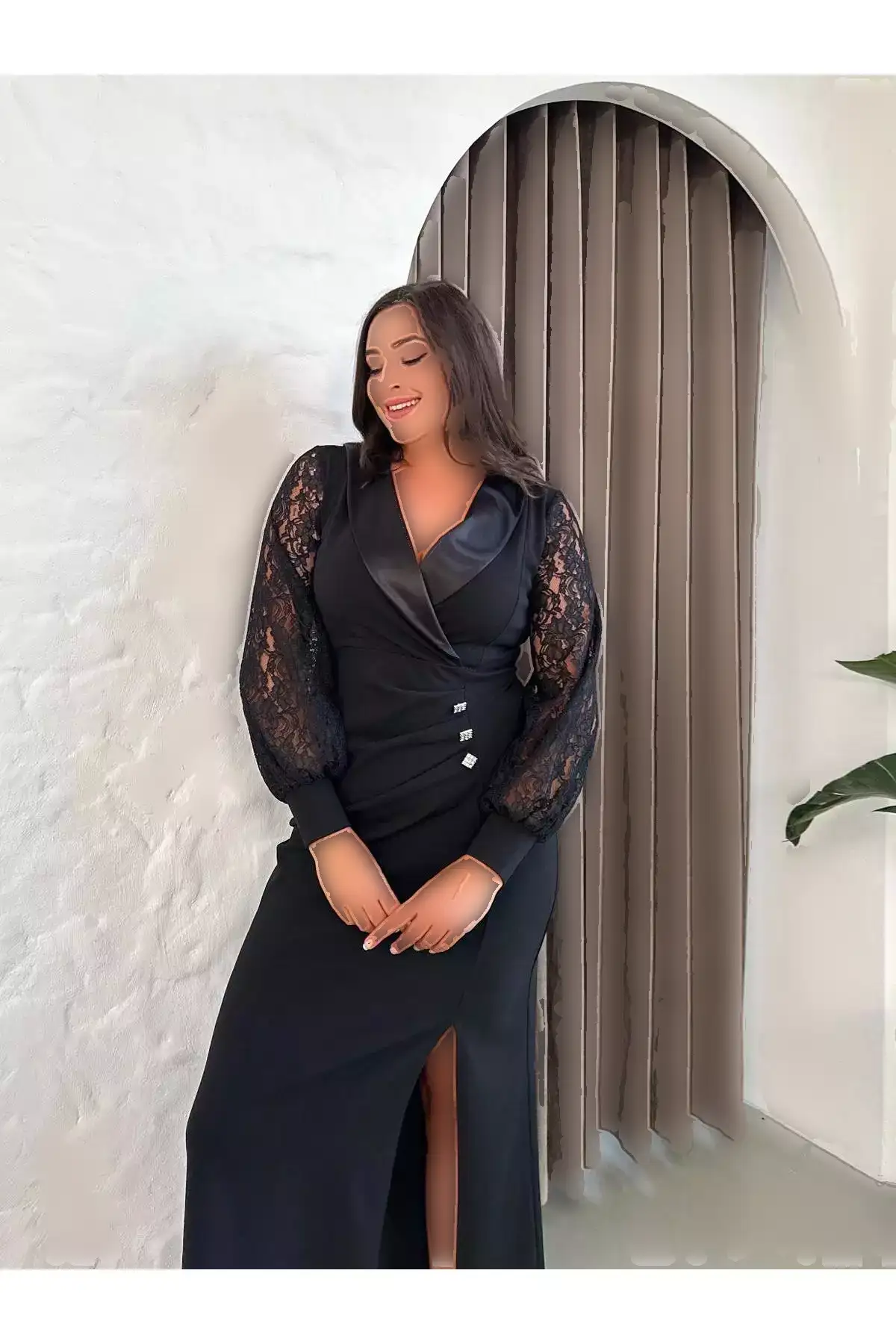 پیراهن بلند مجلسی زنانه با یقه ساتن و دکمههای جزئیاتدار، آستین بلند و شقاق، سایز بزرگ 24175 برند Butik Nilyam