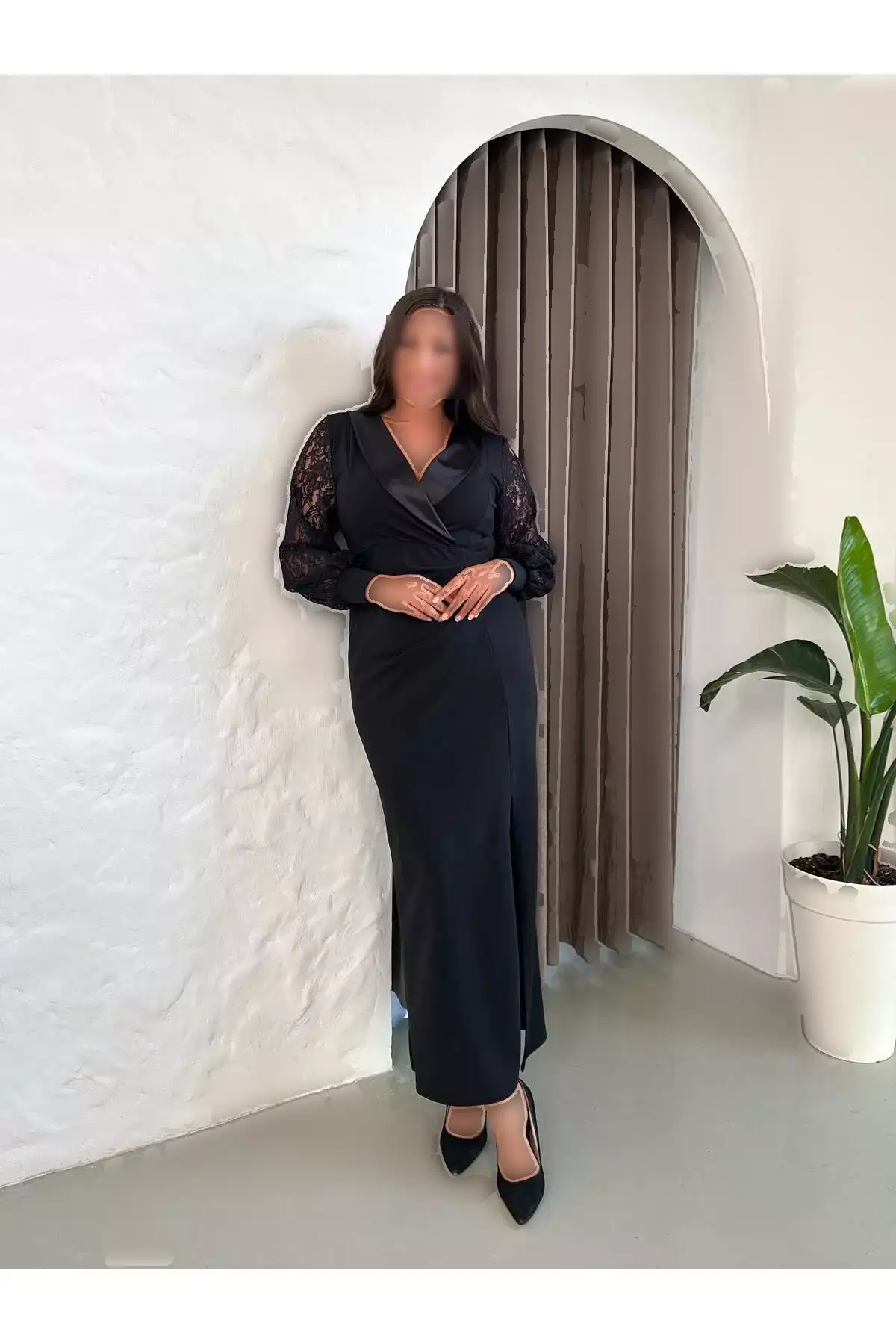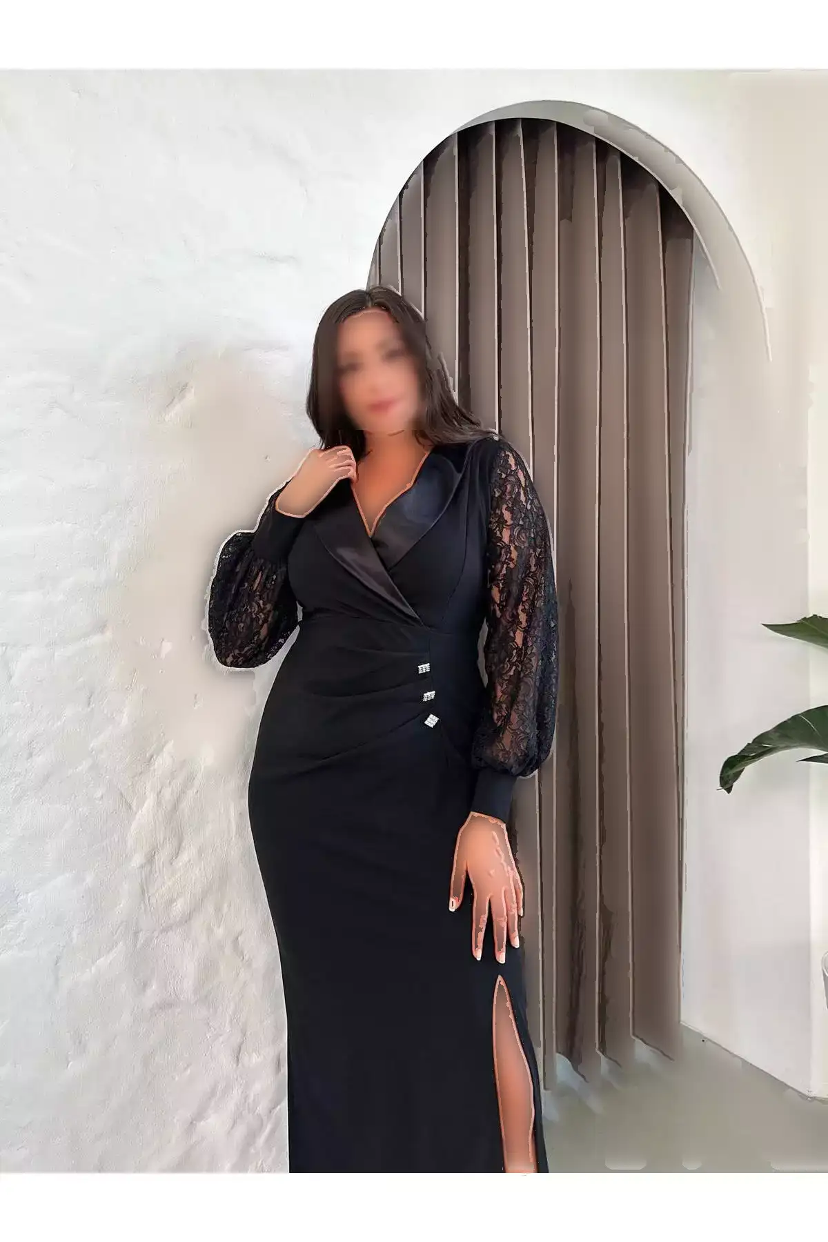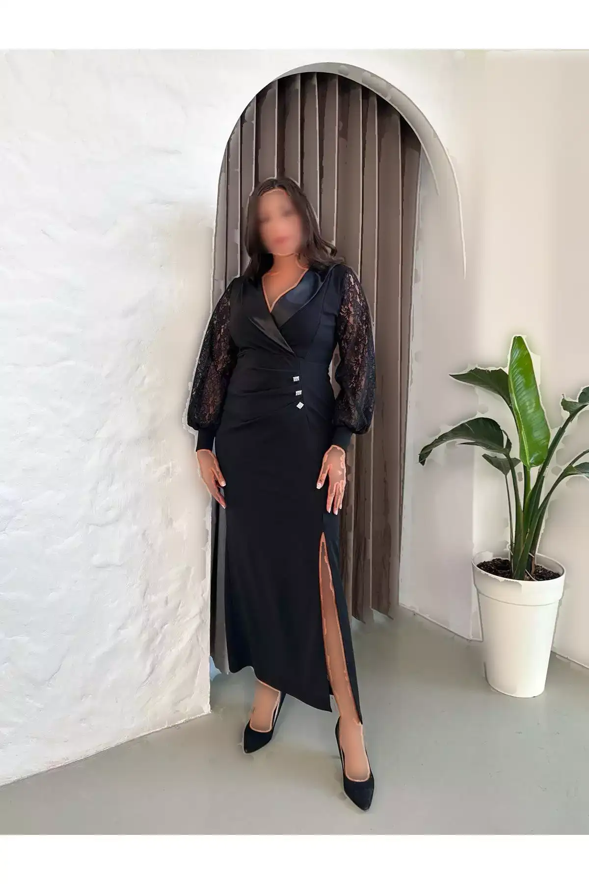 پیراهن بلند مجلسی زنانه با یقه ساتن و دکمههای جزئیاتدار، آستین بلند و شقاق، سایز بزرگ 24175 برند Butik Nilyam