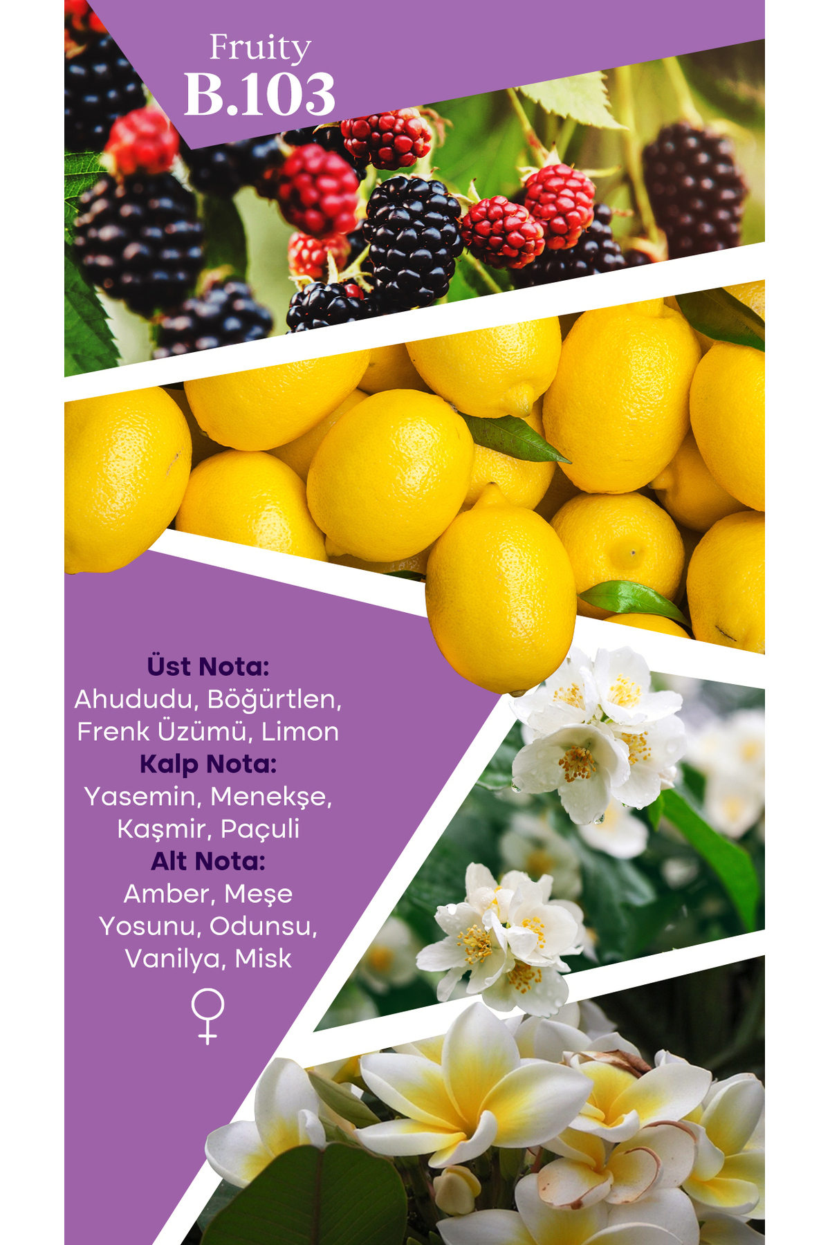 نتهای ابتدایی این عطر با طراوت و شادابی پرتقال و لیمو آغاز میشود، که به سرعت حس سرزندگی و نشاط را به کاربر منتقل میکند. در ادامه، قلب این عطر شامل گلهای لطیف و شیرین مانند یاس و مگنولیاست، که به رایحه عطر عمق و دلنشینی میبخشد. این ترکیب گلها احساس رمانتیک و زیبایی را منتقل کرده و عطر را برای هر موقعیتی مناسب میسازد.