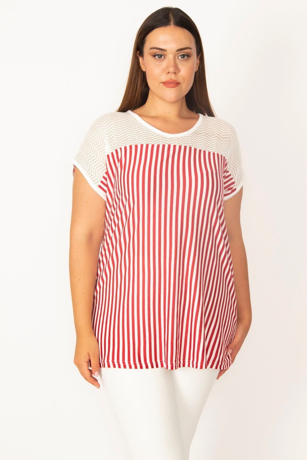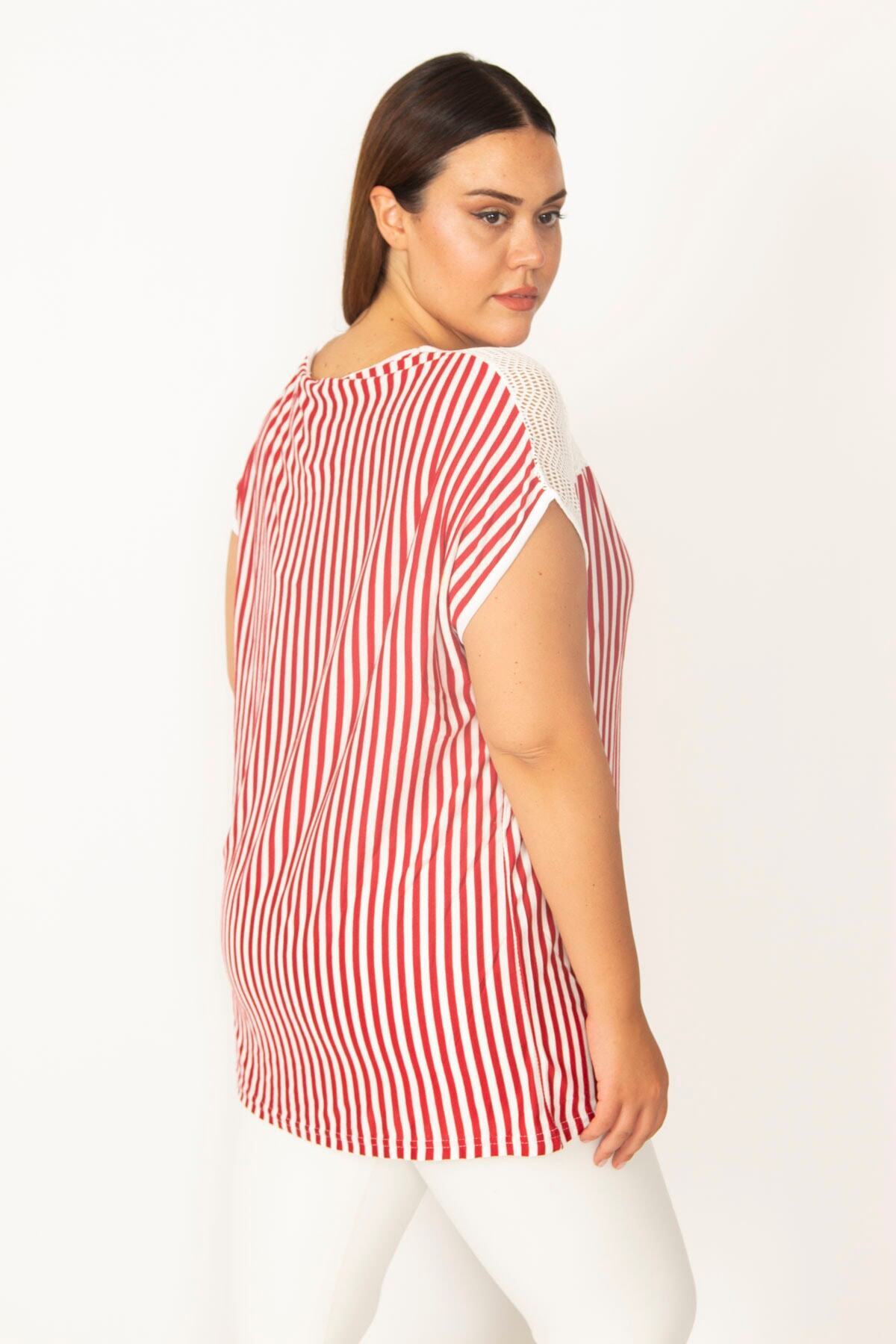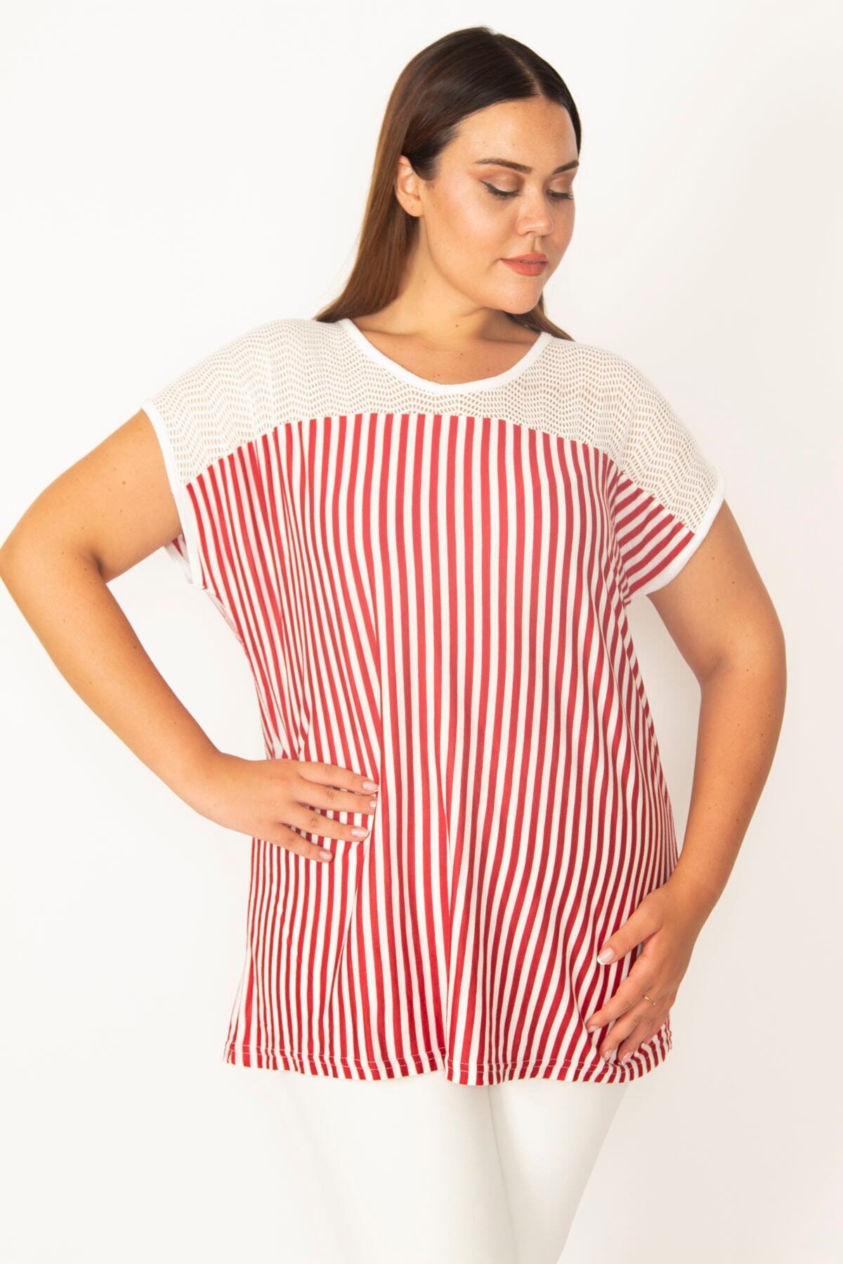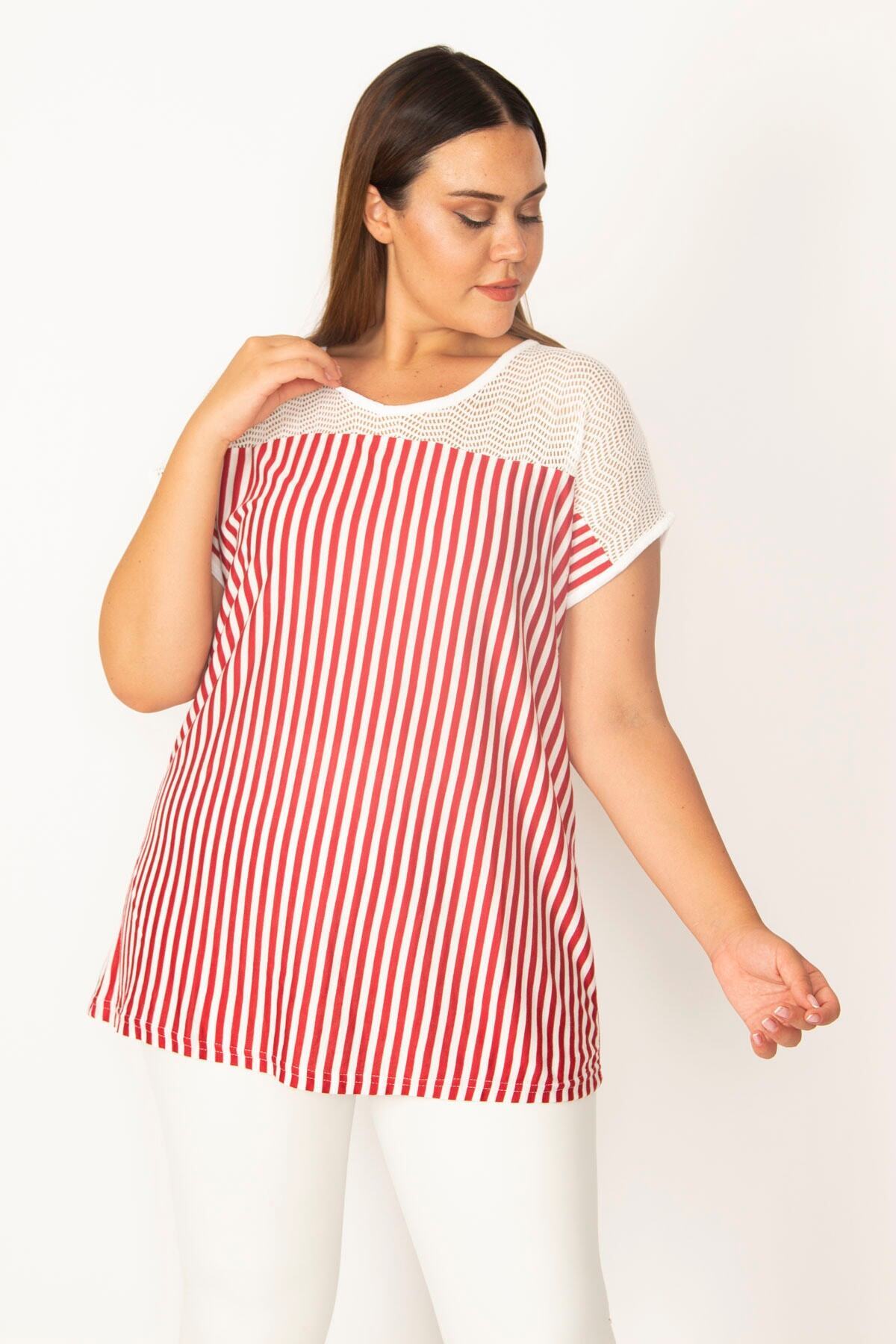 بلوز زنانه بزرگ سایز قرمز با دامن دانتل و آستین کوتاه، یک انتخاب جذاب و شیک برای بانوانی است که به دنبال کمبینی از راحتی و زیبایی هستند. این بلوز از جنس باکیفیت و نرم طراحی شده است و به واسطه دامن دانتل خود، ظاهری متنوع و جذاب خلق میکند. رنگ قرمز آن به طور طبیعی حس شادابی و انرژی را منتقل میکند و برای استفاده در موقعیتهای مختلف مناسب است.
