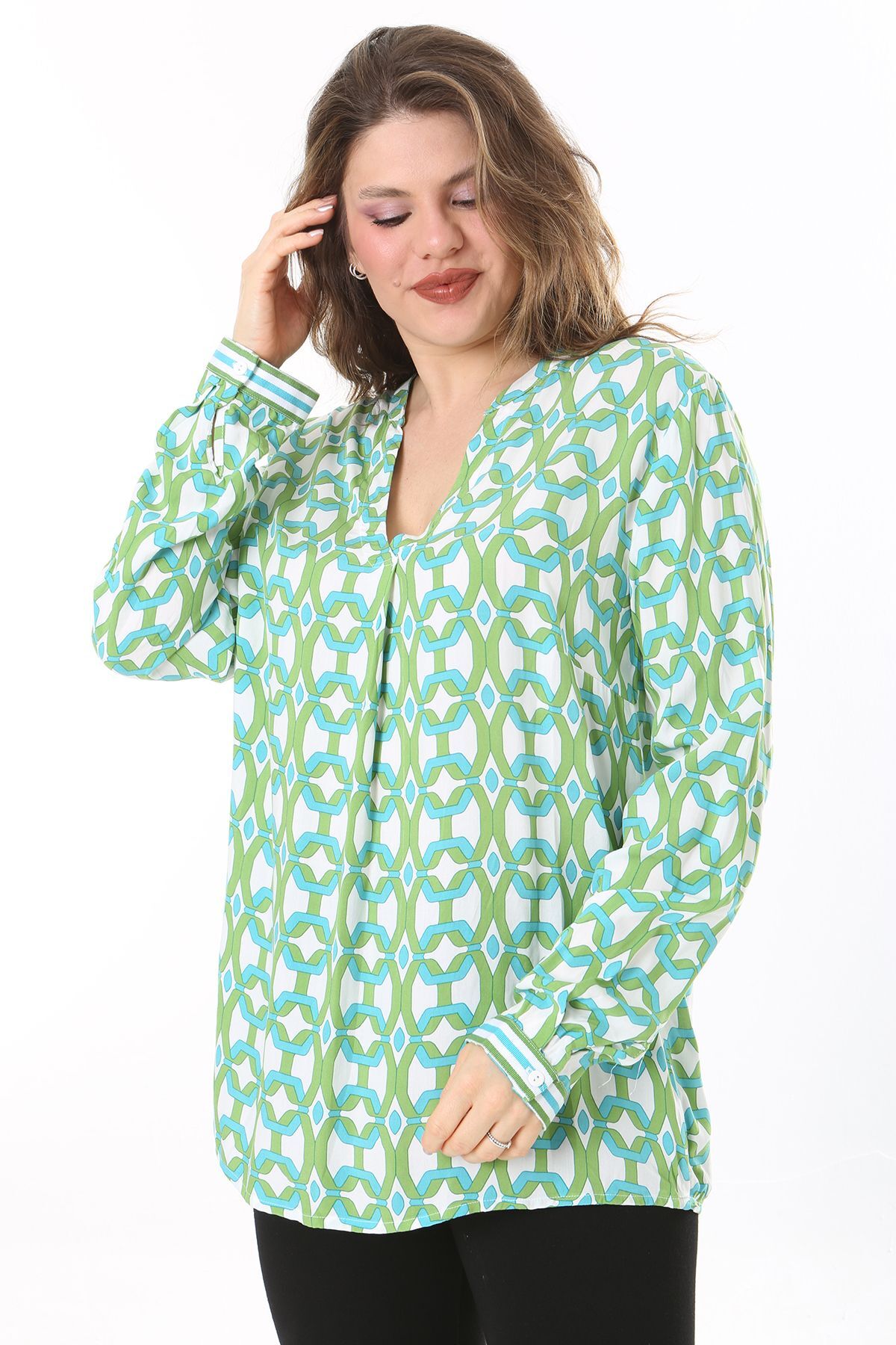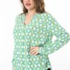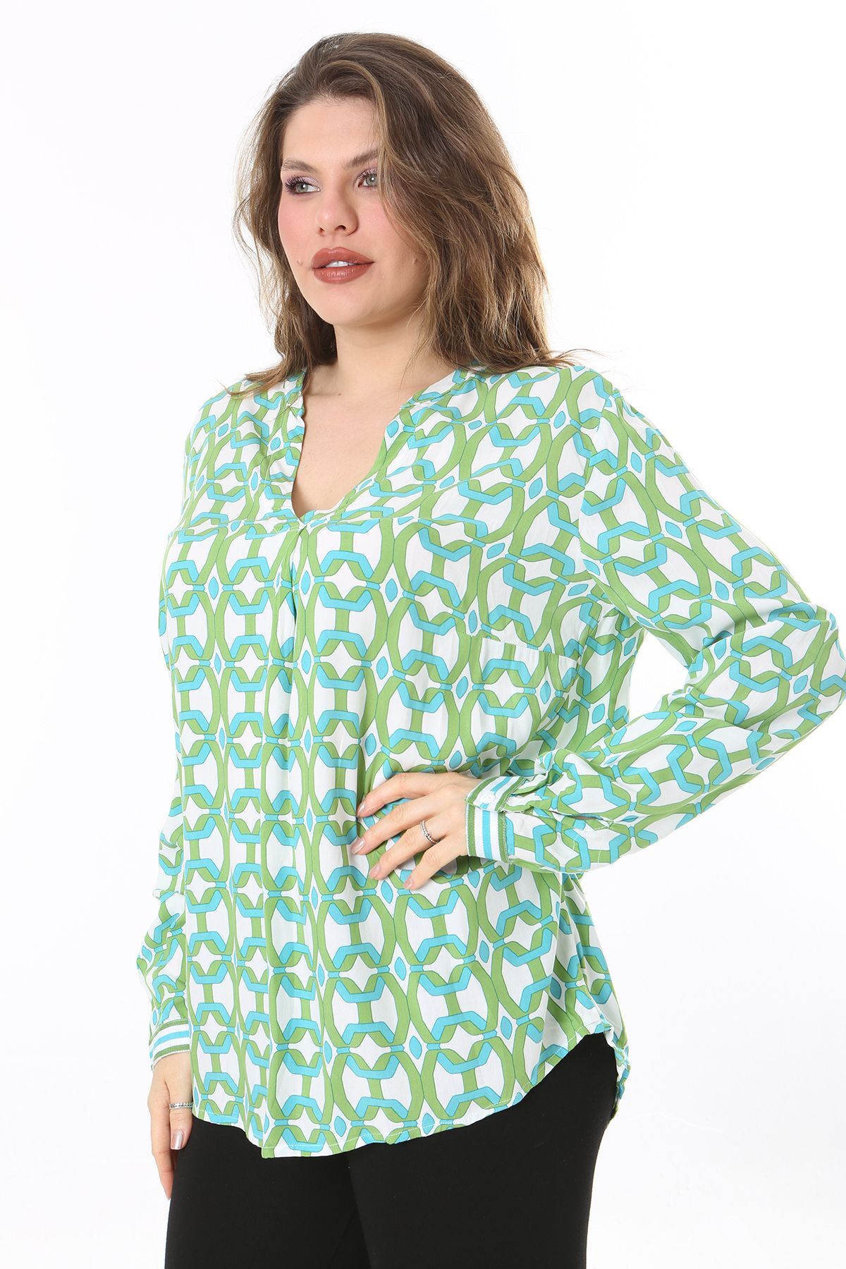 یقه V این بلوز طراحی زیبا و مدرنی دارد که به خصوص بر روی چهره و گردن تأکید میکند و باعث میشود ظاهری کشیده و خوشاندامتر به نظر برسید. این ویژگی به همراه سایز بزرگ آن، مناسب برای خانمهایی با سایزهای مختلف است و به راحتی میتوان آن را با سایر لباسها و اکسسوریها ست کرد.