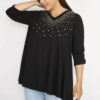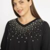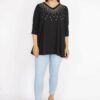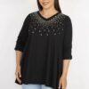 بلوز زنانه بزرگ سایز مشکی یک انتخاب عالی برای بانوانی است که به دنبال طراحیهای شیک و راحت هستند. این بلوز با جزئیات سنگ دوزی زیبا، به هر لباسی حال و هوای خاصی میبخشد. رنگ مشکی، کلاسیک و قابل ترکیب با سایر رنگها و طرحهاست، که این ویژگی به شما این امکان را میدهد تا آن را با شلوار یا دامنهای مختلف به راحتی ست کنید.