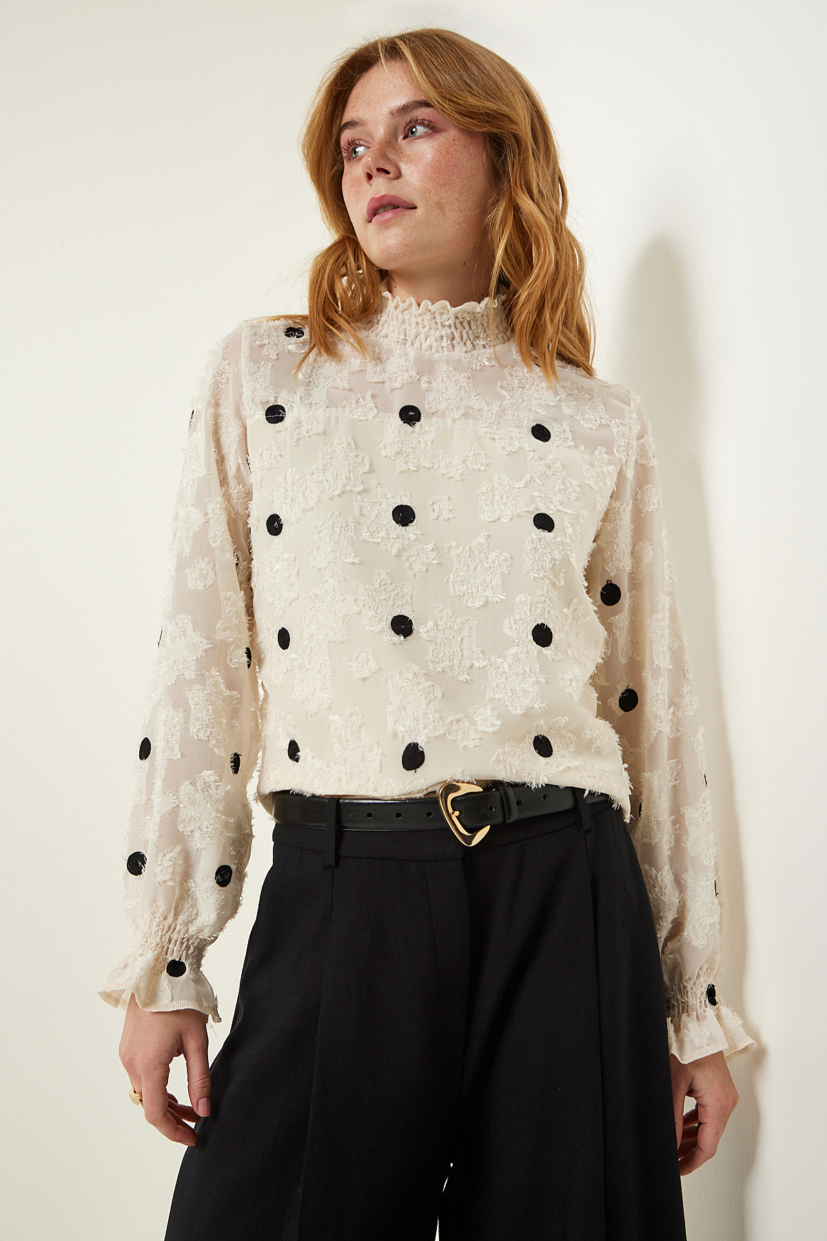 بلوز کرم بافته شده خالدار با کیفیت عالی و رنگ زیبا و طرح شیک و قیمت باورنکردنی ساخت برند Happiness İstanbul را از فروشگاه اینترنتی فیزا خریداری کنید.
