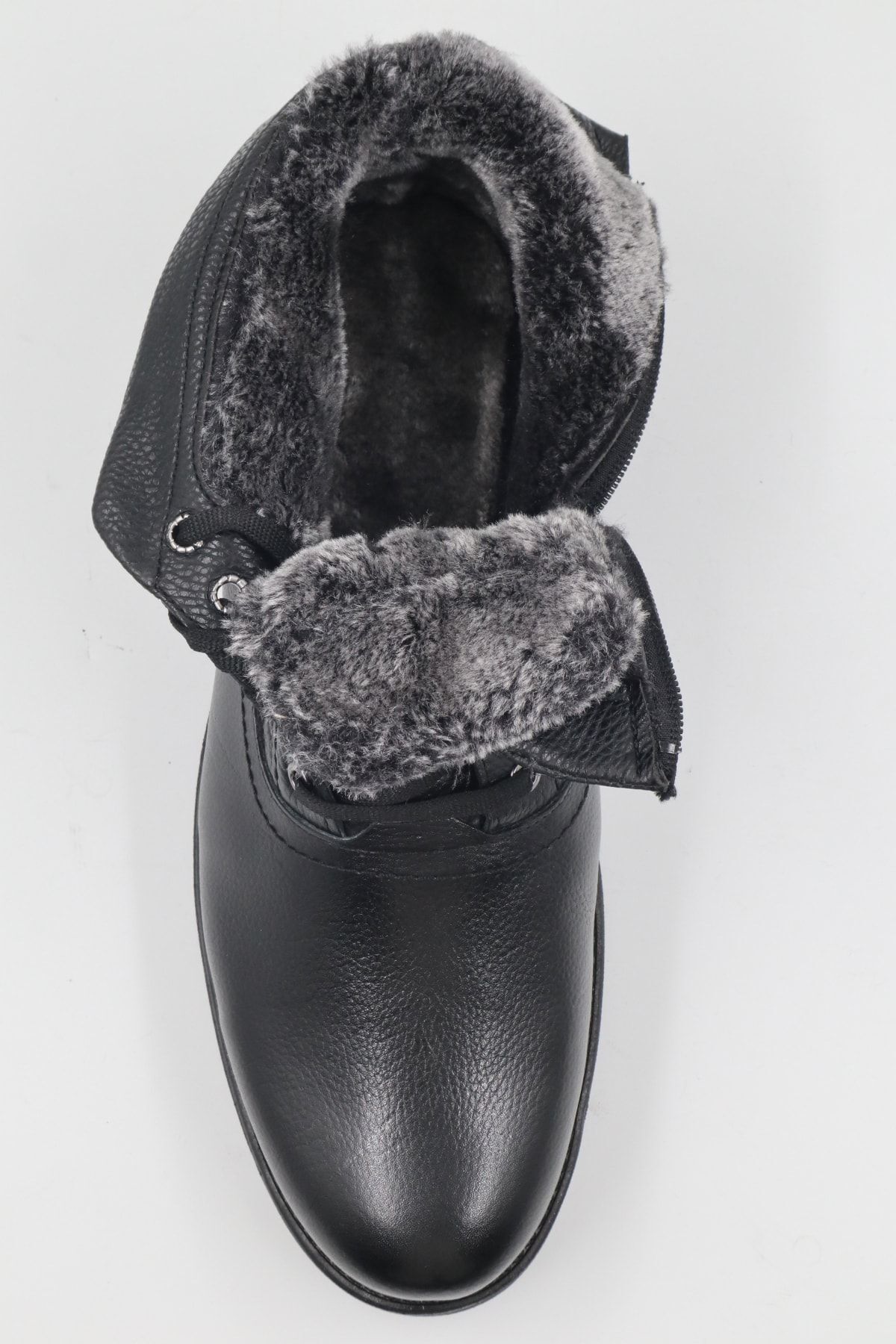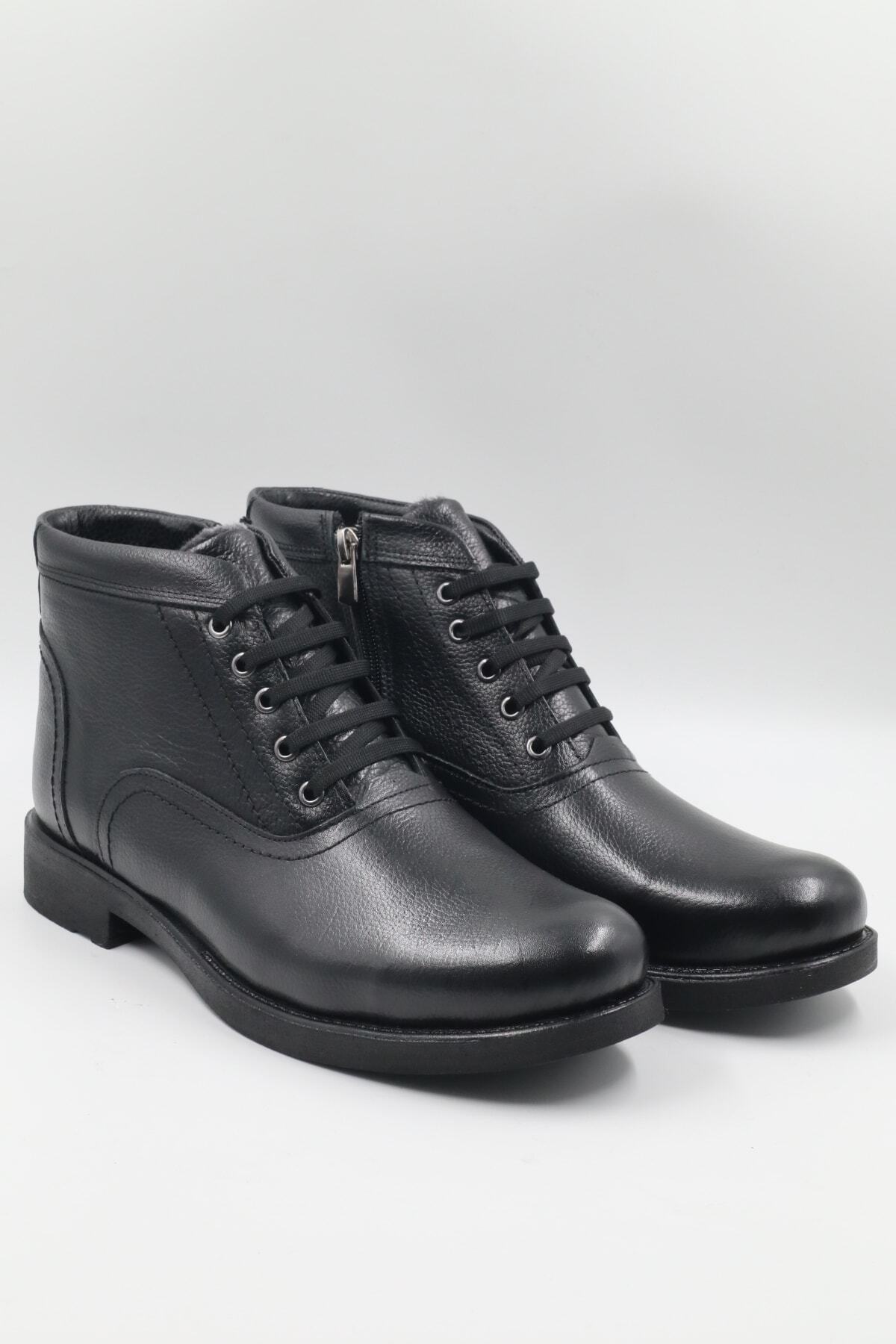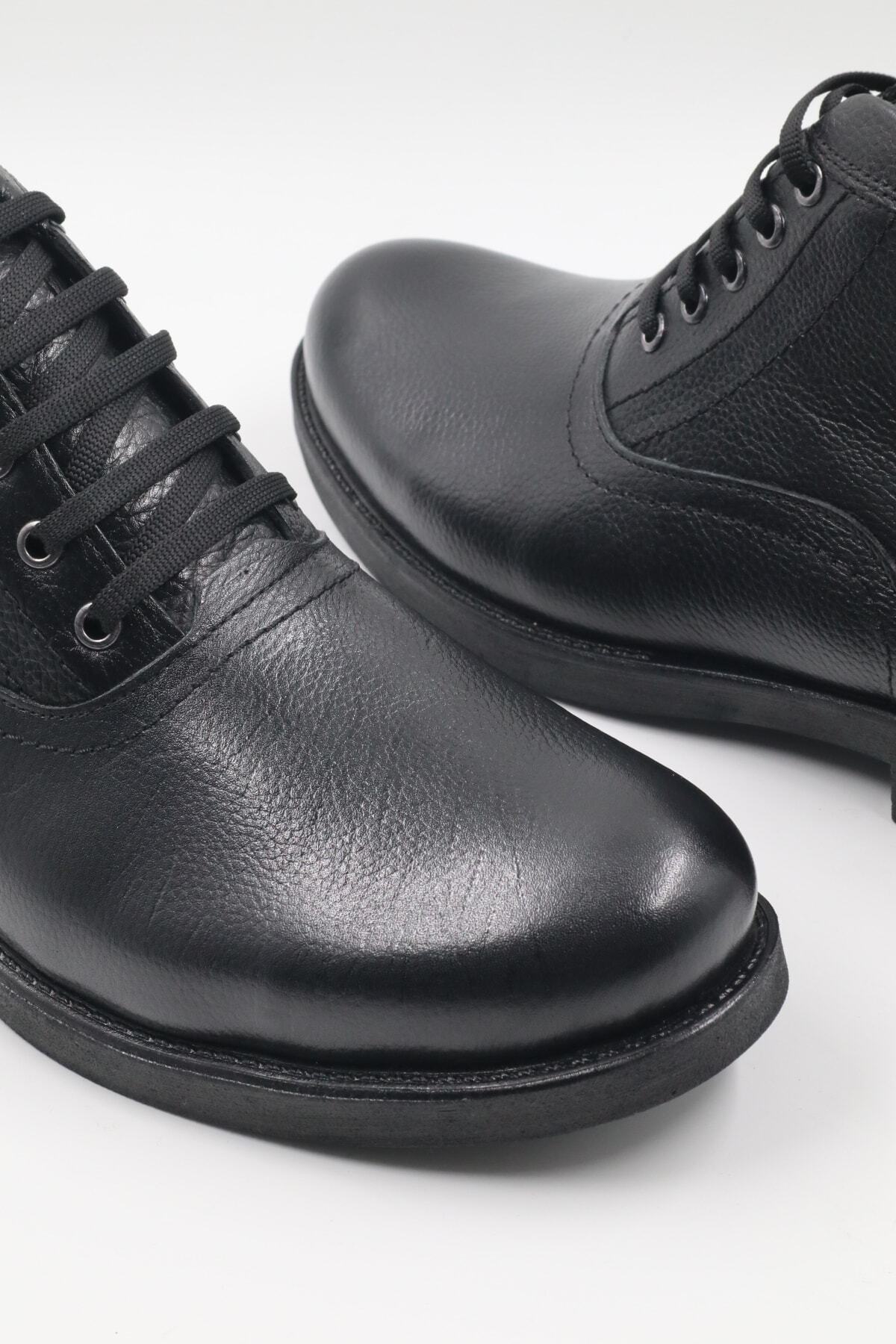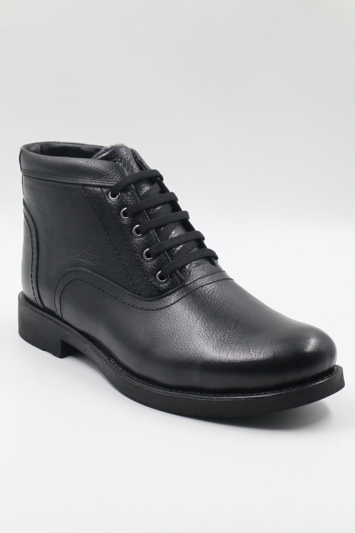 بوت روزمره مردانه از جنس چرم طبیعی، مقاوم در برابر سرما، با زیره ضد لغزش و دارای بند، به رنگ مشکی. برند nazenintasarımlar