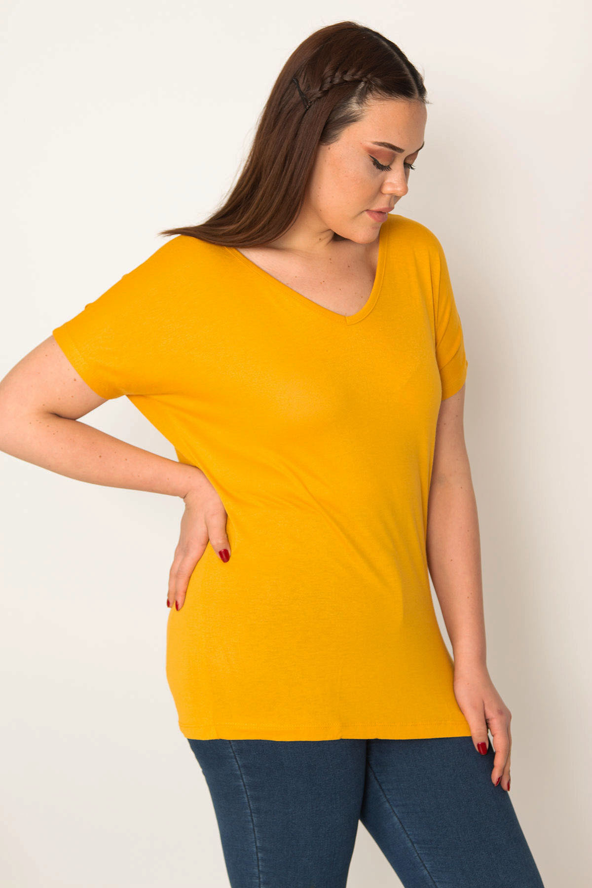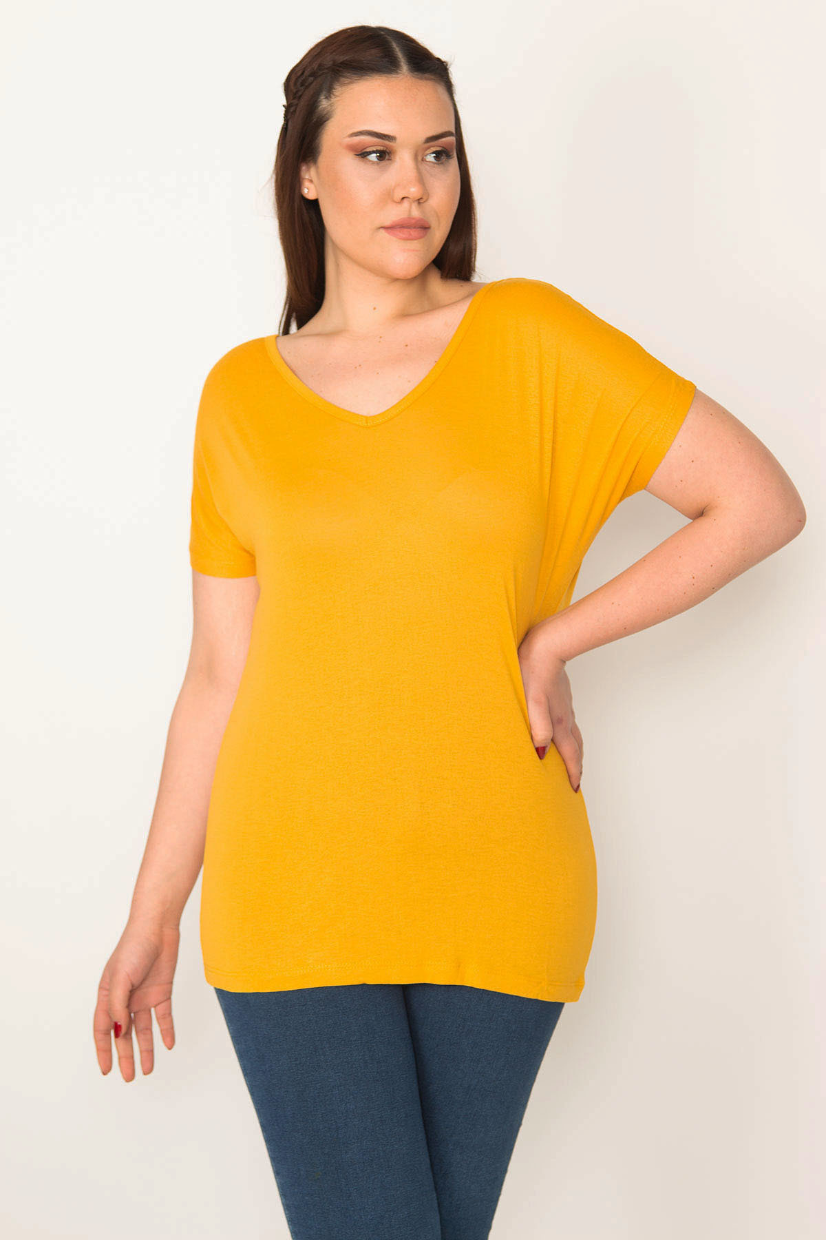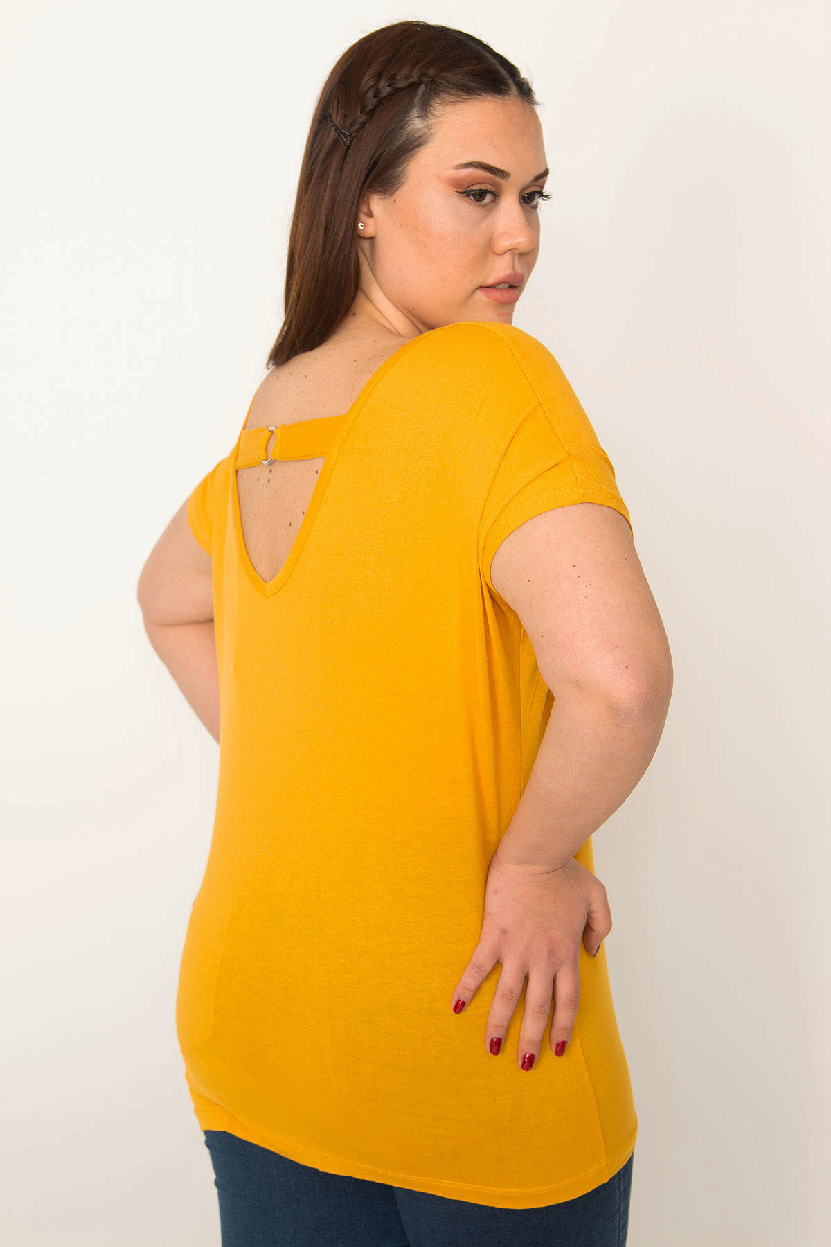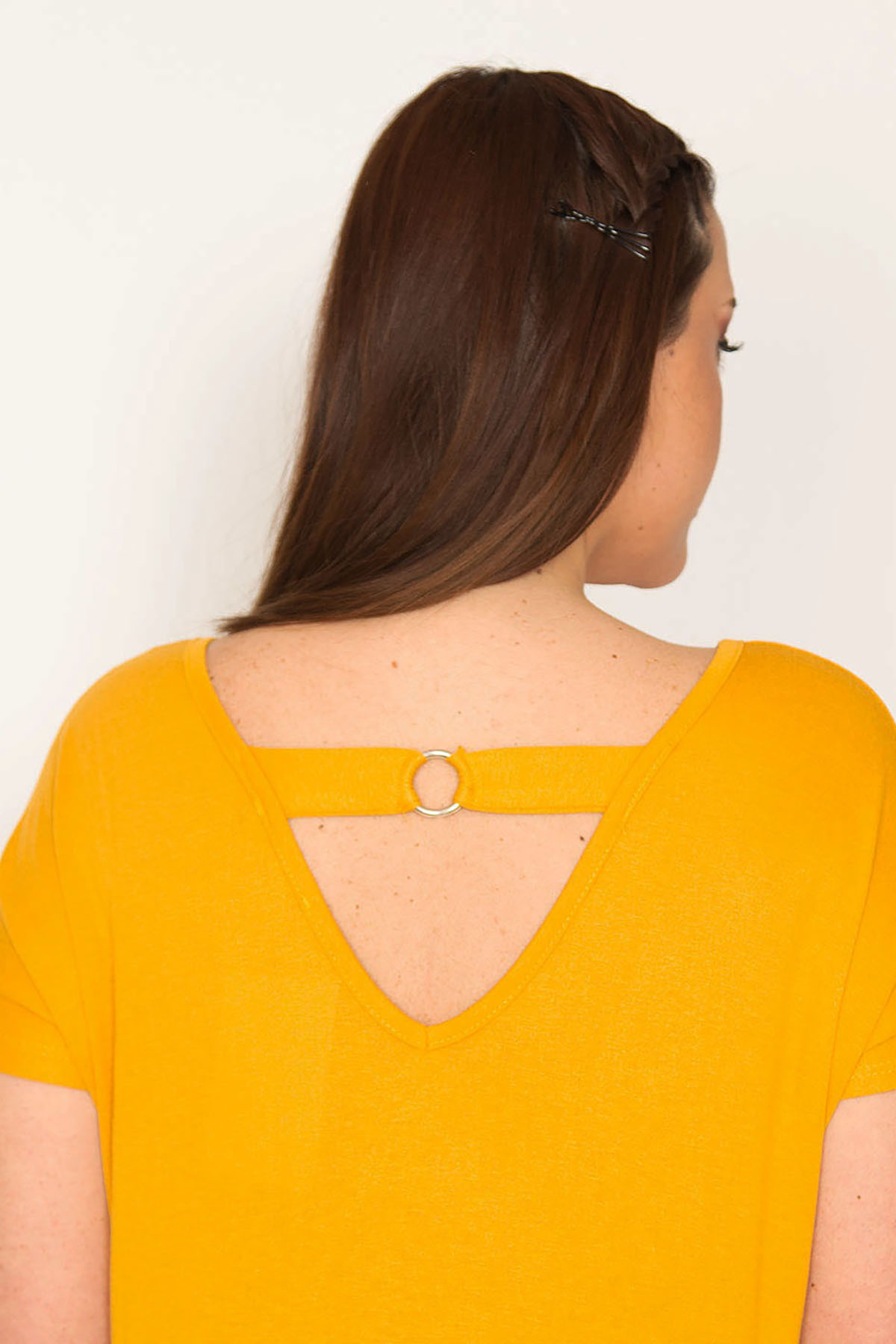 تُنیک زرد خردلی زنانه بزرگ با یقه باز در پشت. کد 1742229725