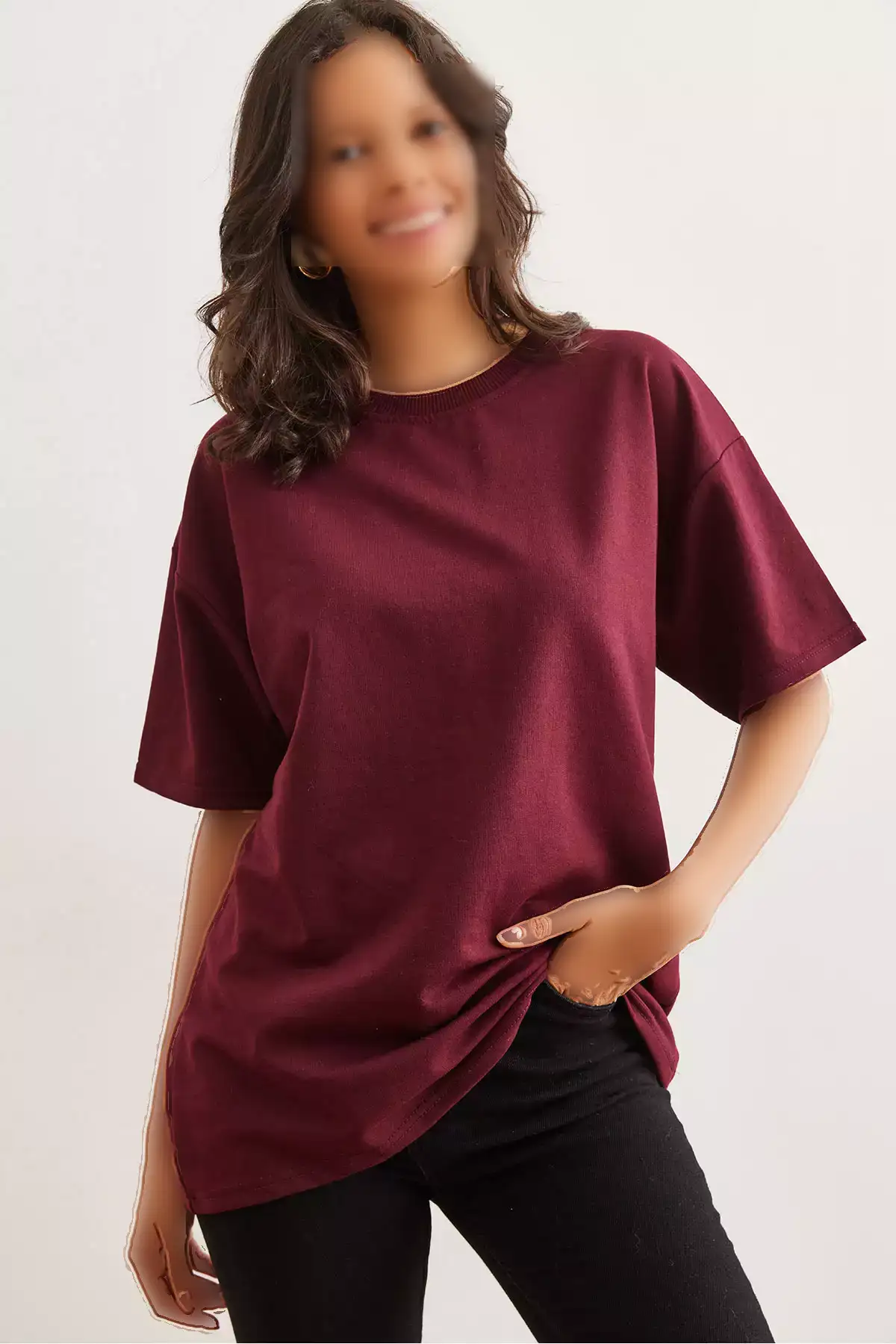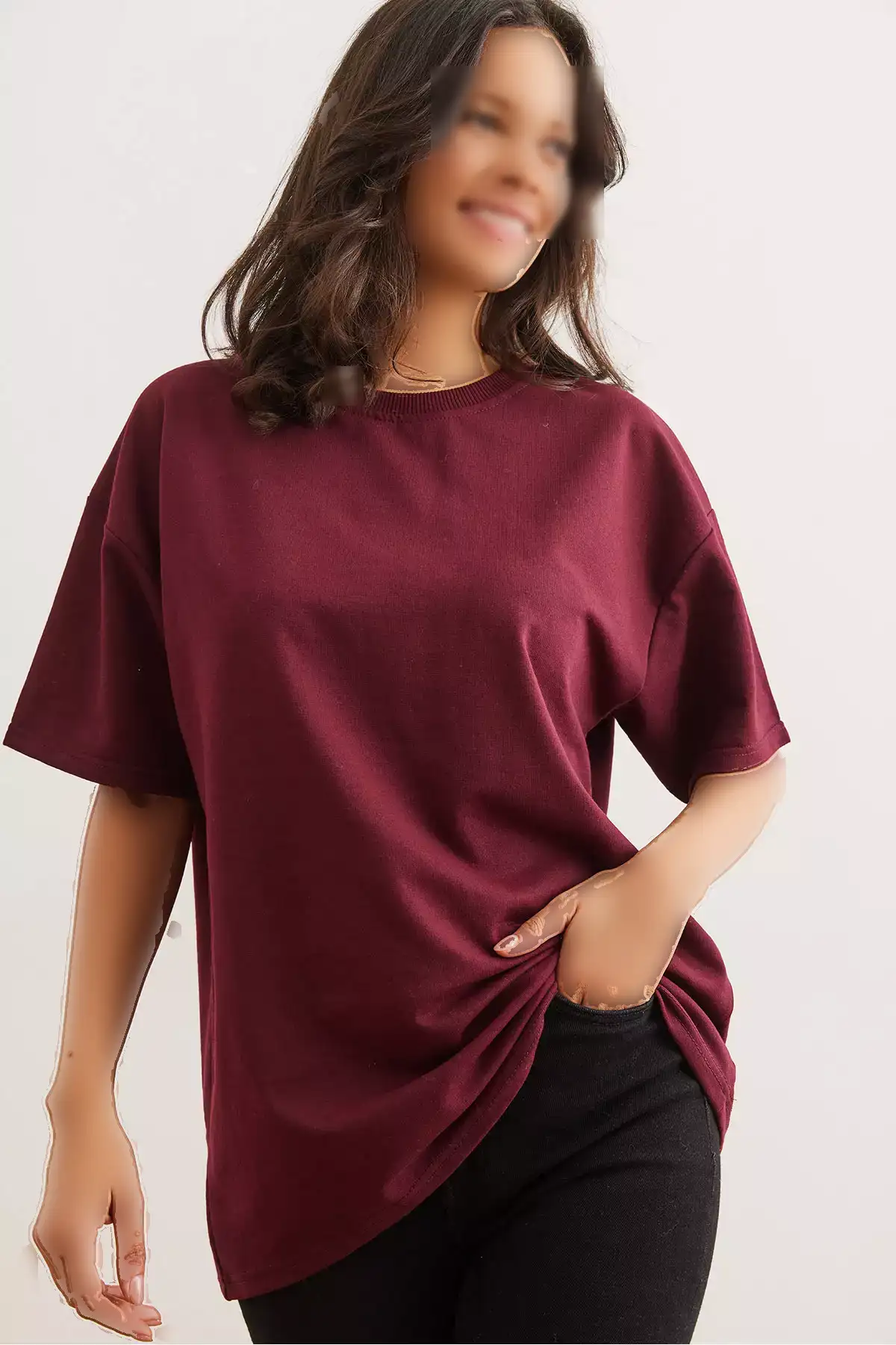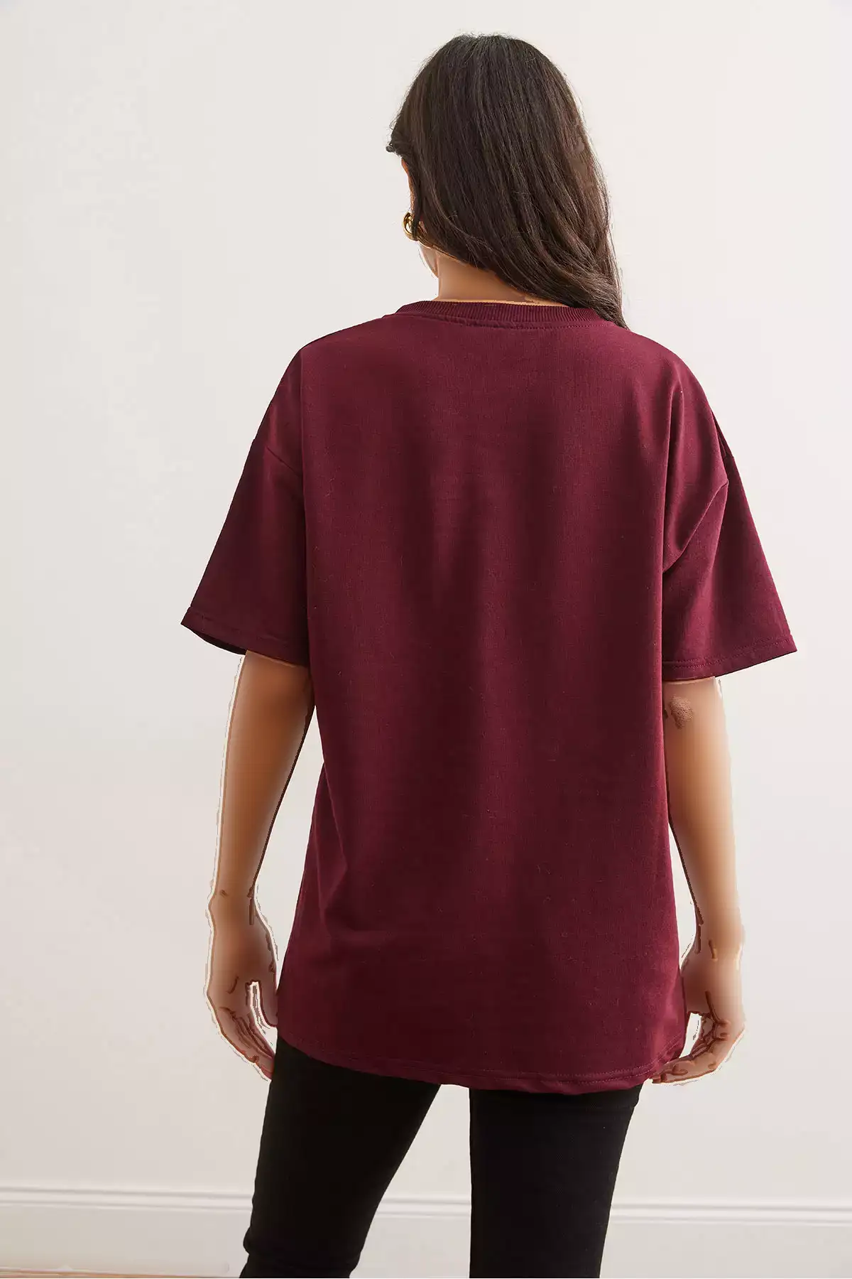 تیشرت اورسایز یکنواخت زنانه با طرح چاپی جلو و پشت به رنگ Bordeaux (بوردو) دو نخ TSH-19000696 برند Olalook