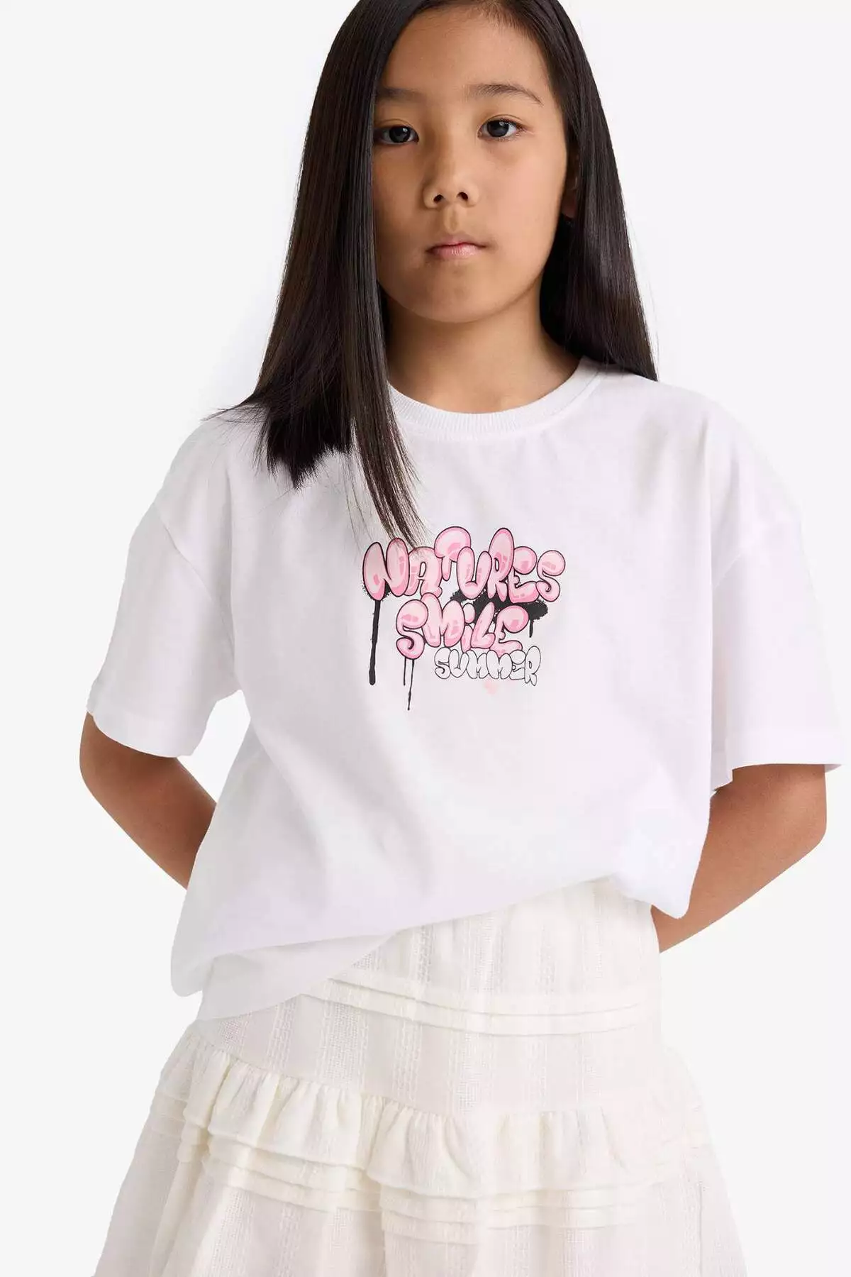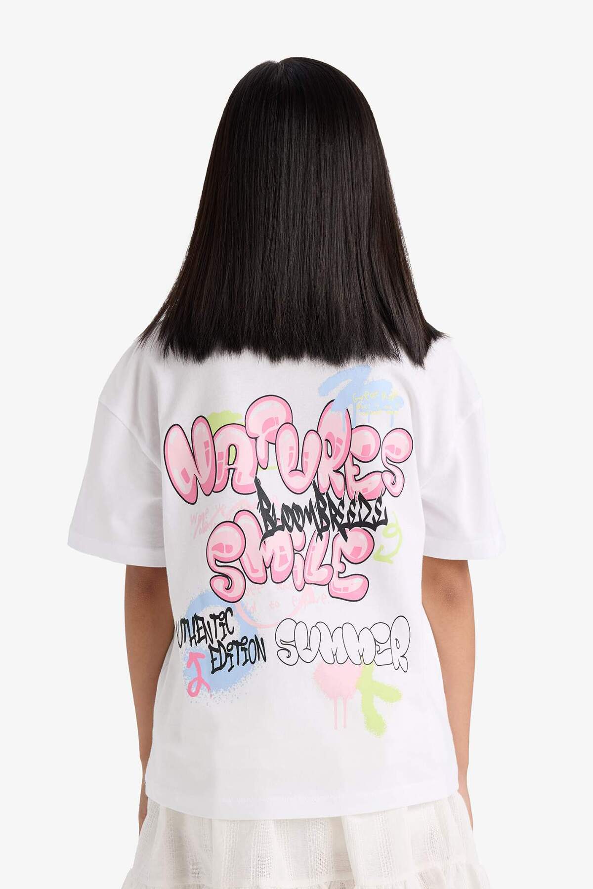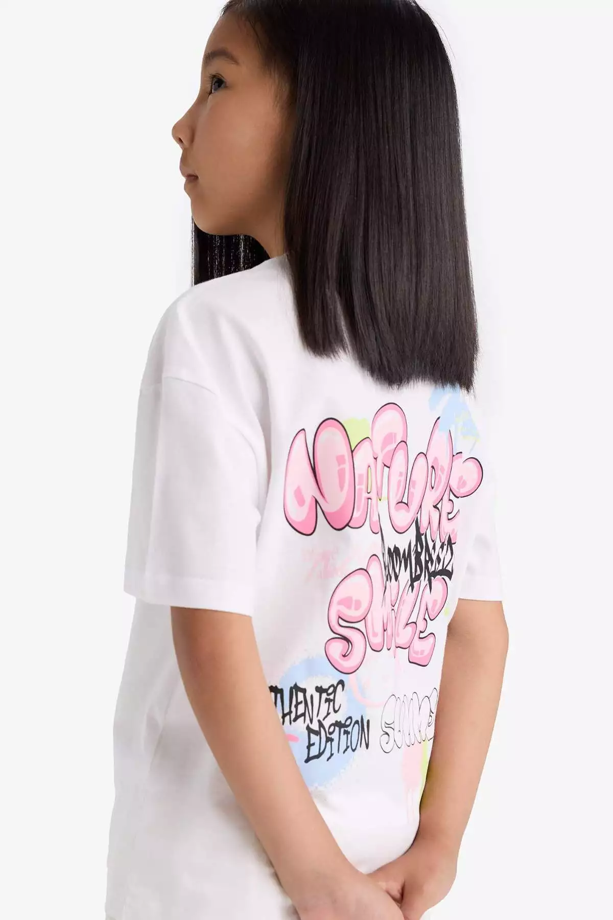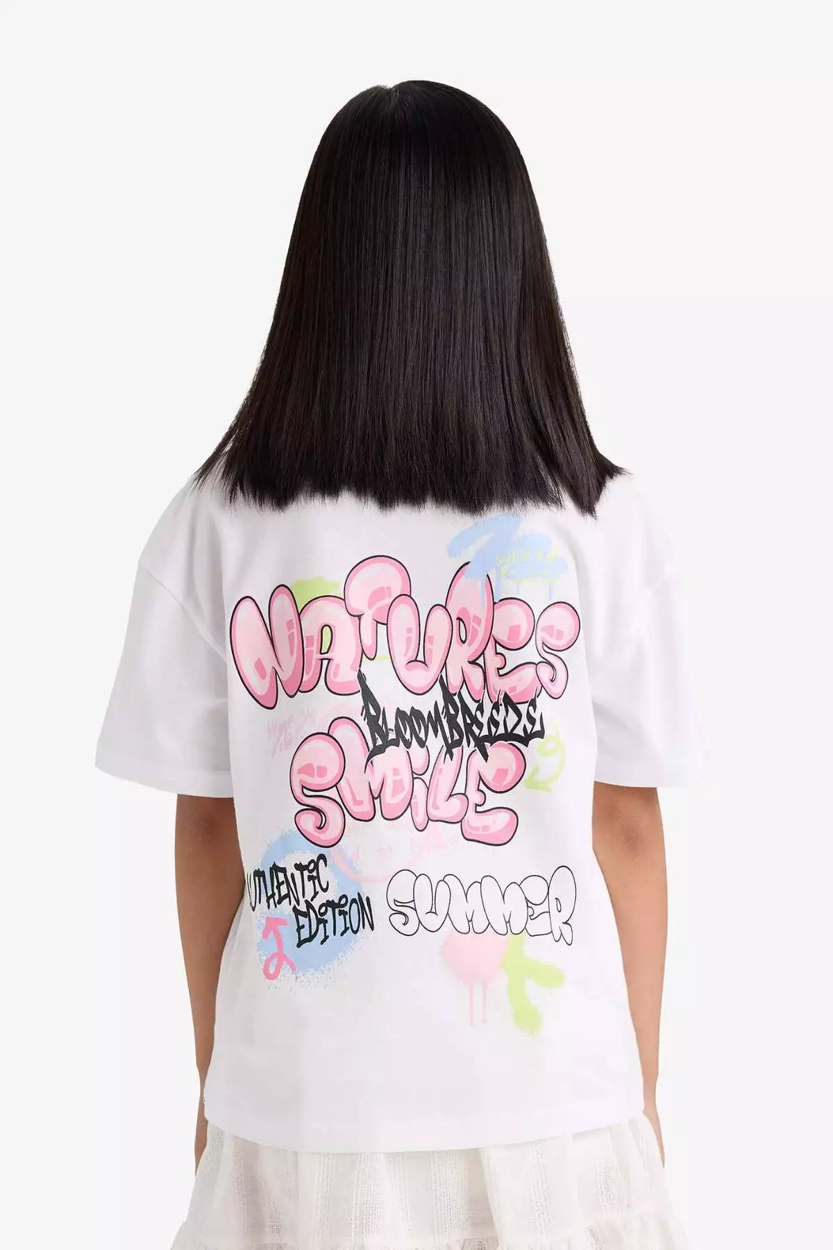 تیشرت دخترانه آستین کوتاه و گشاد با یقه گرد و چاپ پشت E0367A825SM برند Defacto