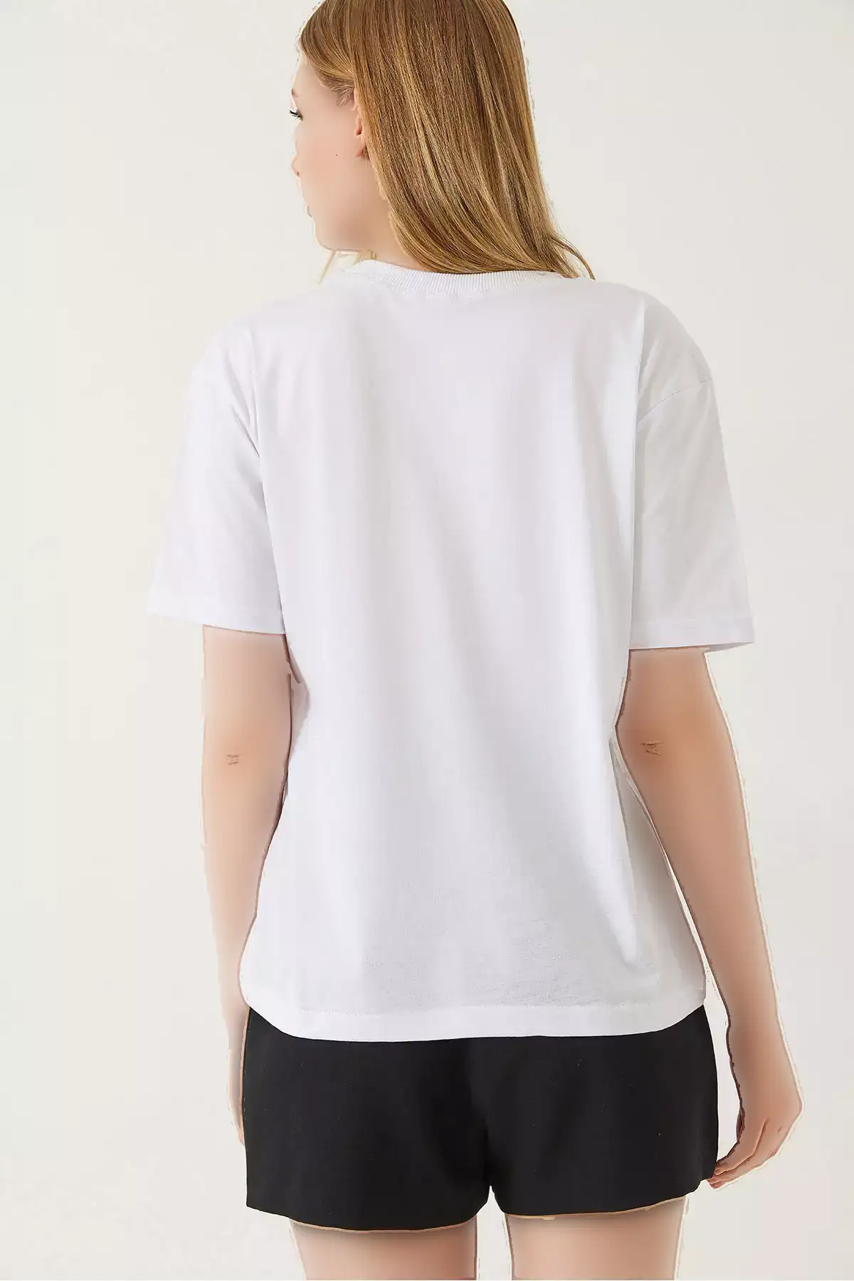 رنگ سفید پایه این تیشرت به راحتی با سایر لباسها و اکسسوریهای شما ست میشود و به شما کمک میکند تا متنوعتر لباس بپوشید.