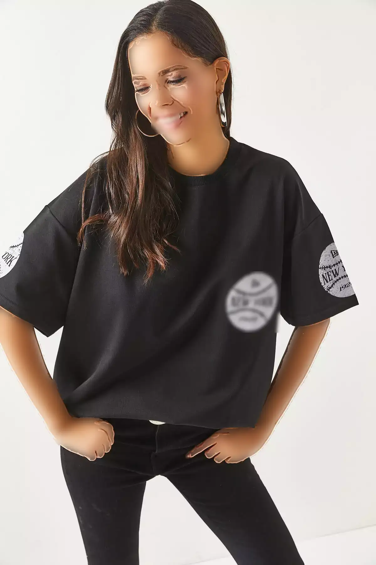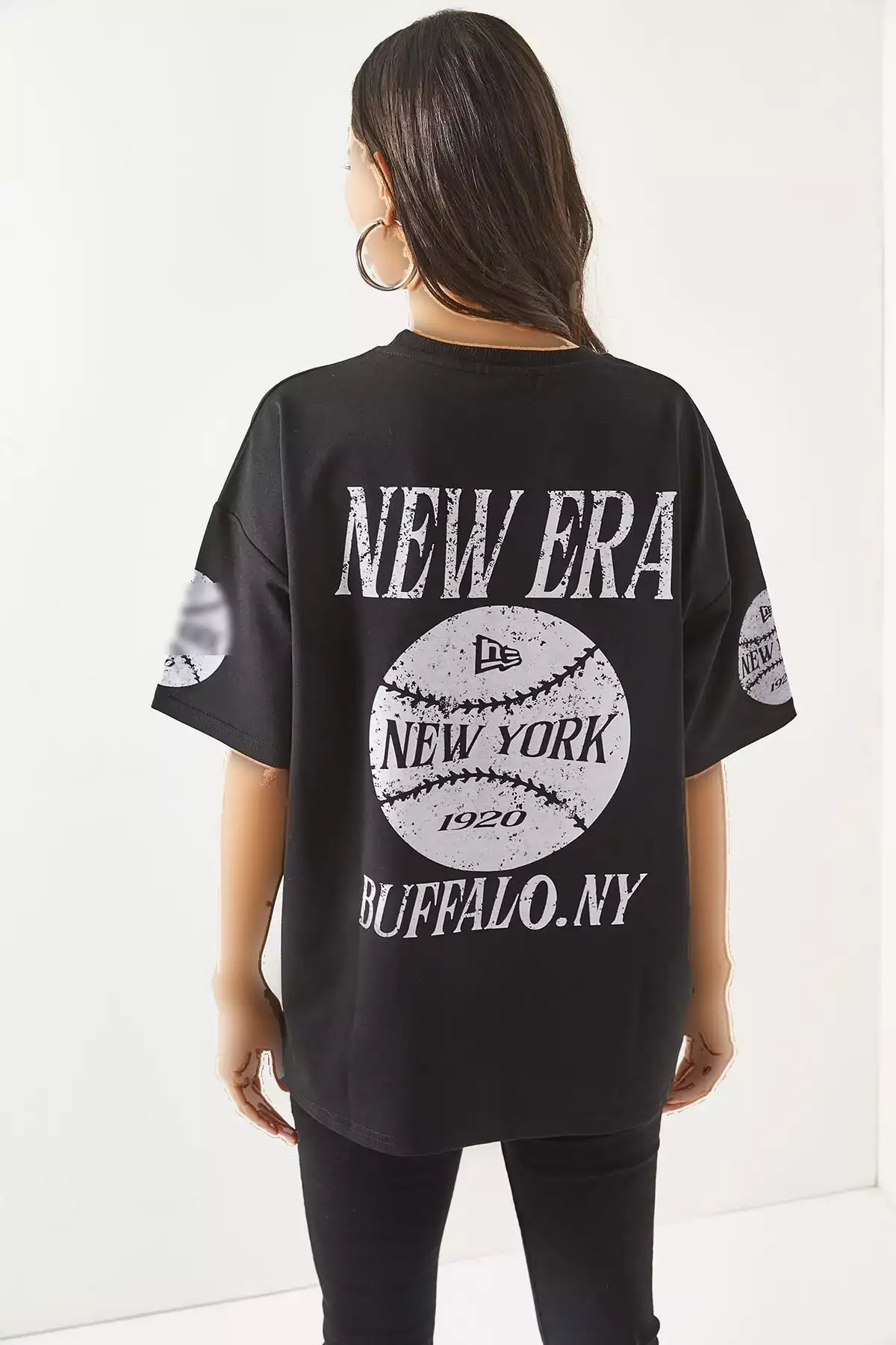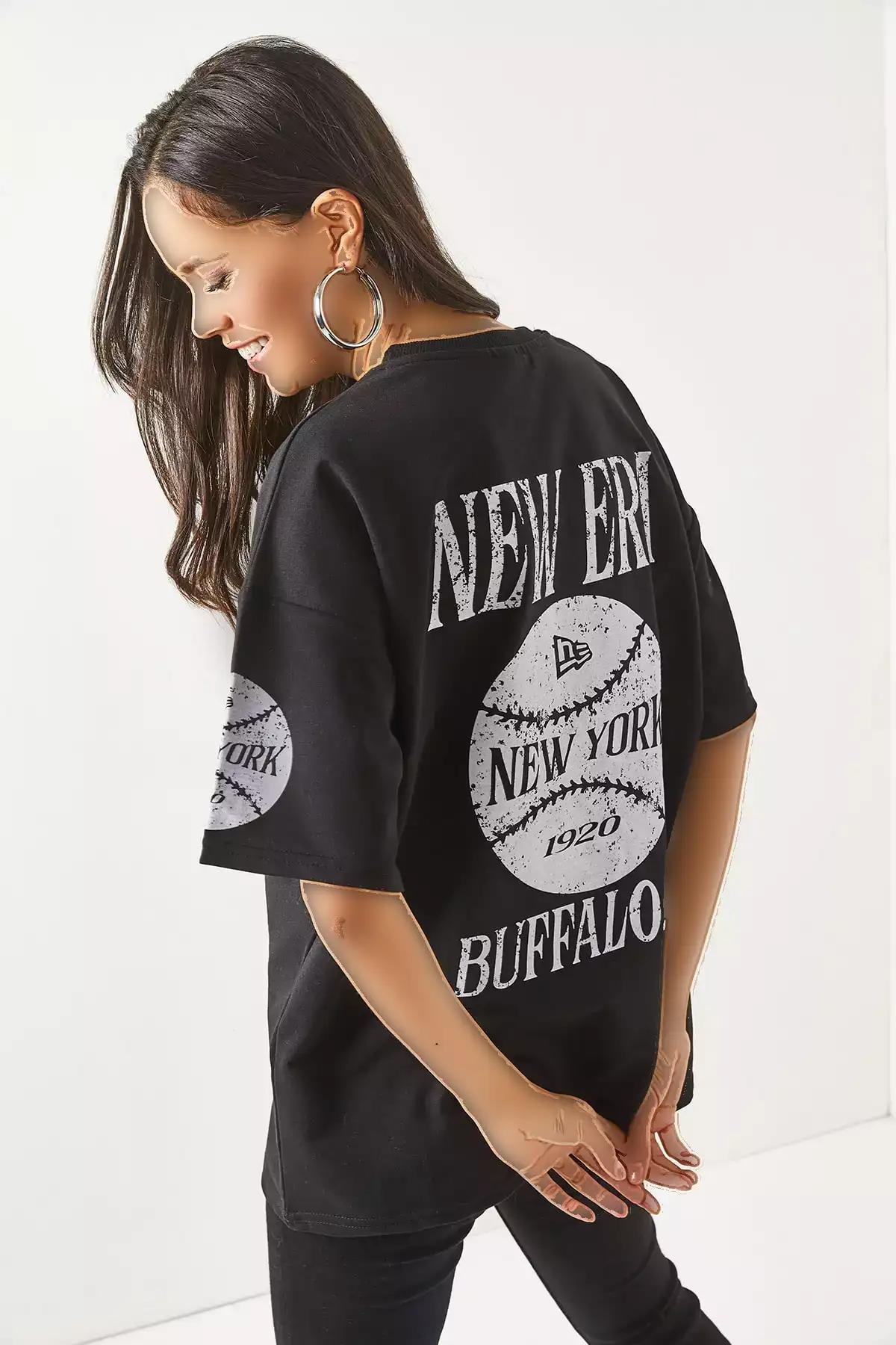 تیشرت زنانه نیویورک سیاه با چاپ جلو و عقب، دو تیکه، مدل اورسایز برند Olalook