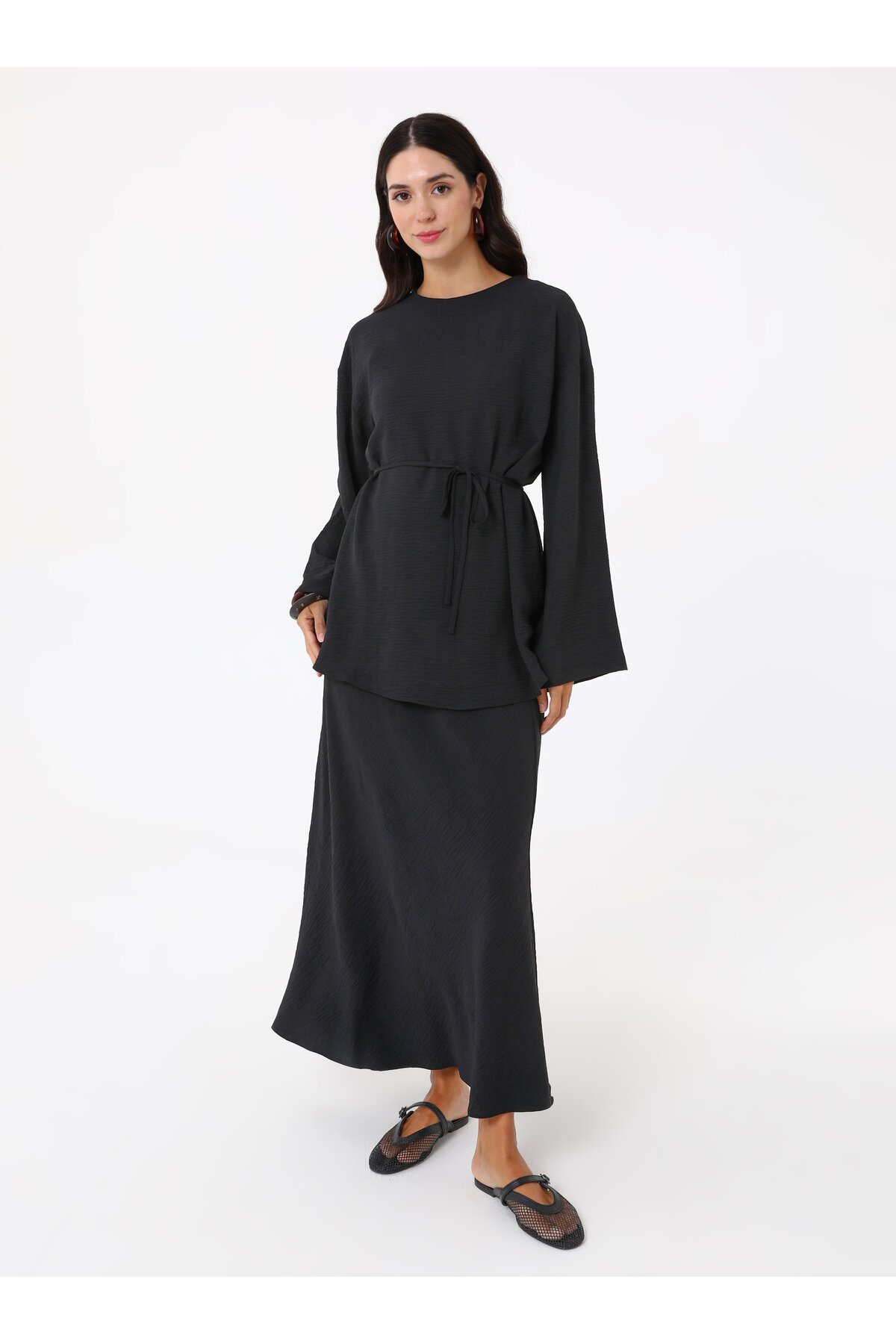 دامن ارائه شده در این ست، با جزئیات بند دار طراحی شده است که زیبایی و جذابیت خاصی به آن میبخشد. این دامن با توجه به طول آستین بلند تیشرت، ترکیبی فوقالعاده برای فصلهای مختلف میباشد.