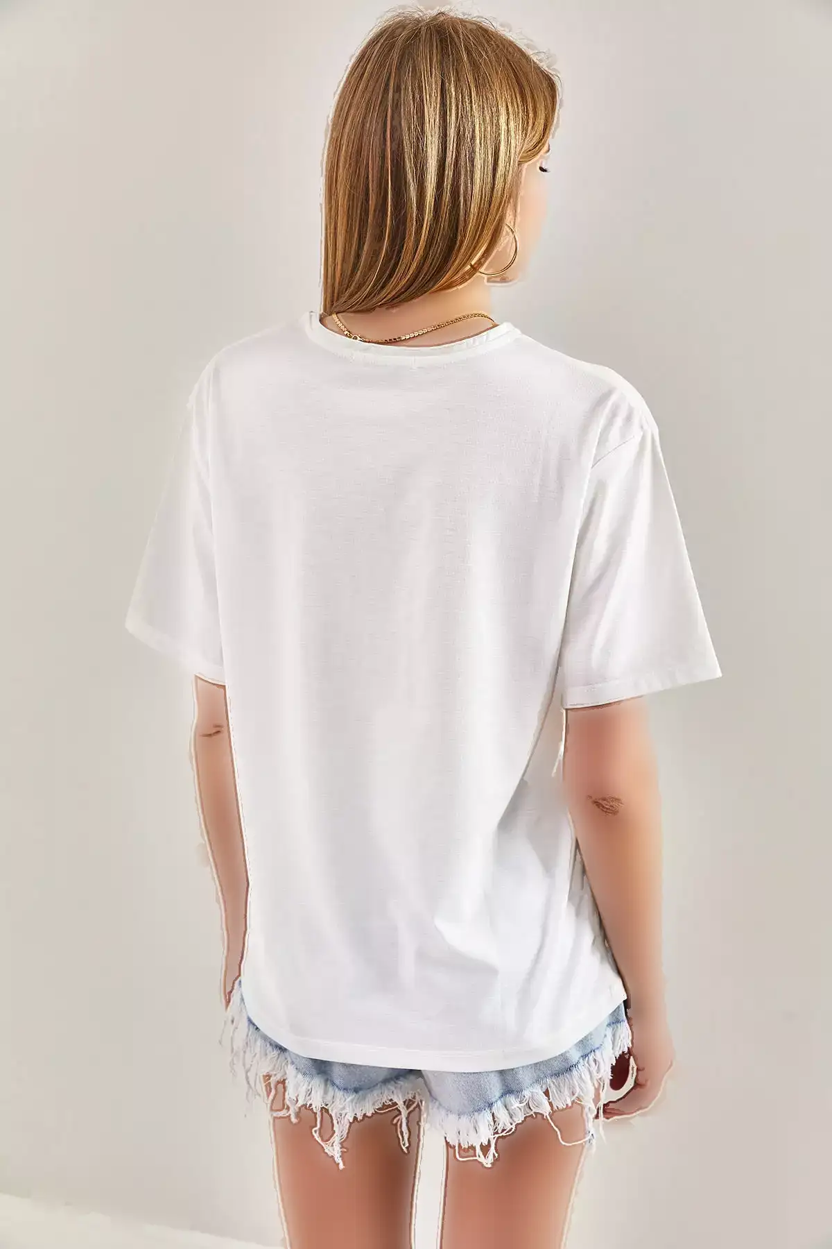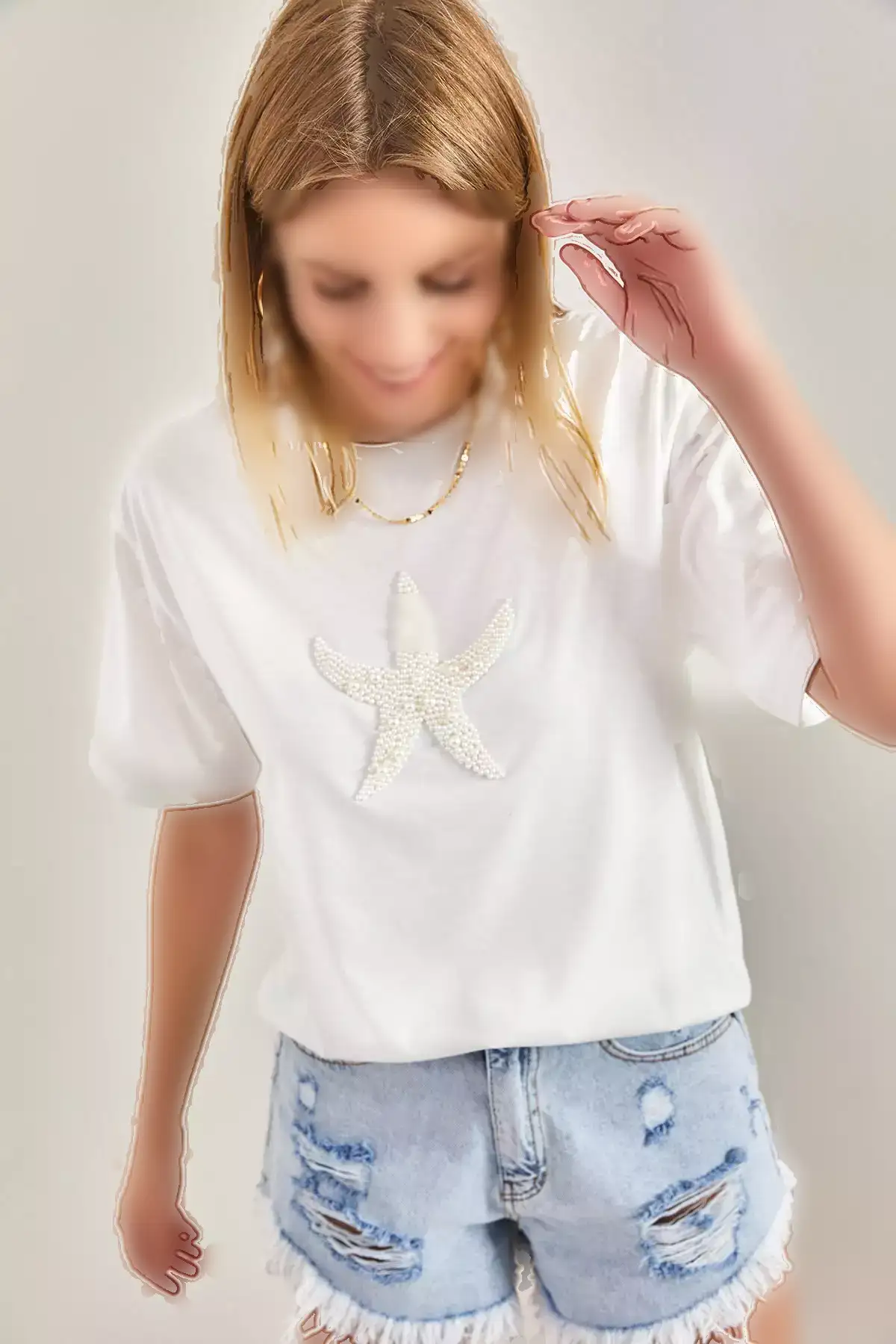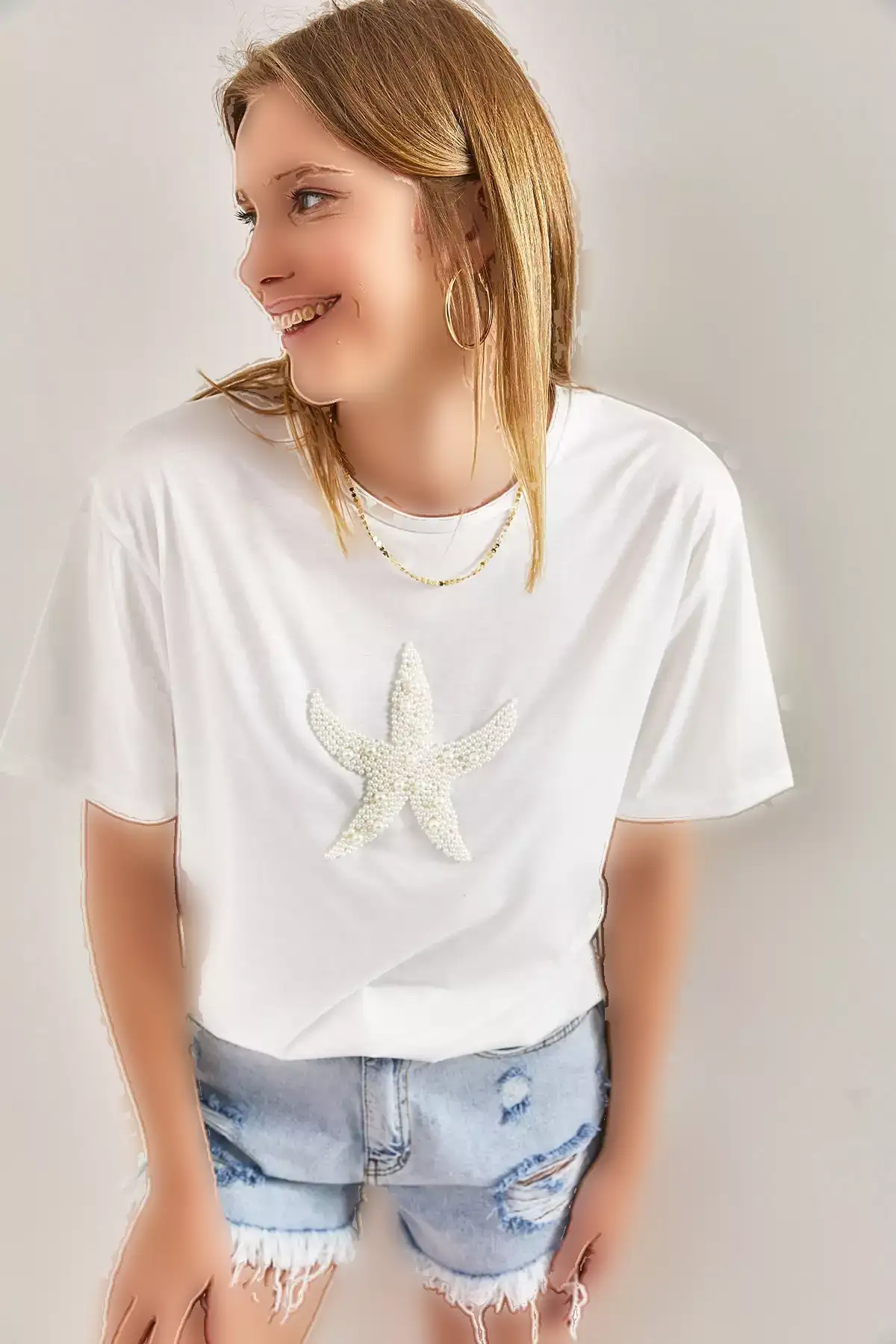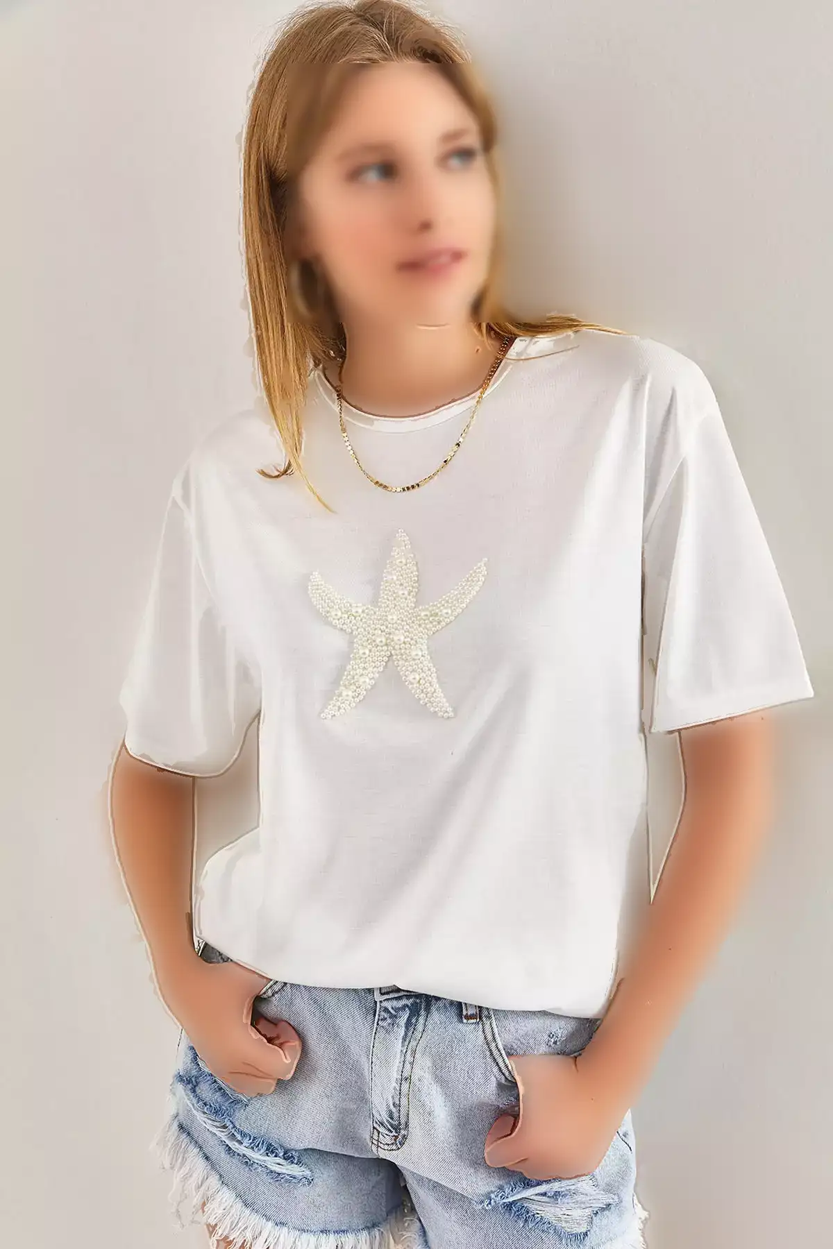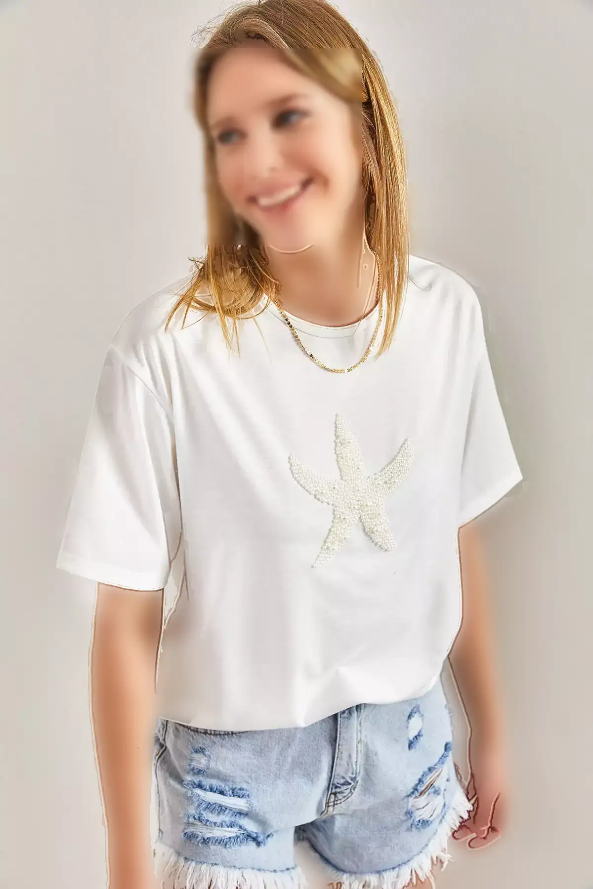 تی‌شرت پنبه‌ای با سنگ‌های تزئینی مروارید زنانه برند Bianco Lucci – 692163453