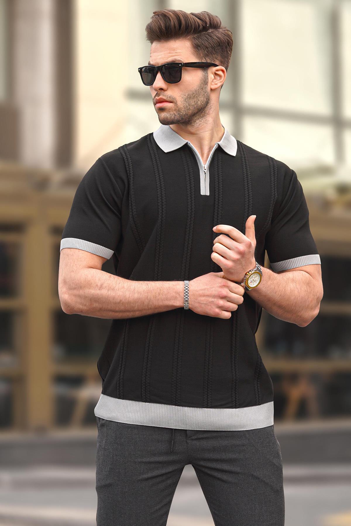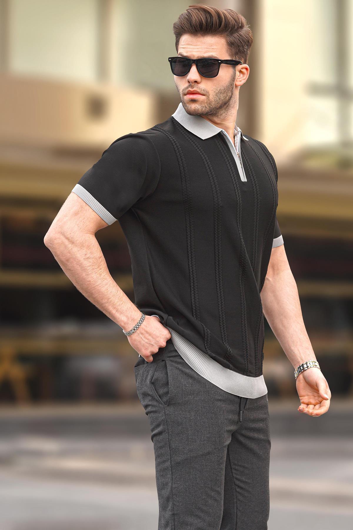 تیشرت یقه سه دکمه زیپدار مردانه مشکی با کیفیت عالی و رنگ زیبا و طرح شیک و قیمت باورنکردنی ساخت برند Madmext را از فروشگاه اینترنتی فیزا خریداری کنید.