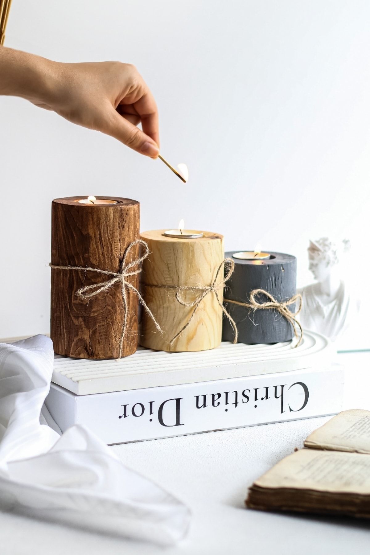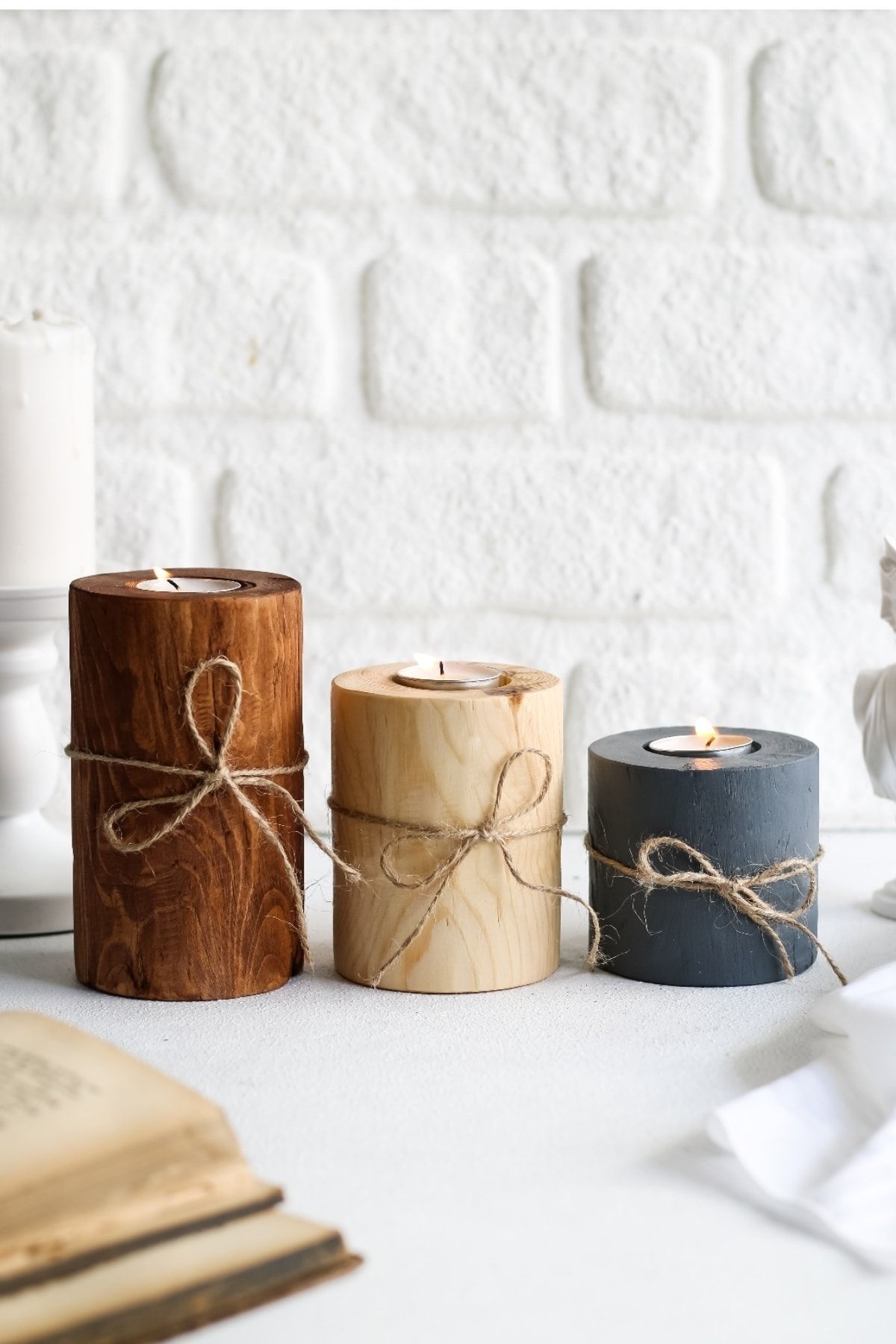 جا شمعی تزئینی چوب 3رنگ طناب دار پاپیونی برند LALEZEN HOME کد 1720131677