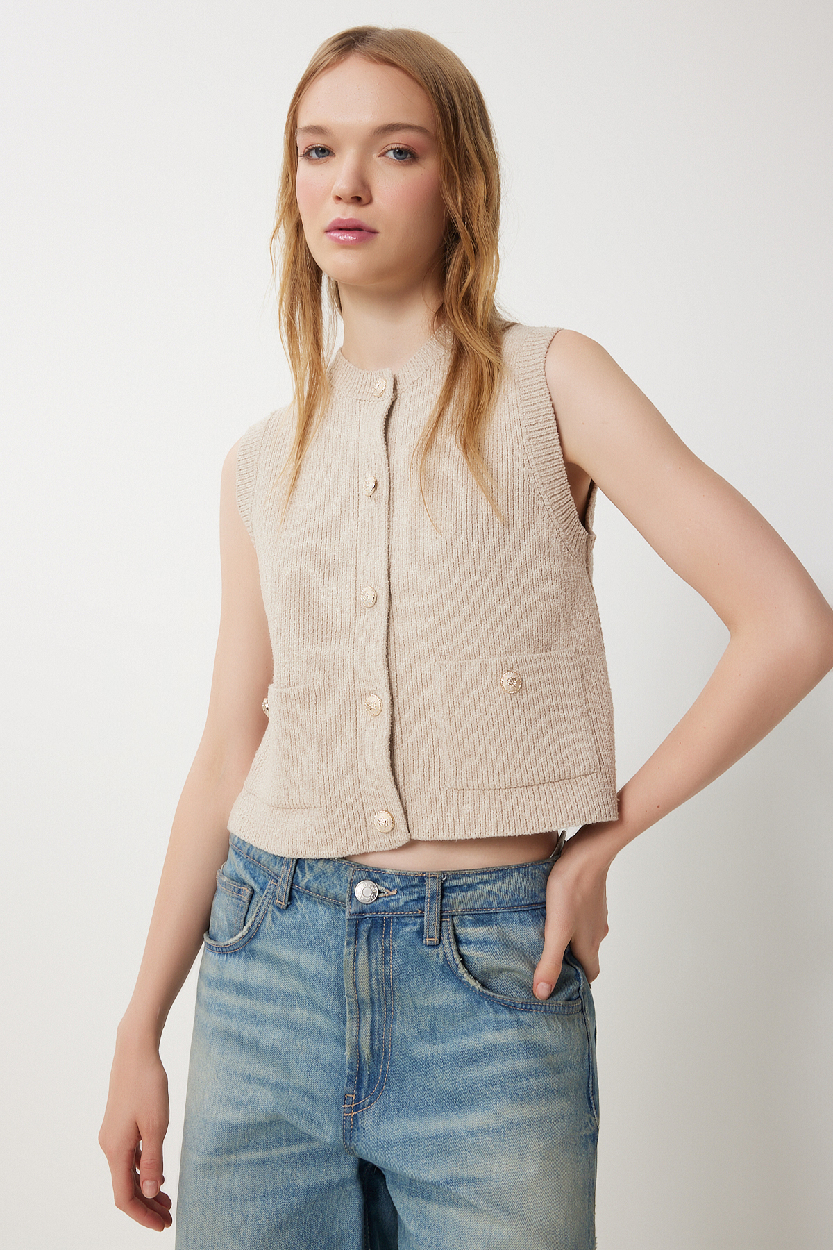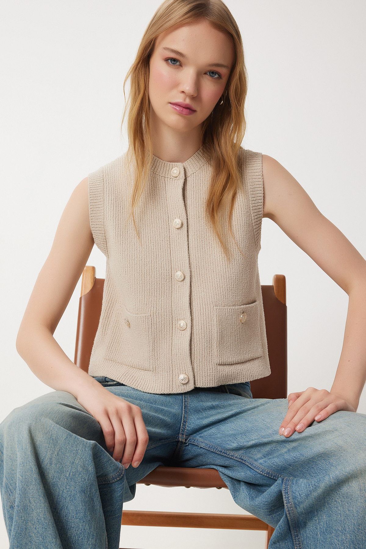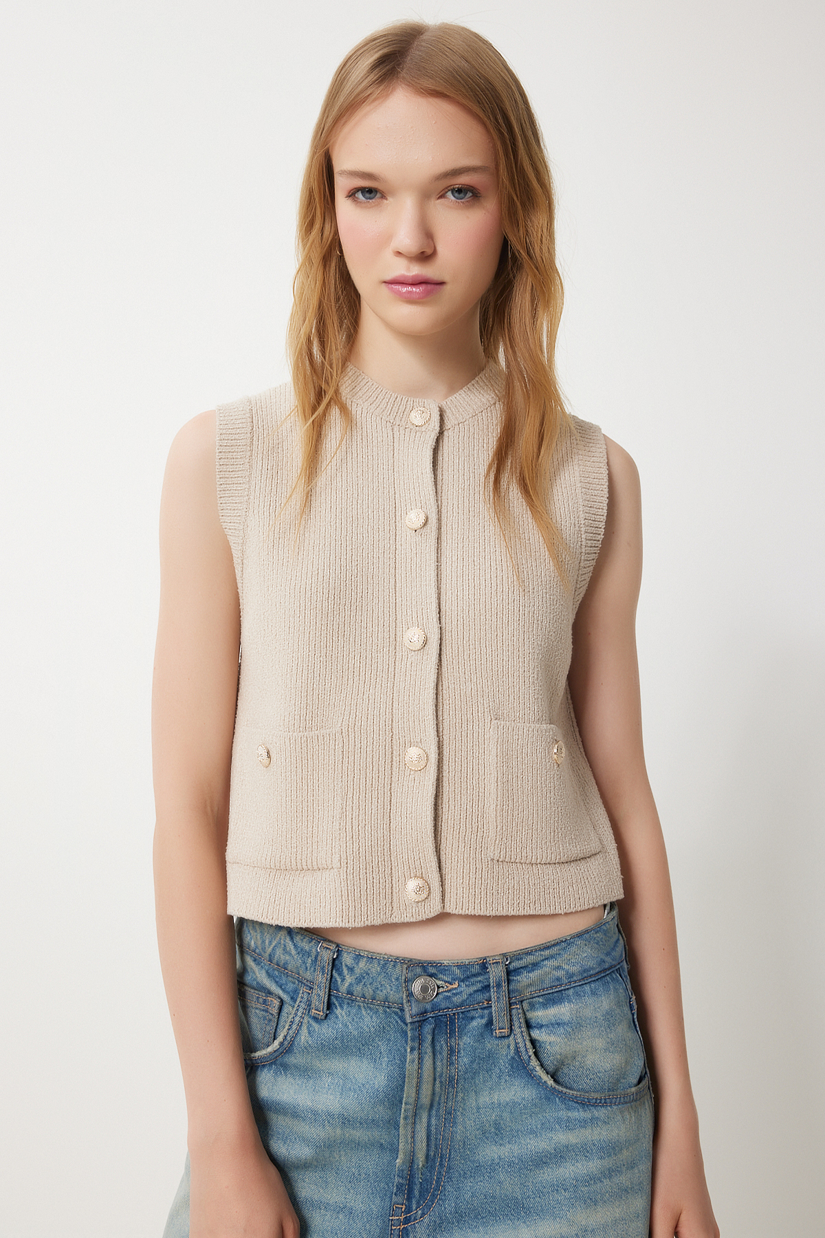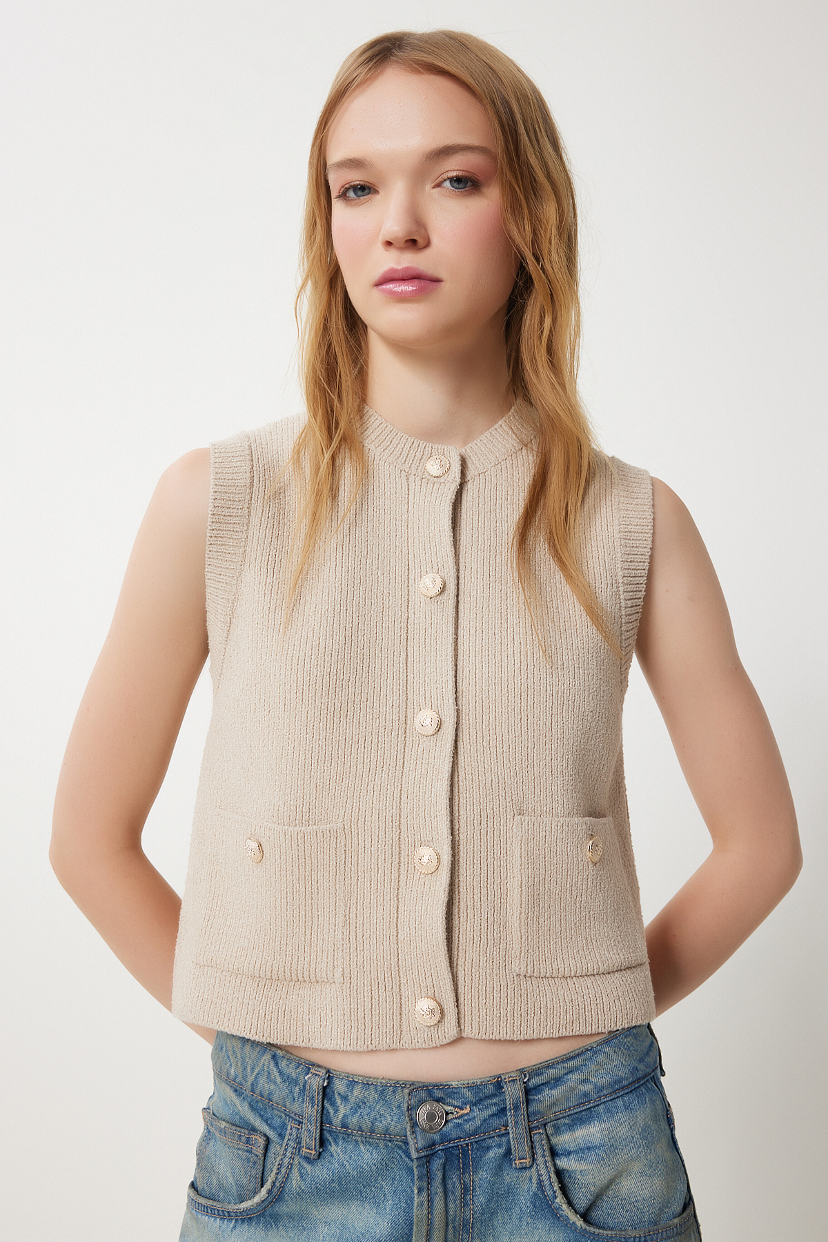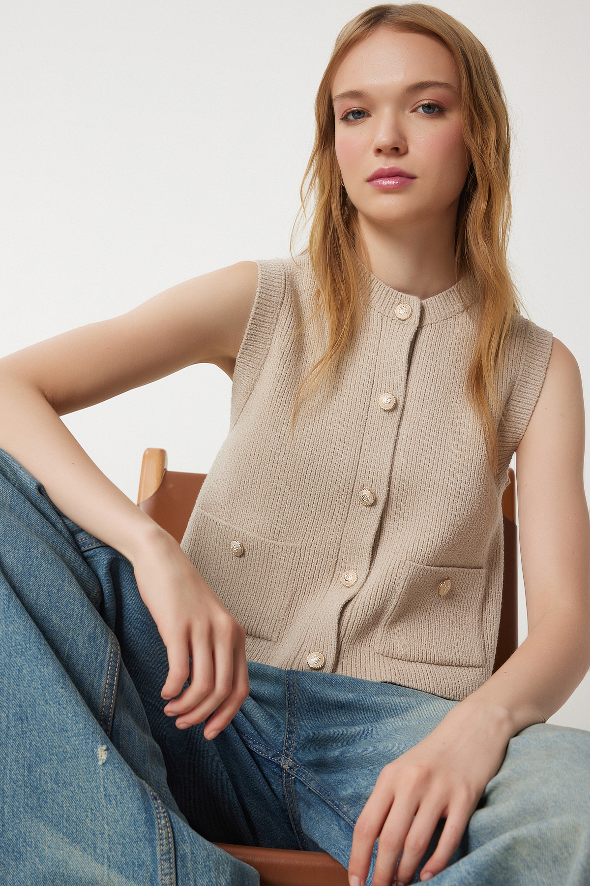 جلیقه بافتنی جیب دار دکمهدار بژ زنانه با کیفیت عالی و رنگ زیبا و طرح شیک و قیمت باورنکردنی ساخت برند Happiness İstanbul را از فروشگاه اینترنتی فیزا خریداری کنید.