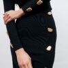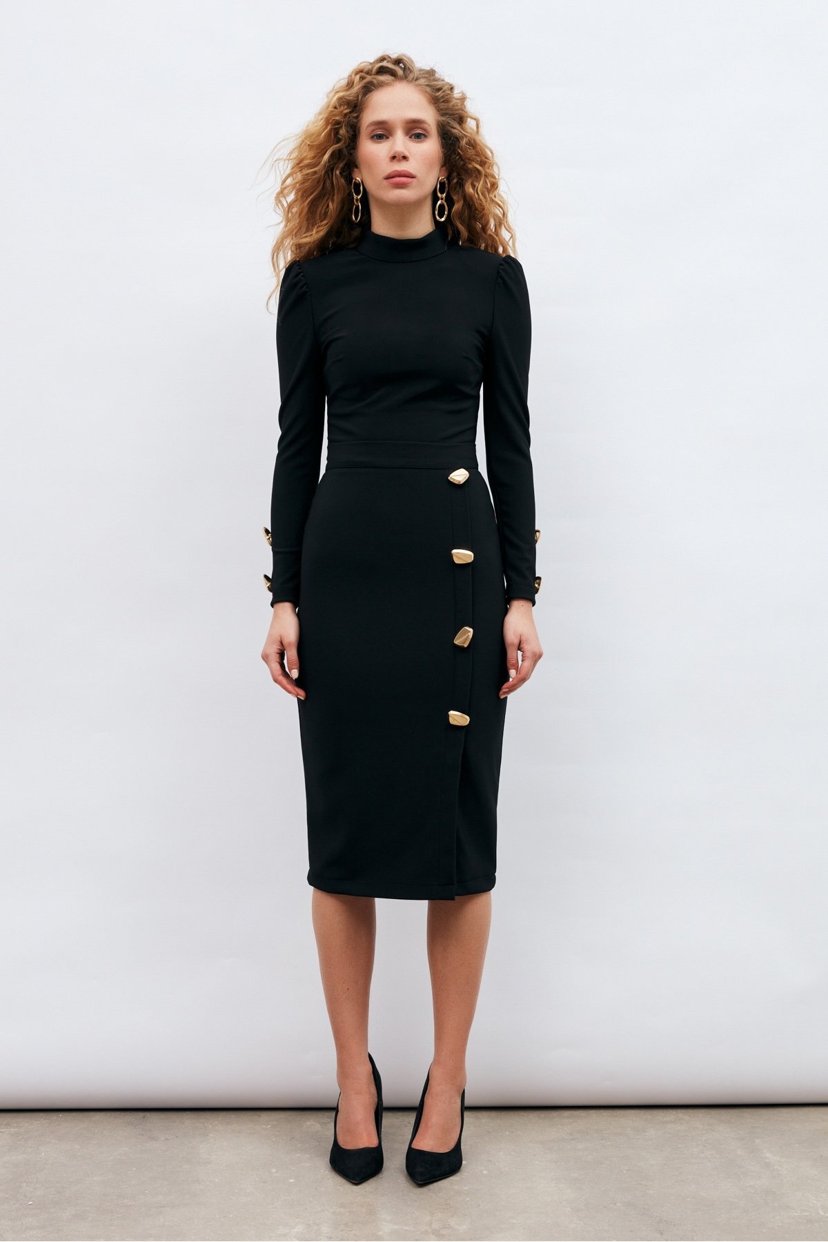 دامن مدادی مشکی دکمه دار که برای همه گروه های سنی جذاب است و با طراحی همیشگی خود گزینه ای ایده آل برای استفاده روزانه است، ظرافت شما را تکمیل می کند.