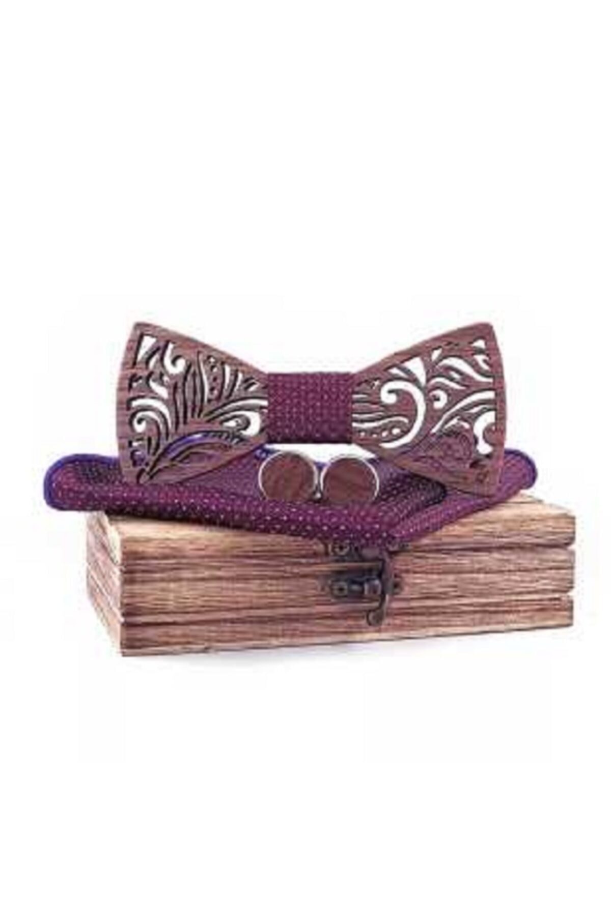 ست پاپیون چوبی بورگاندی مردانه به همراه دکمه袖 و دستمال یقه کد 1757956323