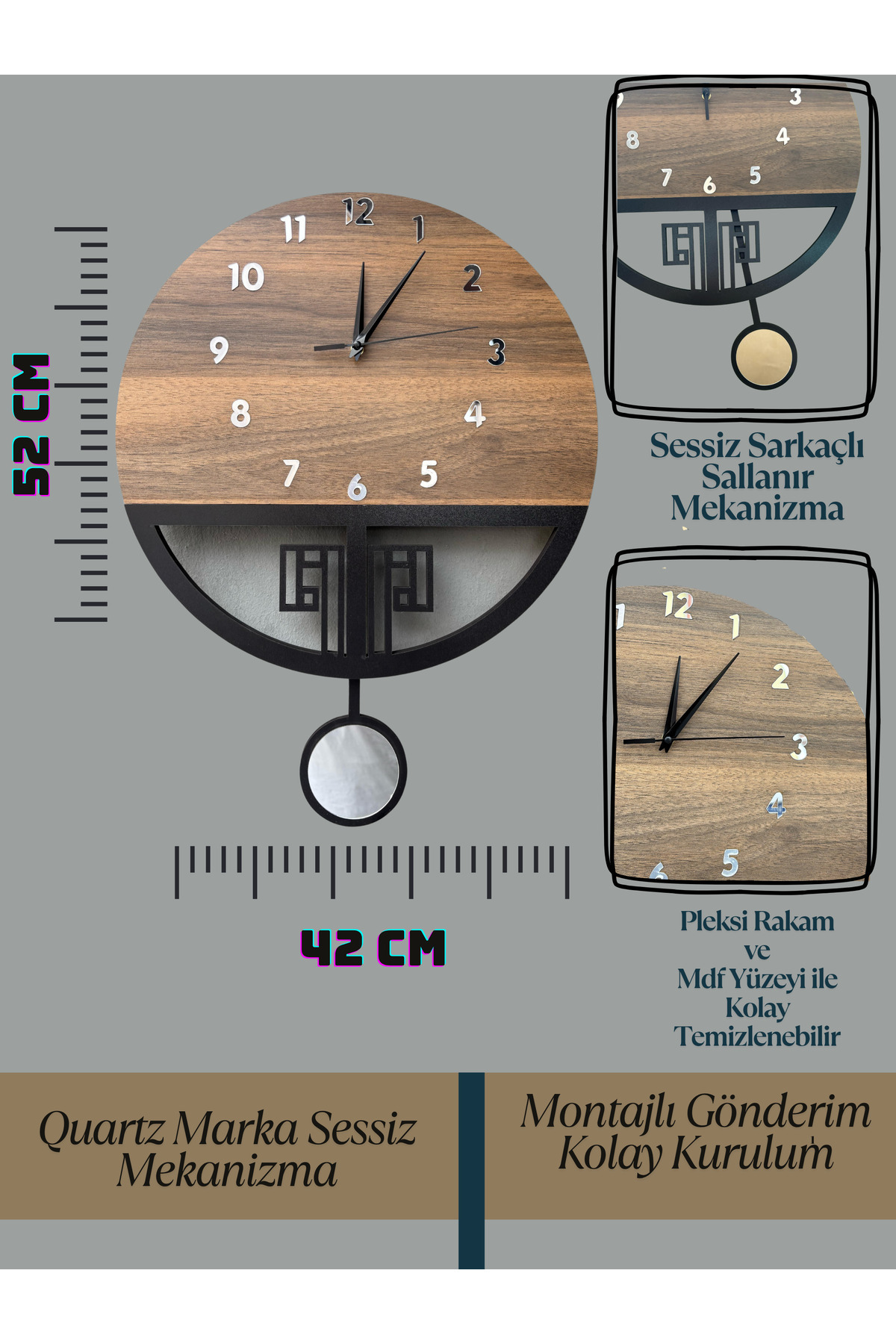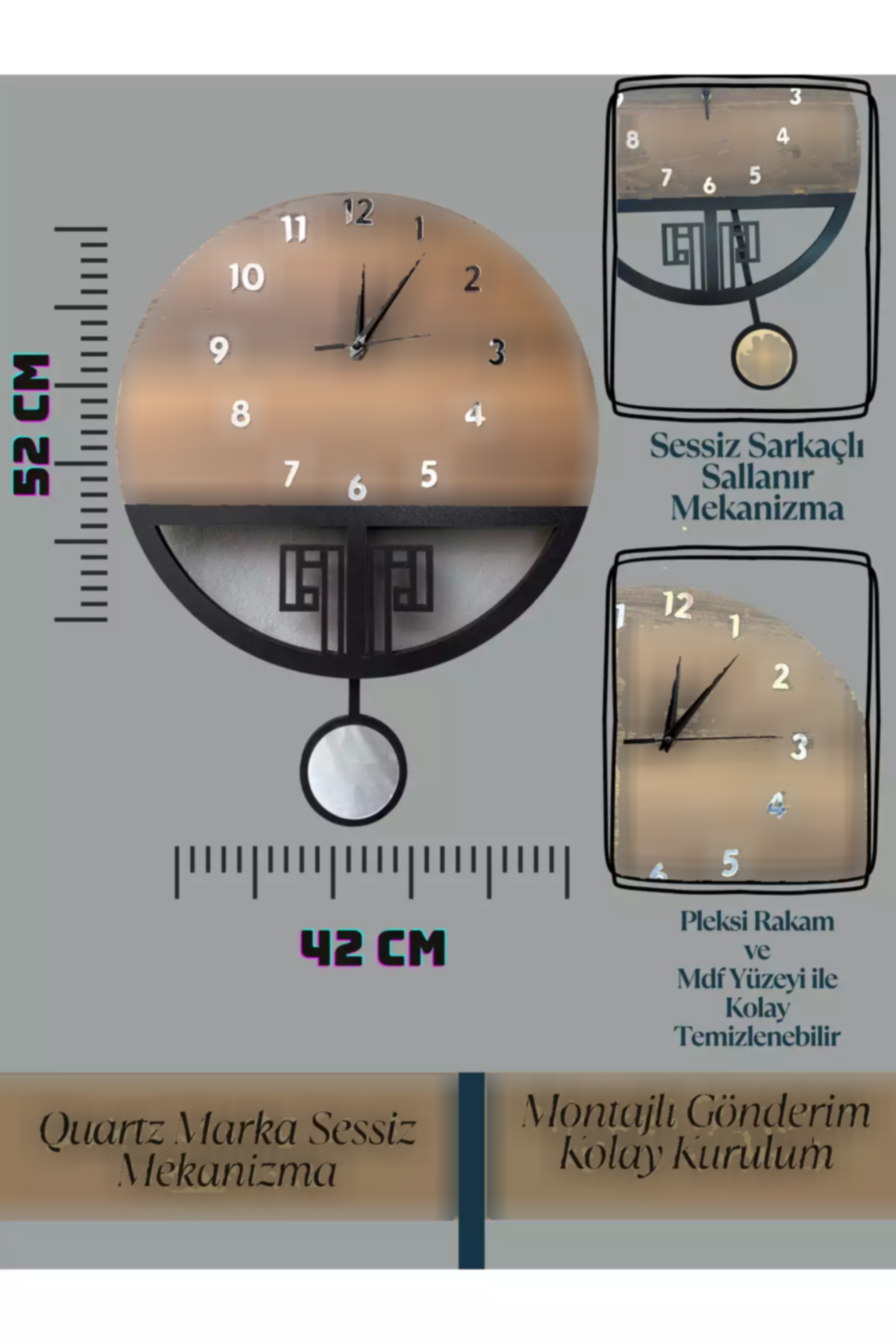 ویژگی قابل توجه این ساعت، وجود پاندول است که نه تنها به جذابیت بصری ساعت افزوده، بلکه صدای آرام و دلنشینی که در حین حرکت تولید میکند، فضایی رمانتیک و دلپذیر ایجاد میکند. پاندول به خوبی با طراحی کلی ساعت هماهنگ شده و حس حرکت و زندگی را به آن میدهد. این ویژگی میتواند باعث جلب توجه مهمانان و ایجاد گفتوگو در جمعهای دوستانه یا خانوادگی شود.