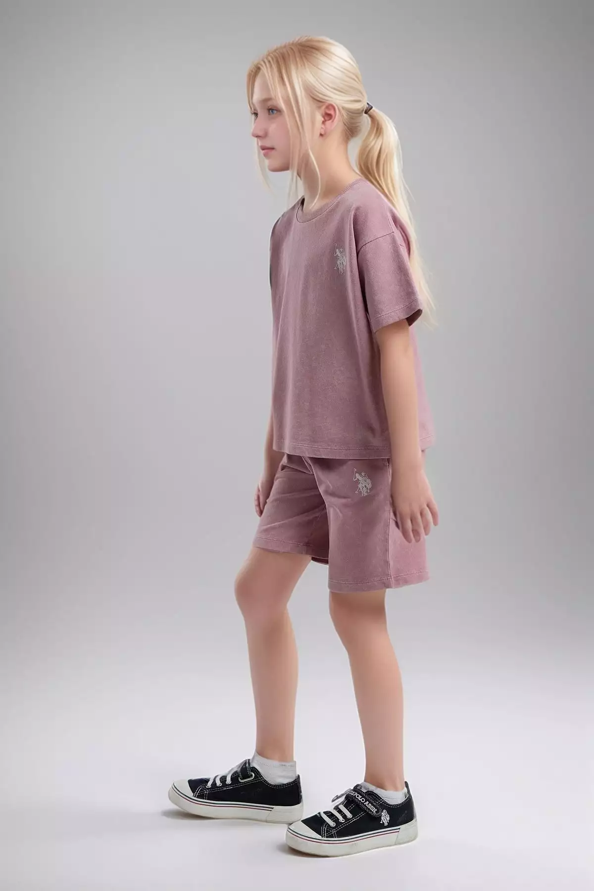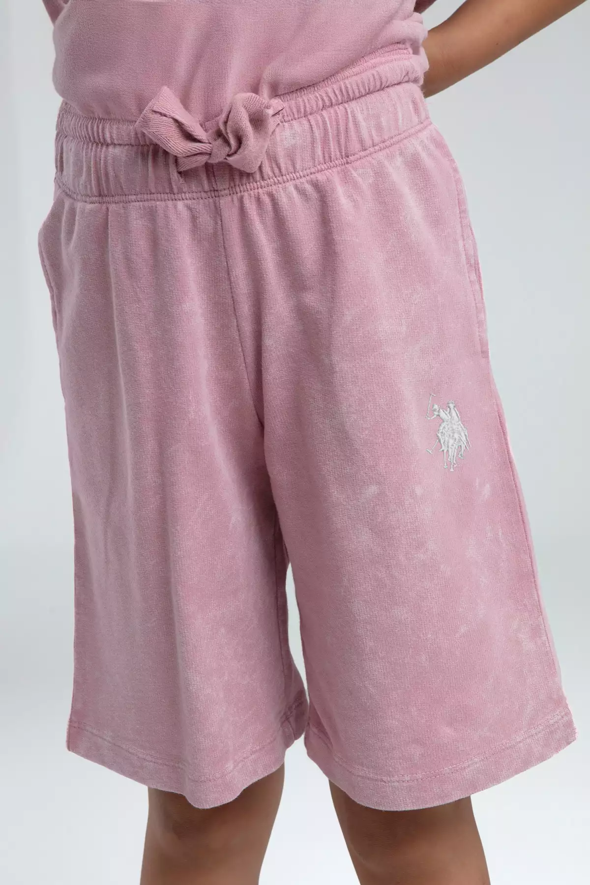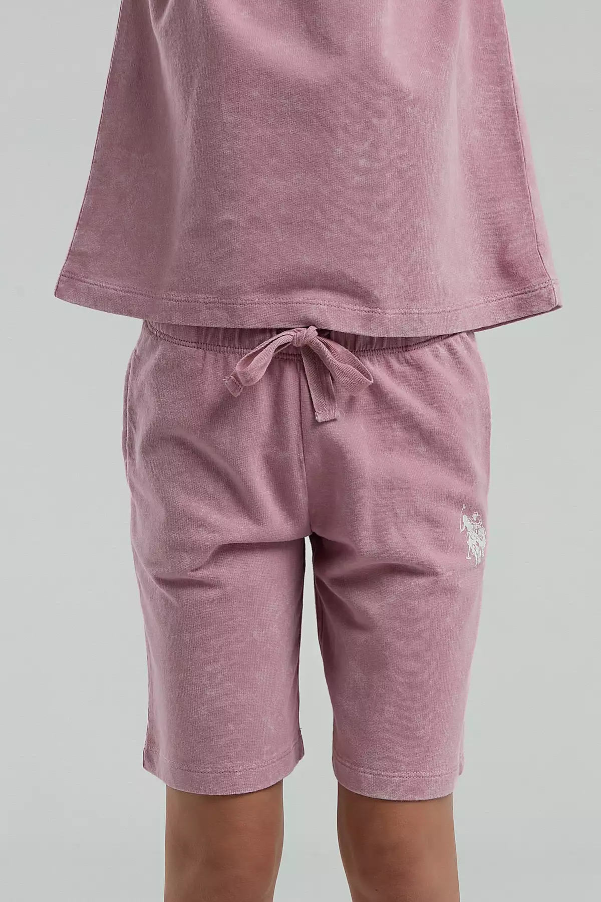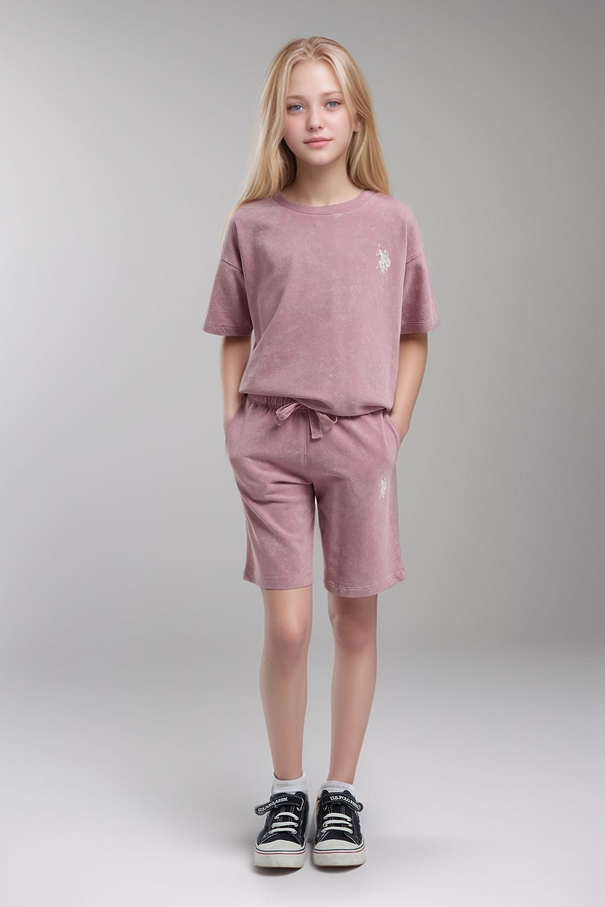 ست تیشرت و شورت یقه گرد دخترانه از ۱۰۰% پنبه، رنگ گلپری. برند U.S. Polo Assn.