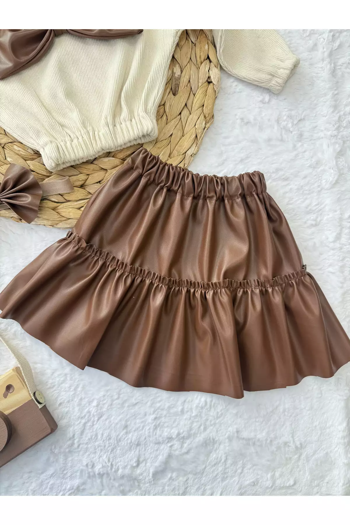 ست دخترانه و نوزادی شامل دامن چرمی، بلوز با پاپیون و باندانا برند AKİF GİYİM