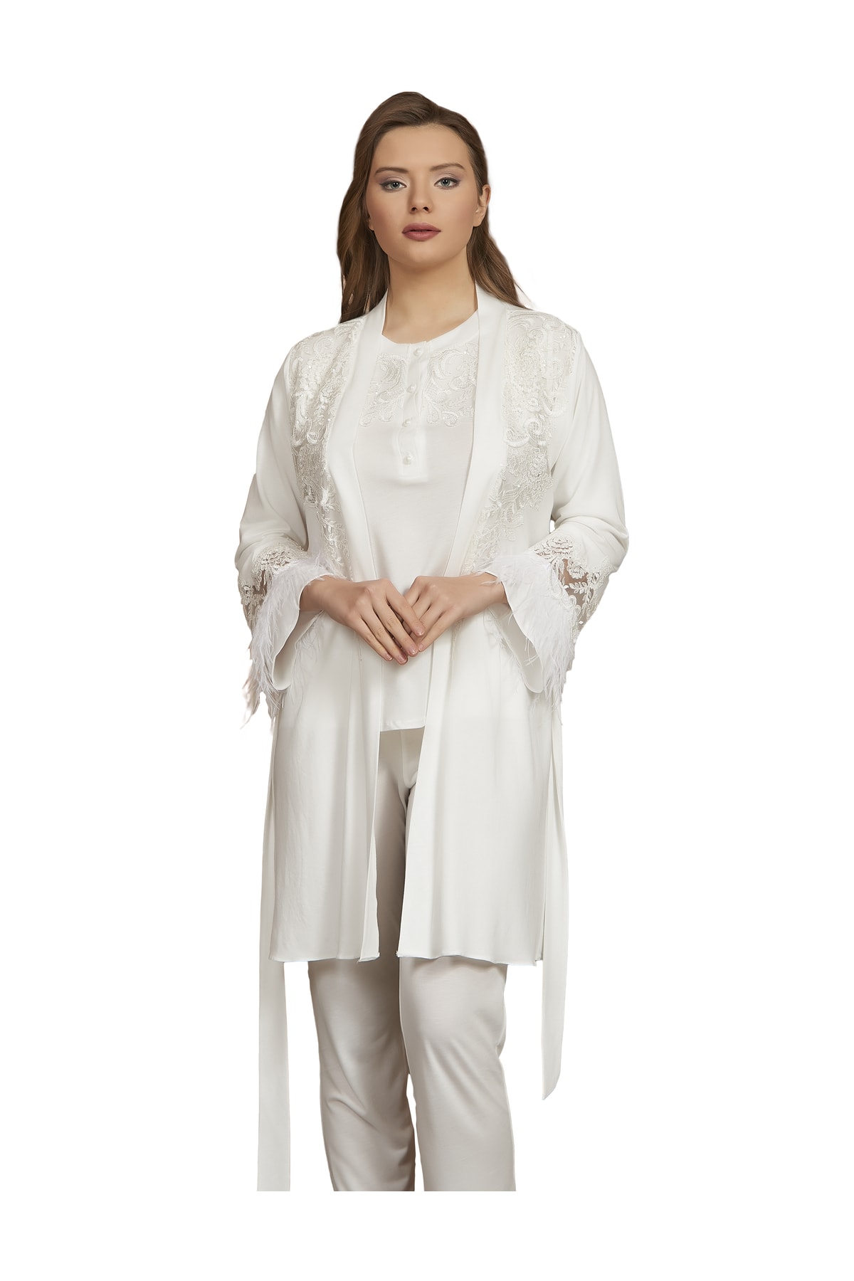 روبندوشامبر این ست نیز به زیبایی هر چه بیشتر شما کمک میکند. با طراحی شیک و جزئیات تور، این روبندوشامبر نه تنها برای استفاده در خانه مناسب است، بلکه میتواند به عنوان لباسی برای مهمانیهای غیررسمی نیز پوشیده شود. این ترکیب به راحتی با دیگر لباسها ست میشود و امکان ایجاد ظاهری زیبا و شیک را برای شما فراهم میکند.