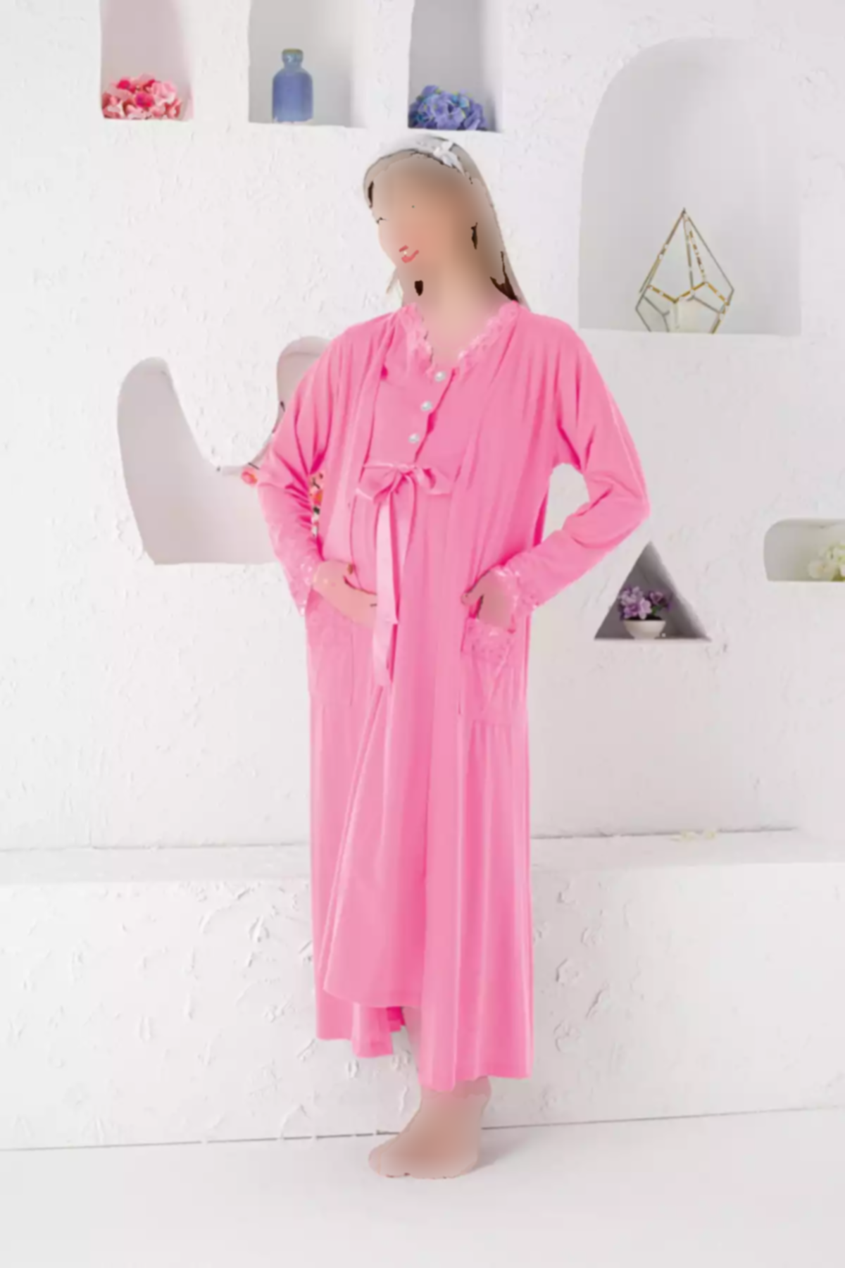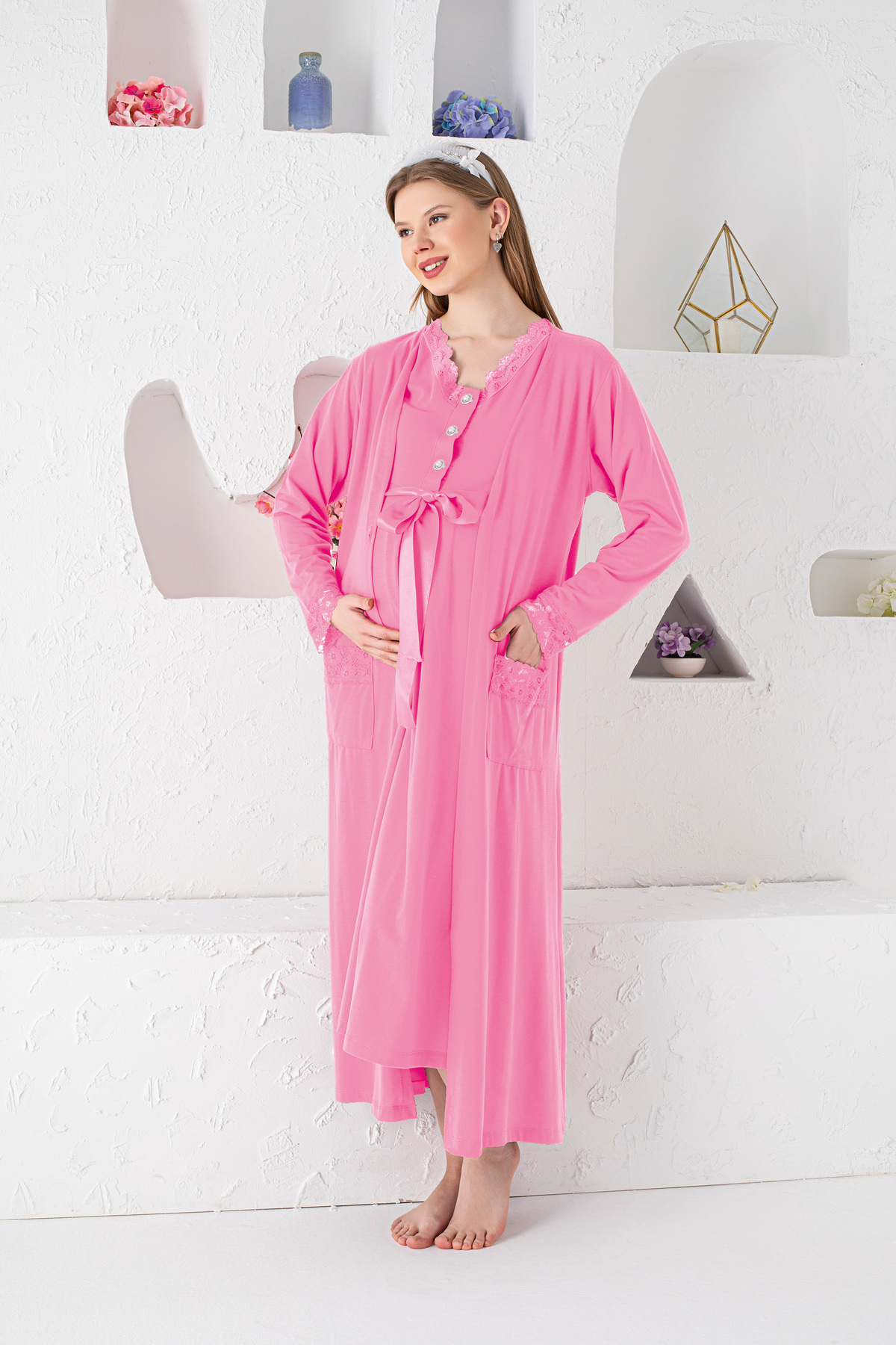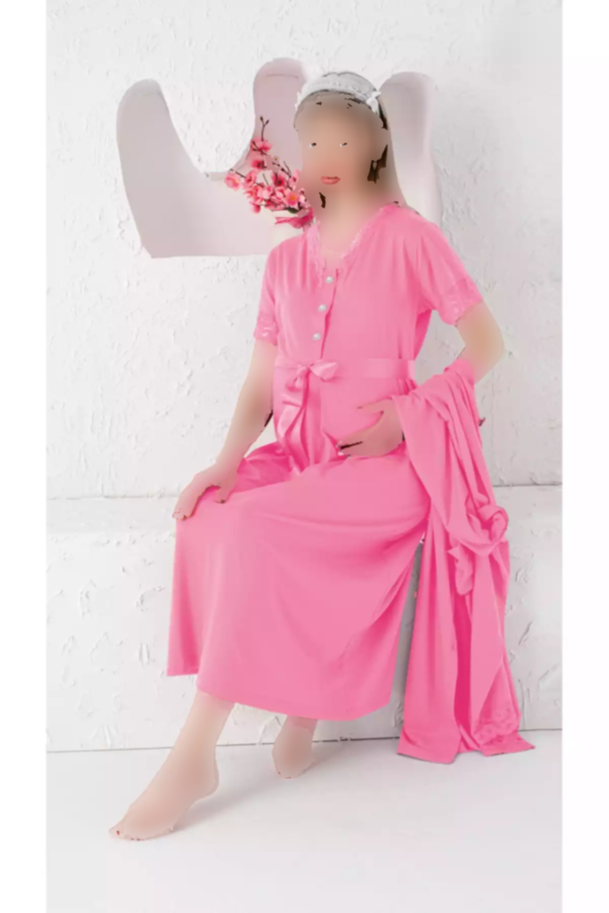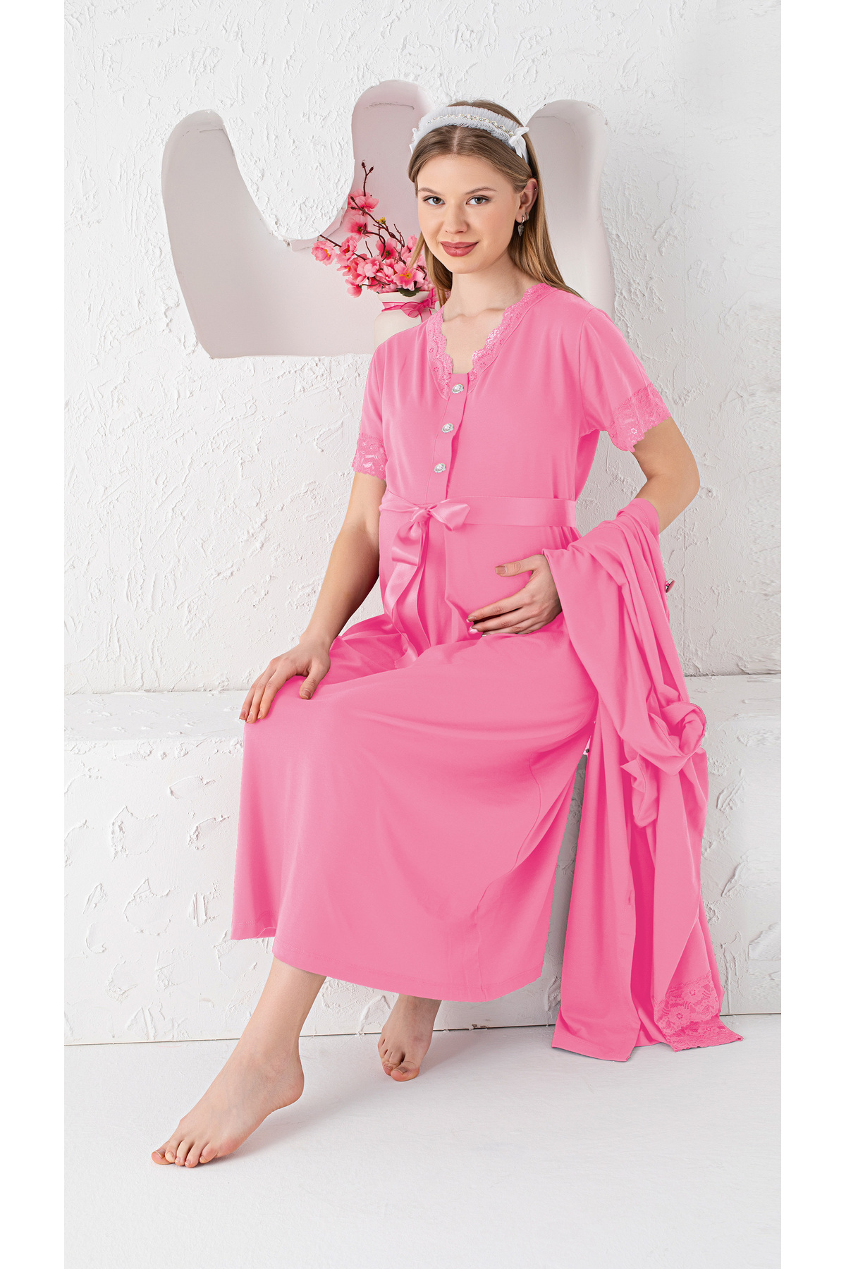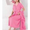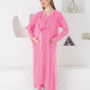 **توصیف محصول: ست لوزی زایمان دو تکه با پیراهن خواب کوتاه آستین کوتاه و جزئیات گیپور صورتی (کد 1758224525)**