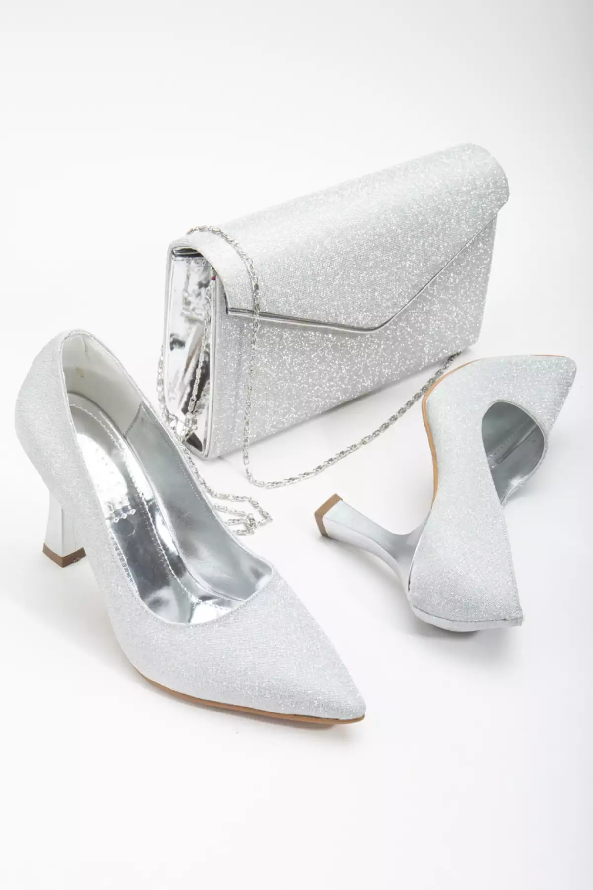 ست کیف و کفش زنانه با پاشنه 9 سانتیمتر کلفت و طراحی ویژه از جنس نقرهای برند mermaid shoes
