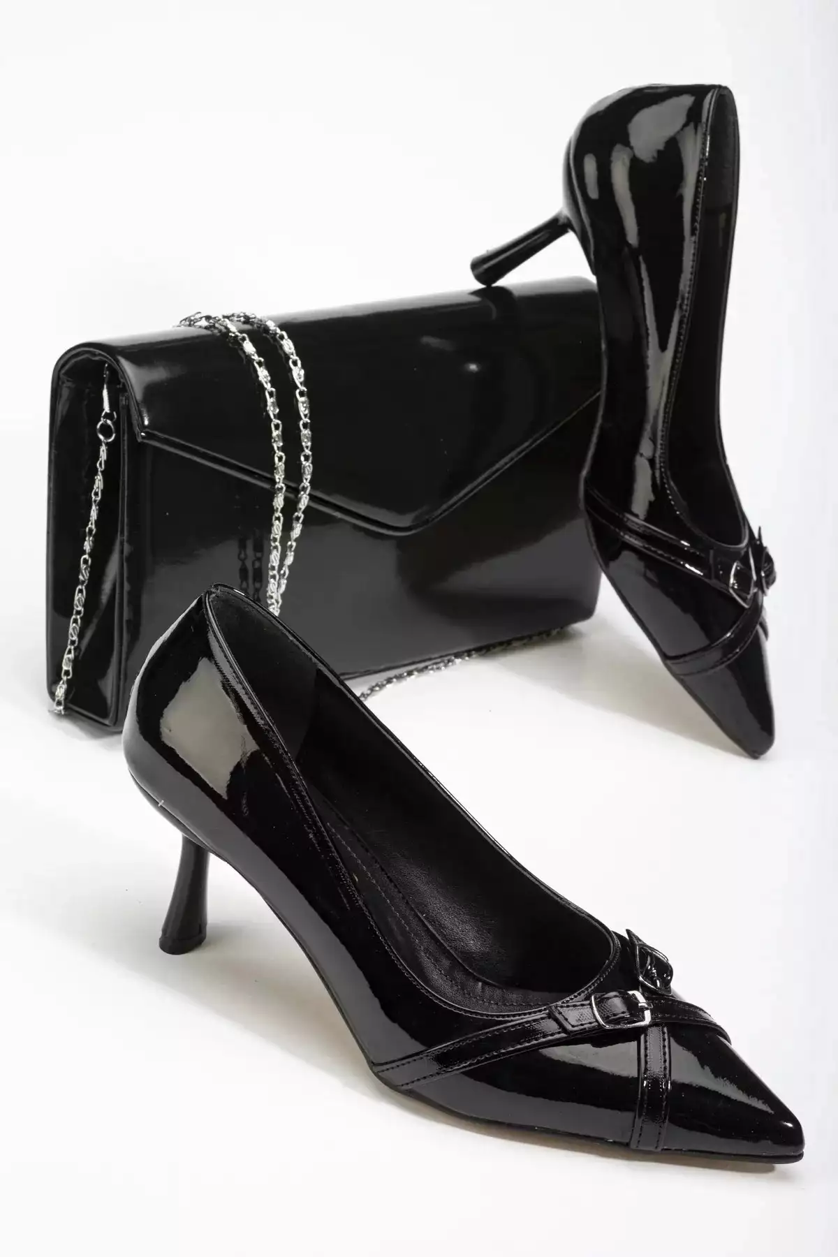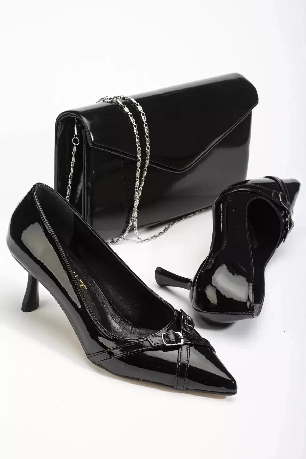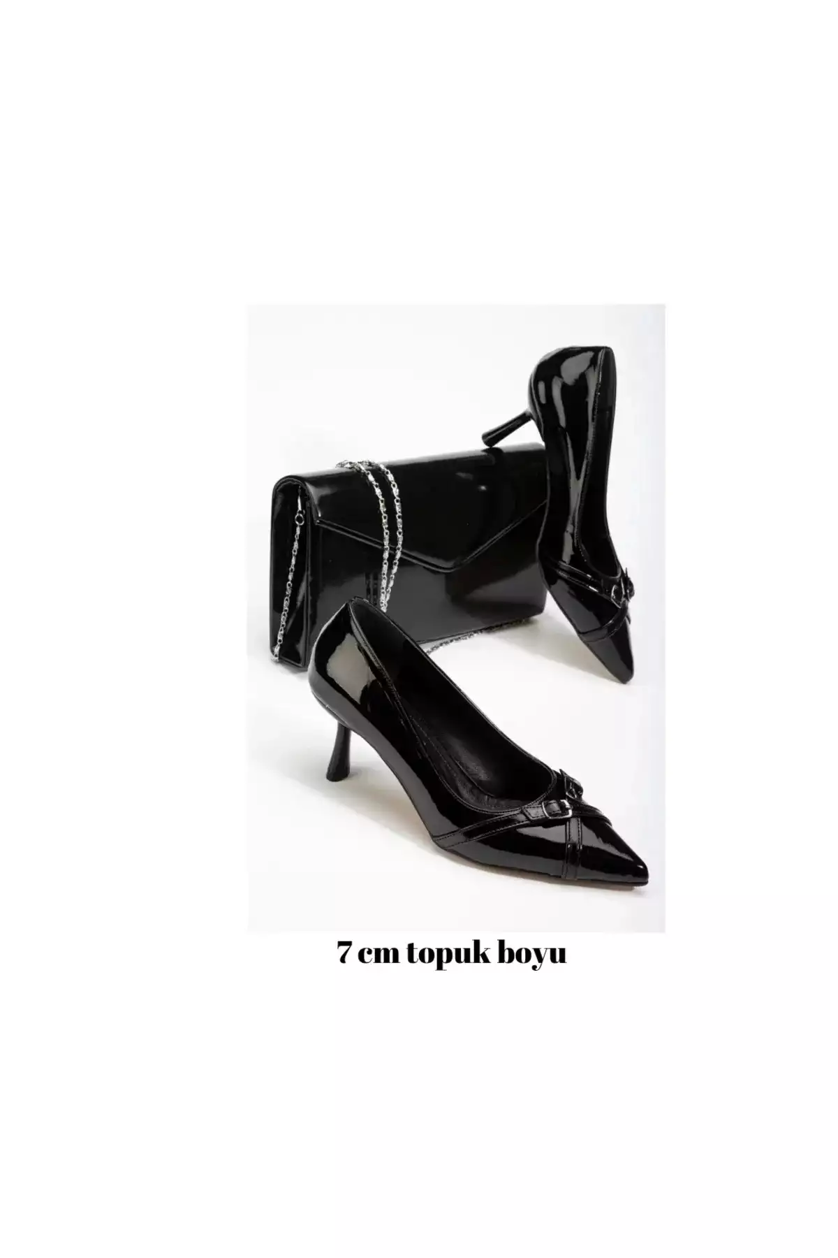 ست کیف و کفش زنانه 7 سانتیمتری استیلتو مشکی براق برند MFT AYAKKABI