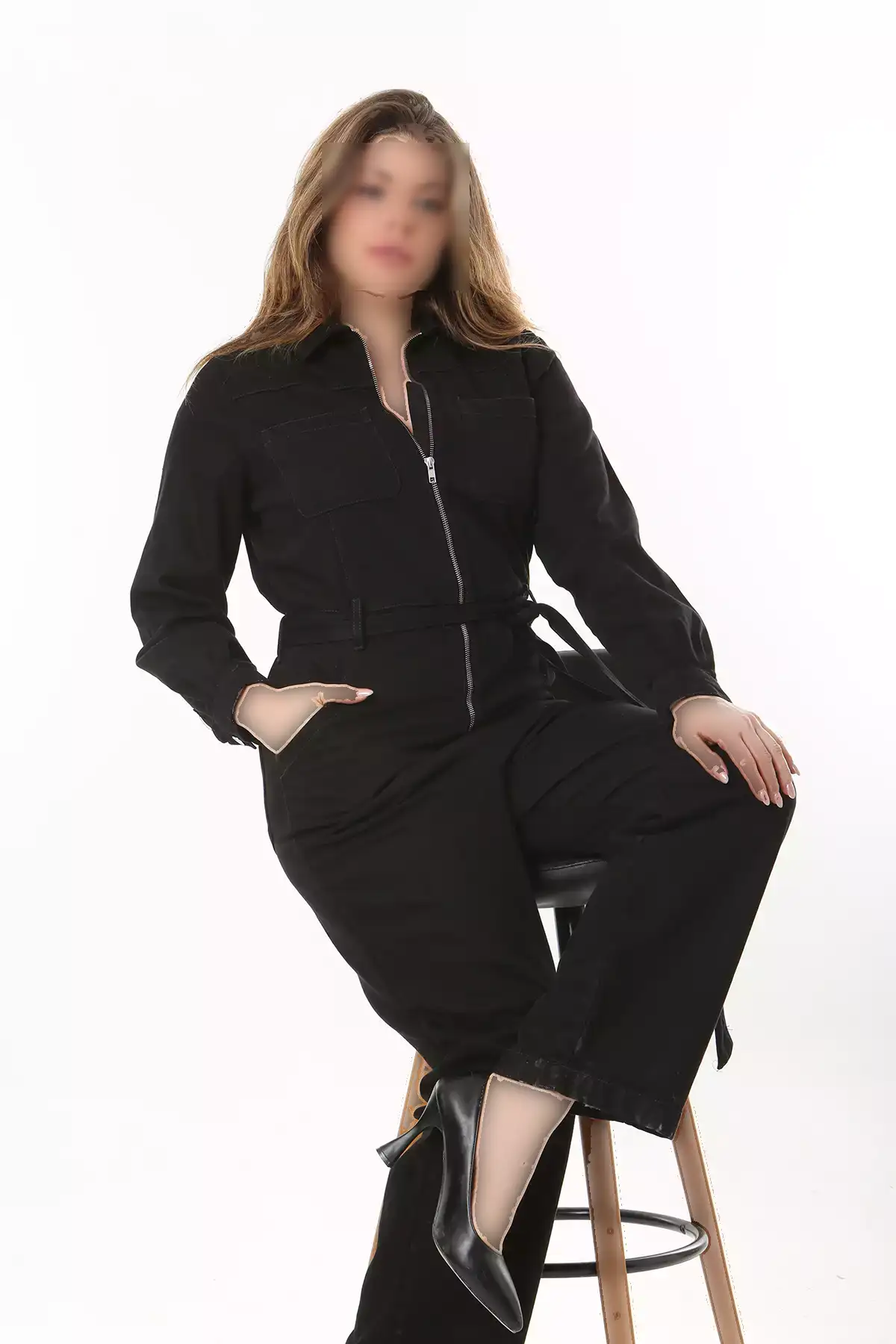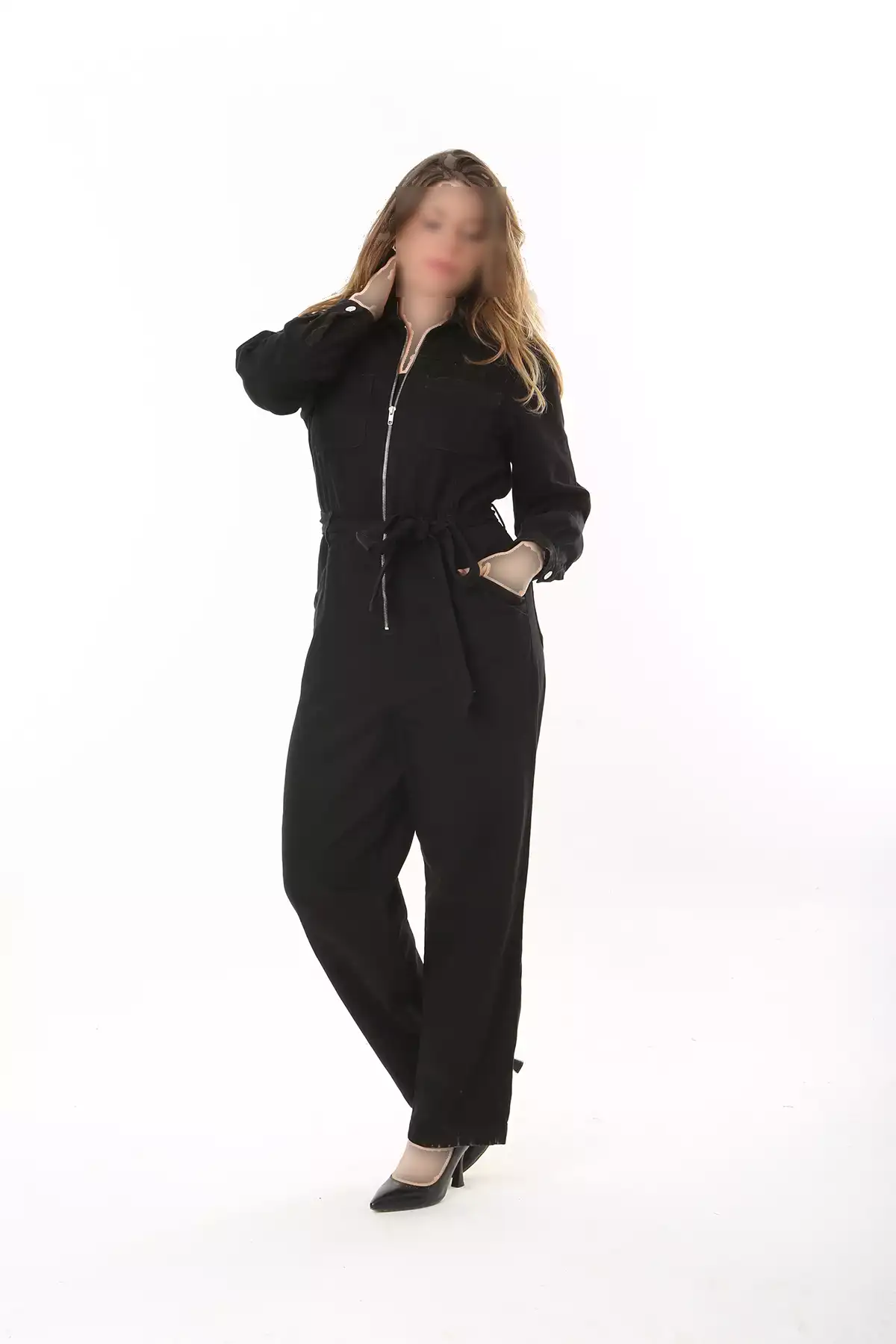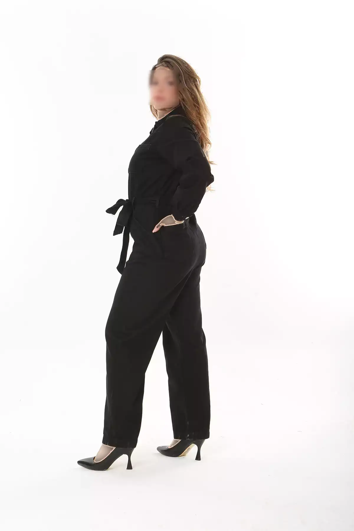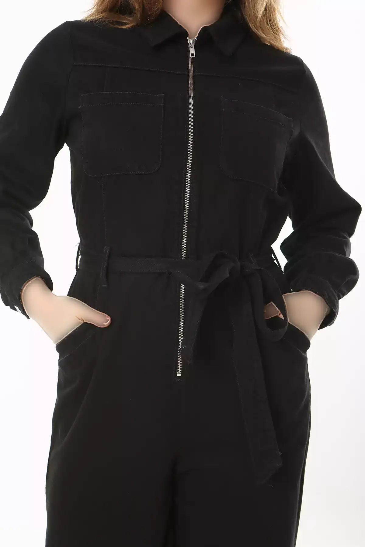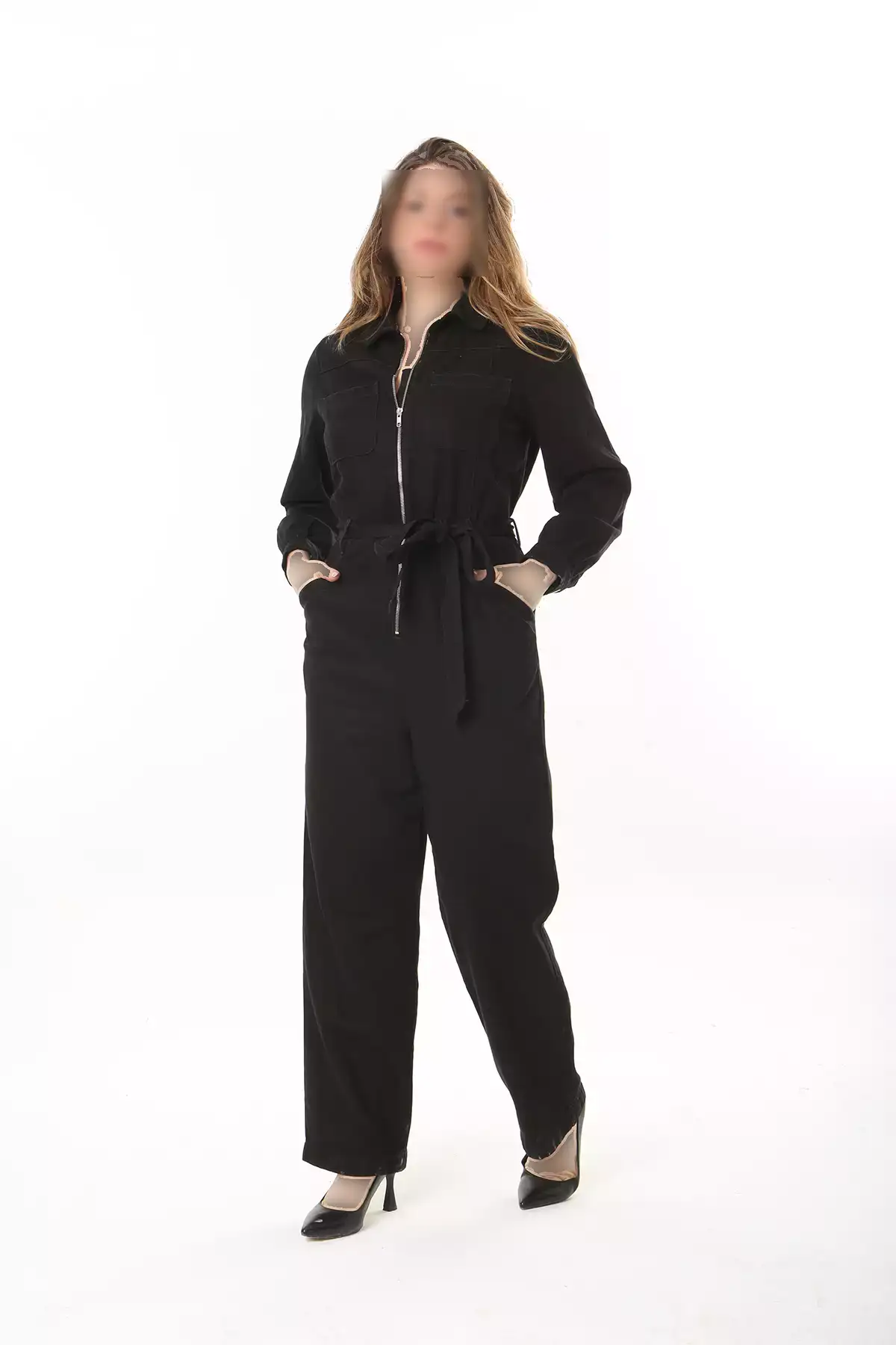 سرهمی زنانه سایز بزرگ مشکی با زیپ جلویی و جزئیات کمر کشی و کمربند و جیب 65N37469 برند Şans