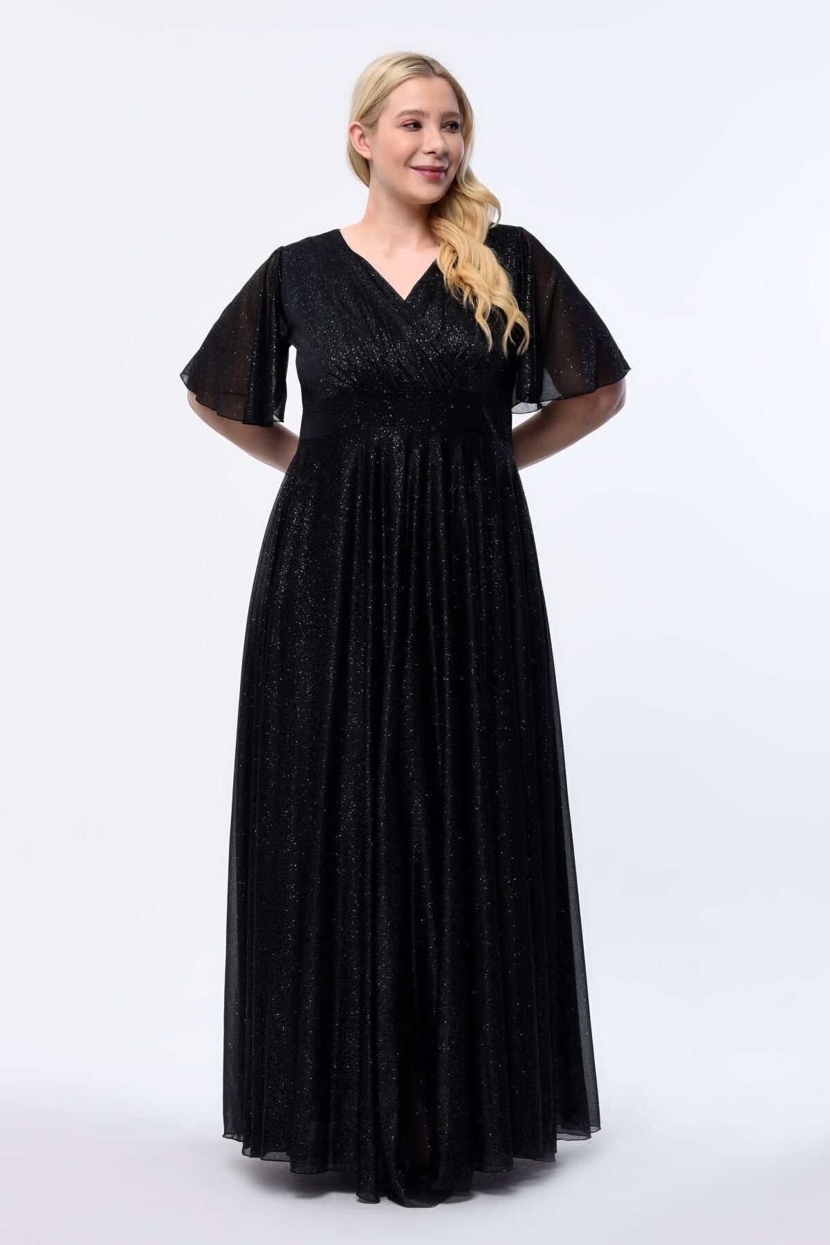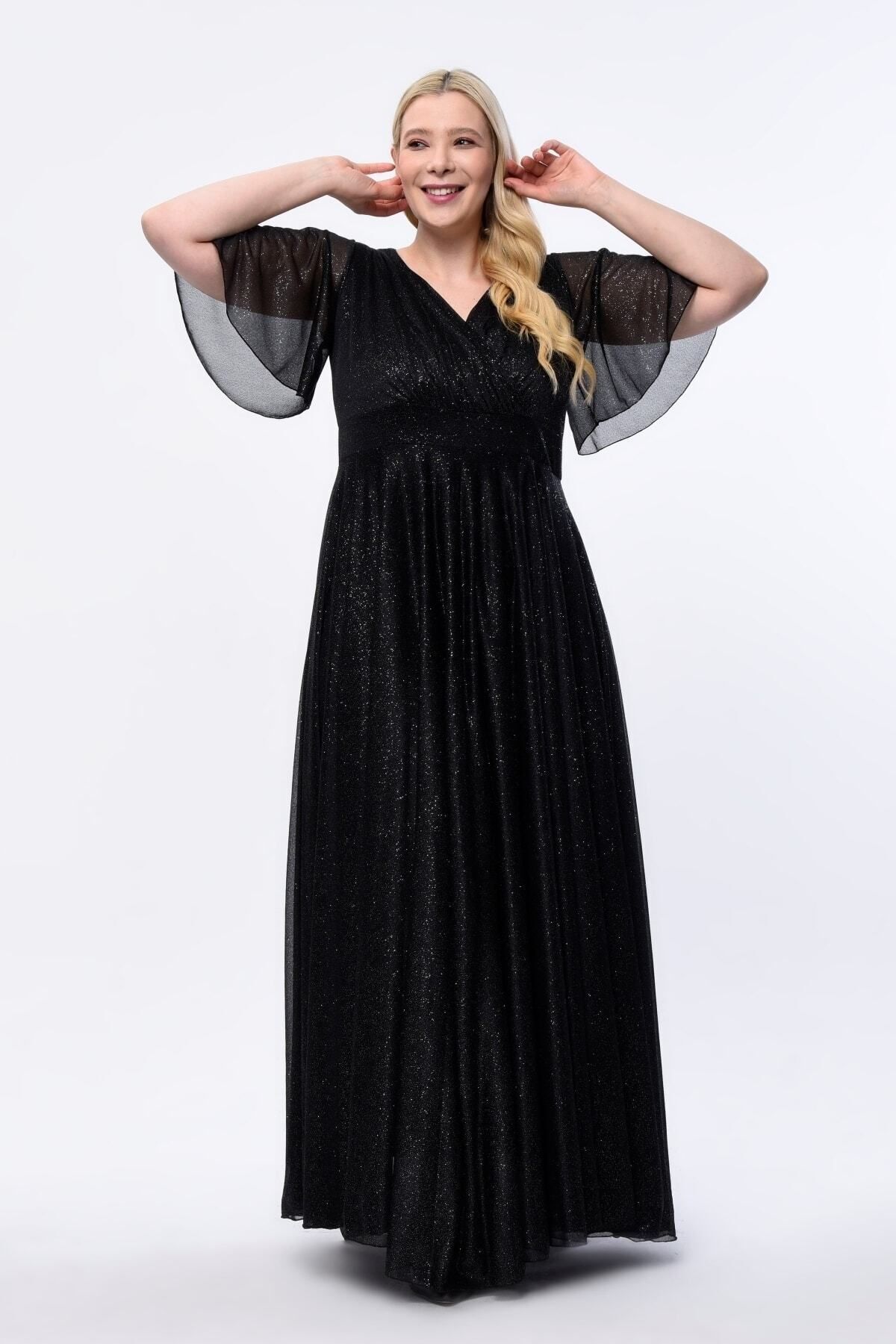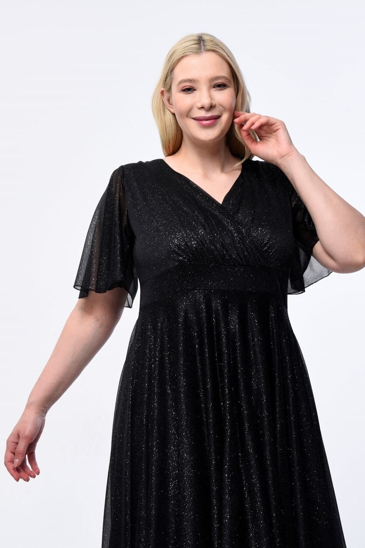 لباس شب مجلسی شیک با یقه کروازی و آستینهای پفی از جنس توری با تم براق، مخصوص سایز بزرگ 3051 برند Genel Markalar