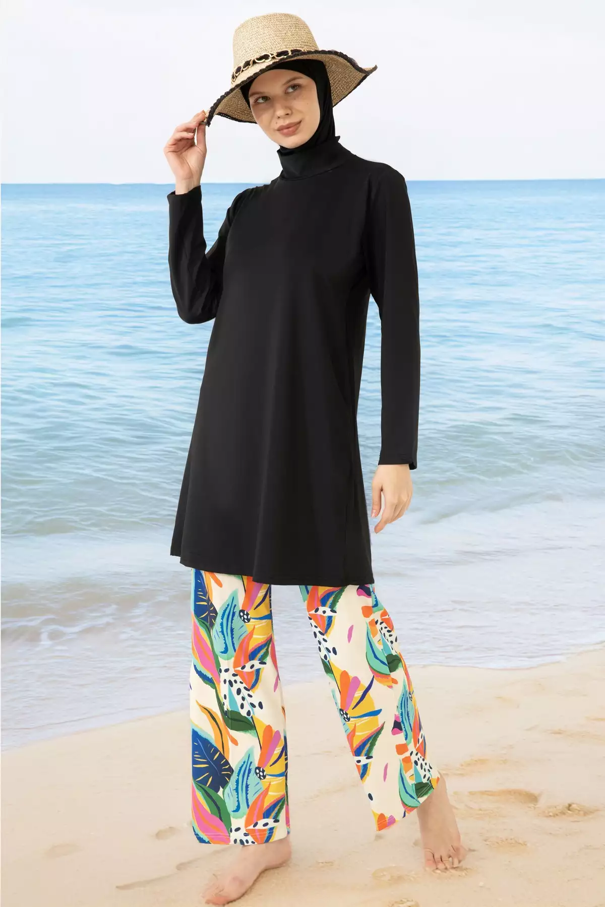 این مايو دارای آستینهای بلند و یقه اسکی است که به خوبی بدن را میپوشاند و به شما امکان میدهد در هرجایی از آن استفاده کنید.