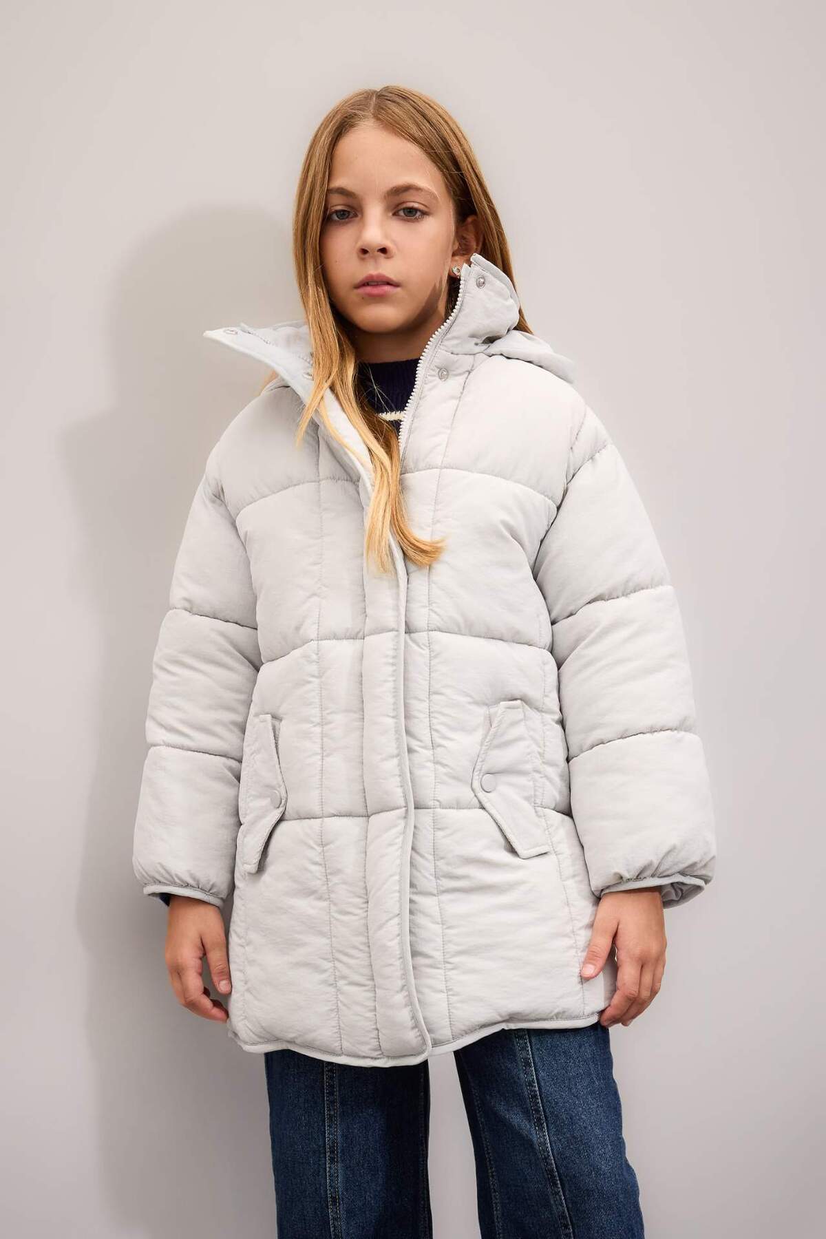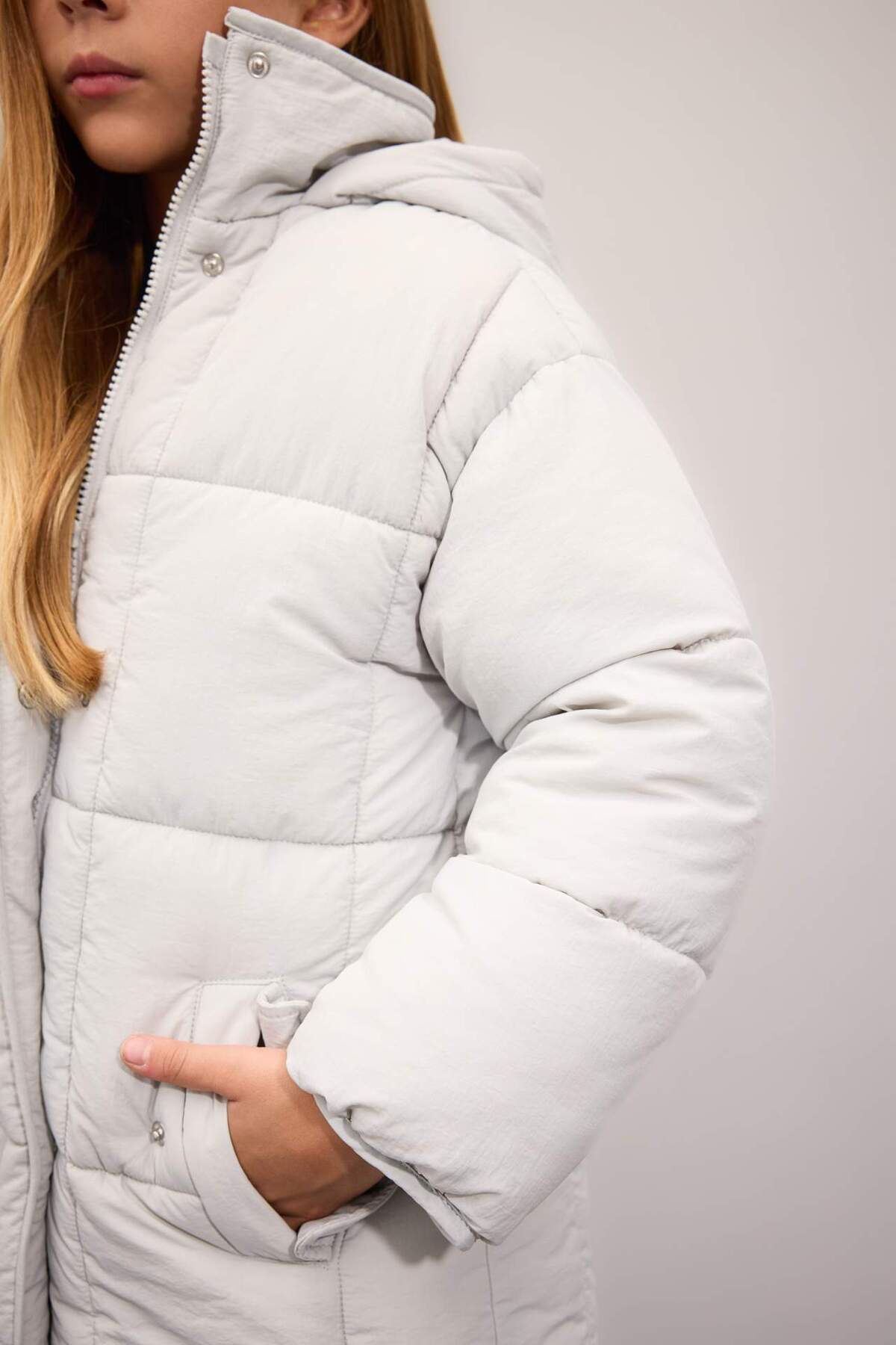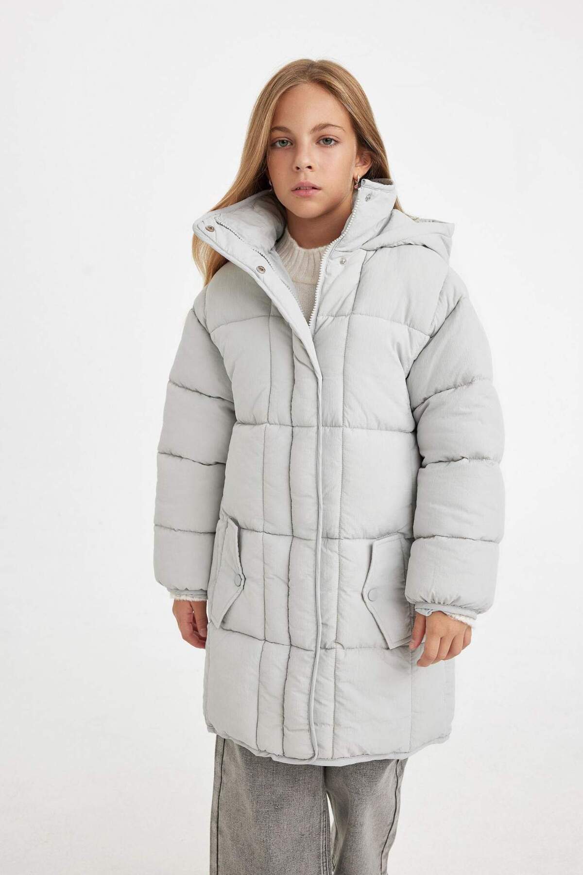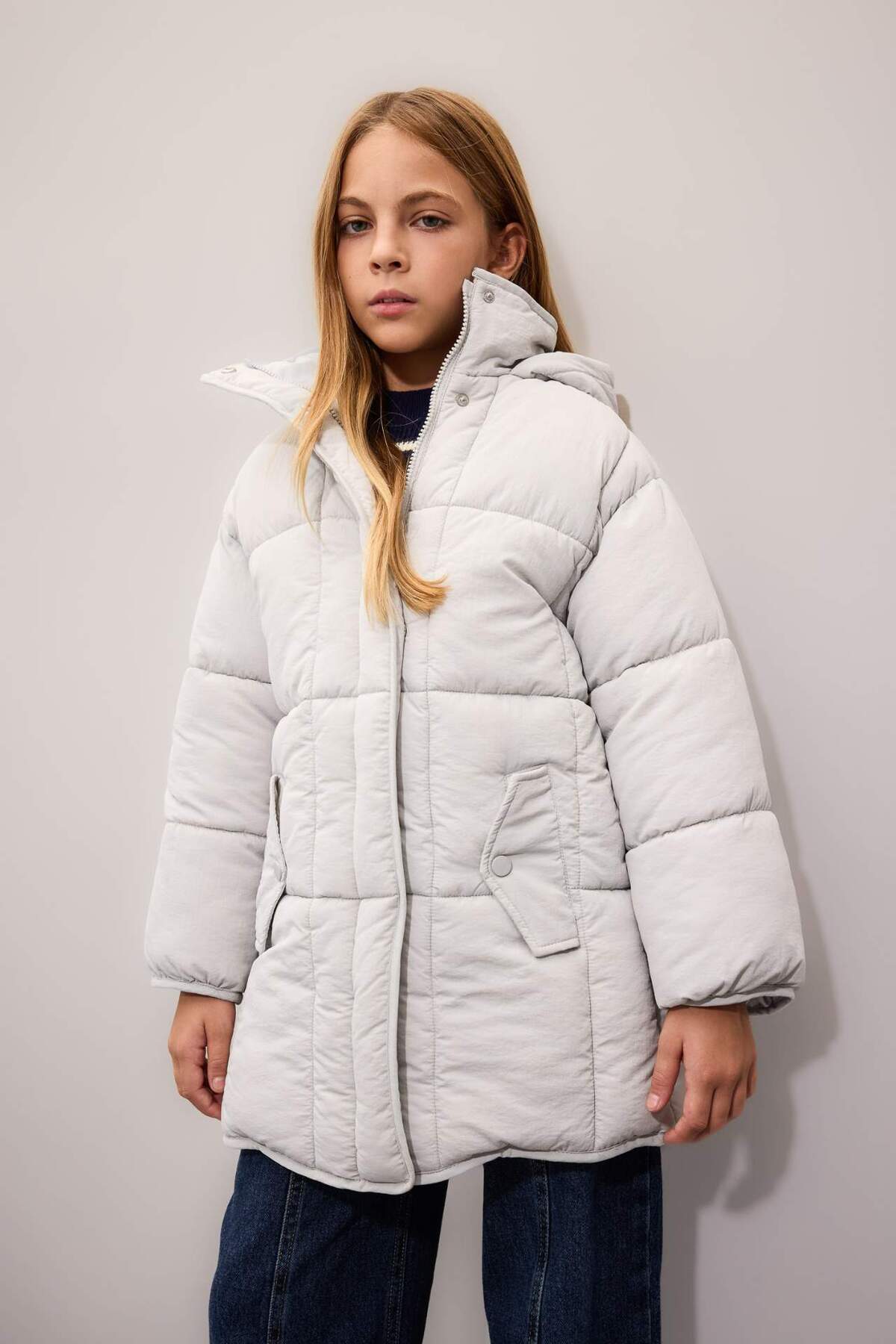 پالتوی پفی بلند و سبک با کلاهی ضد آب مناسب دختران، دارای زیپ و جیب C9026A824AU برند Defacto