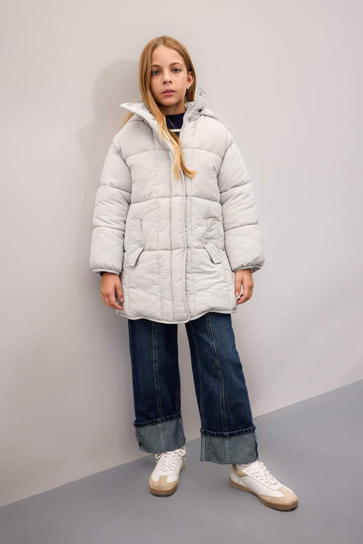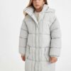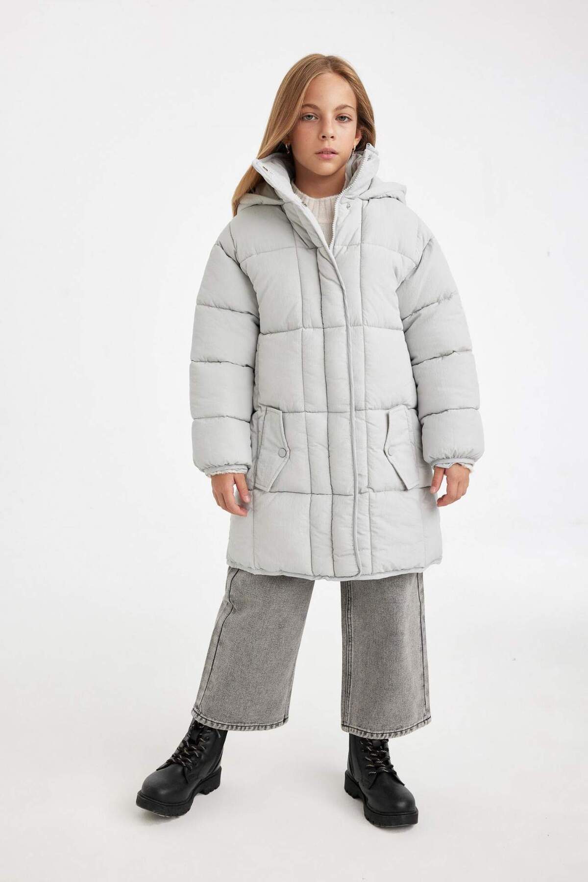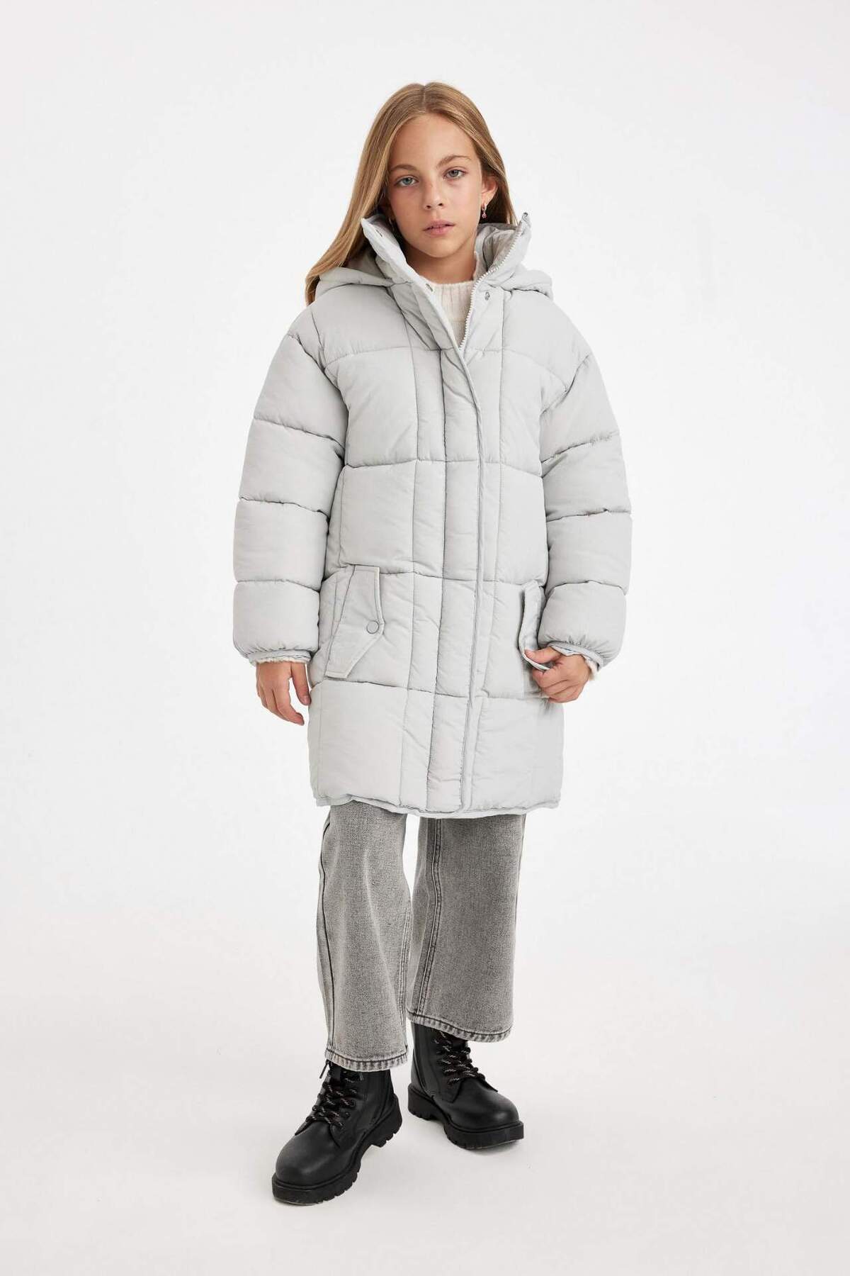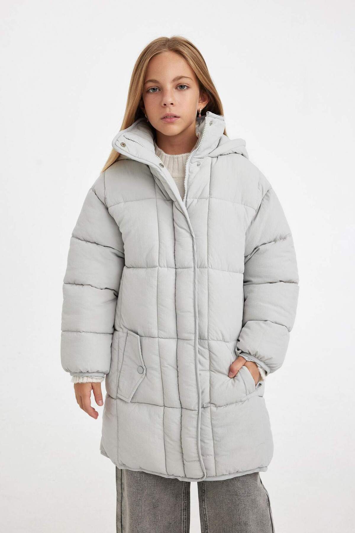 پالتوی پفی بلند و سبک با کلاهی ضد آب مناسب دختران، دارای زیپ و جیب C9026A824AU برند Defacto