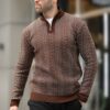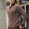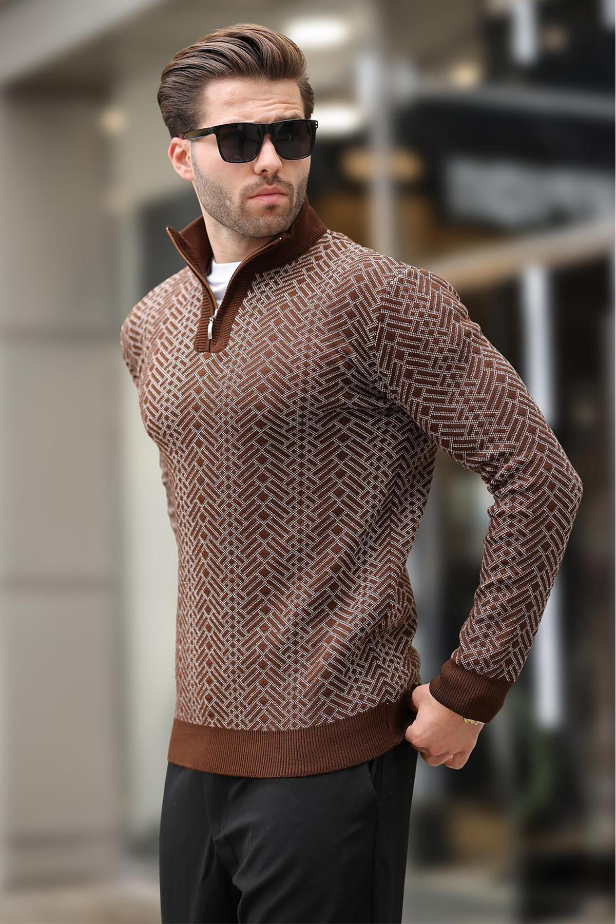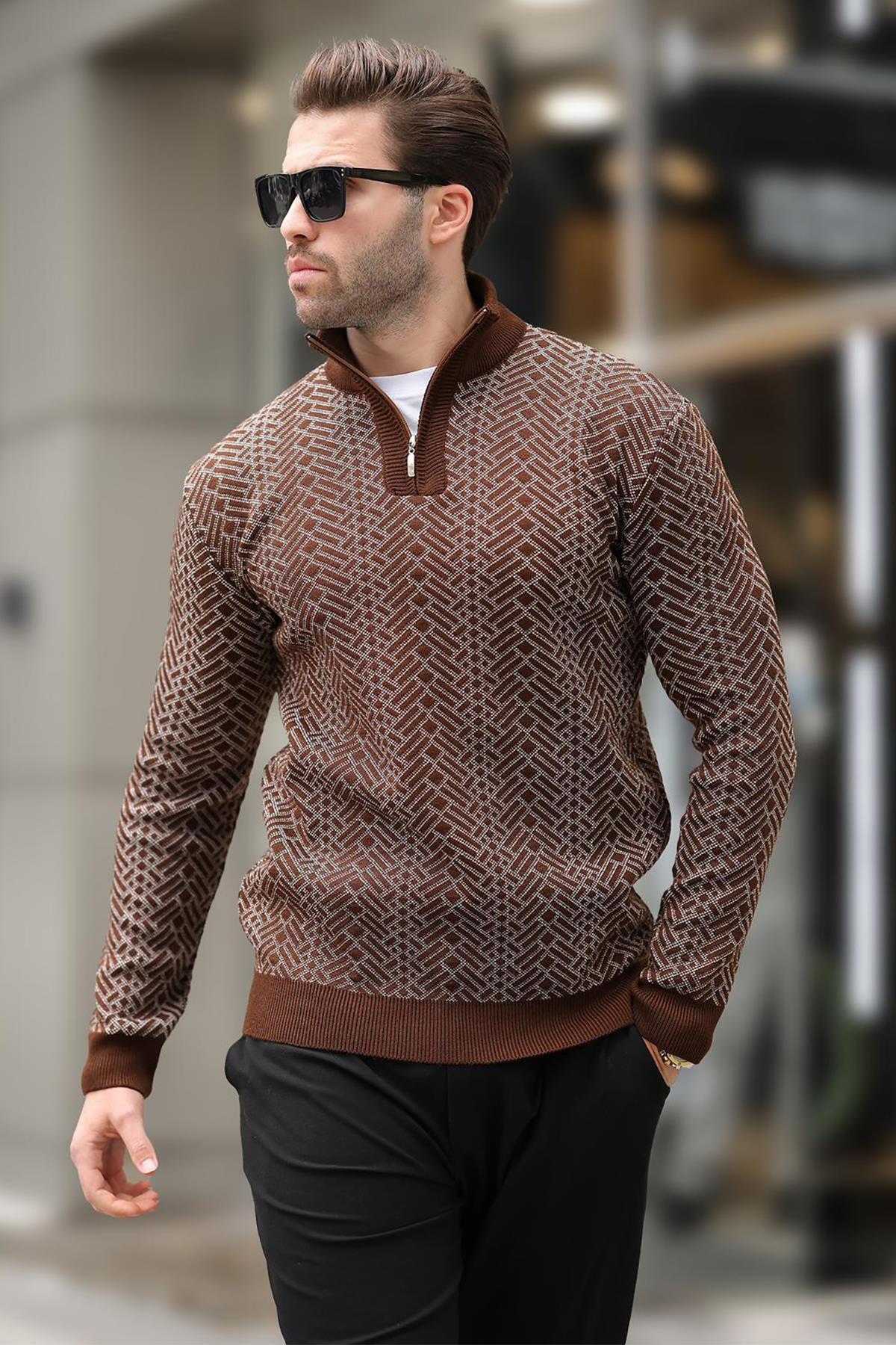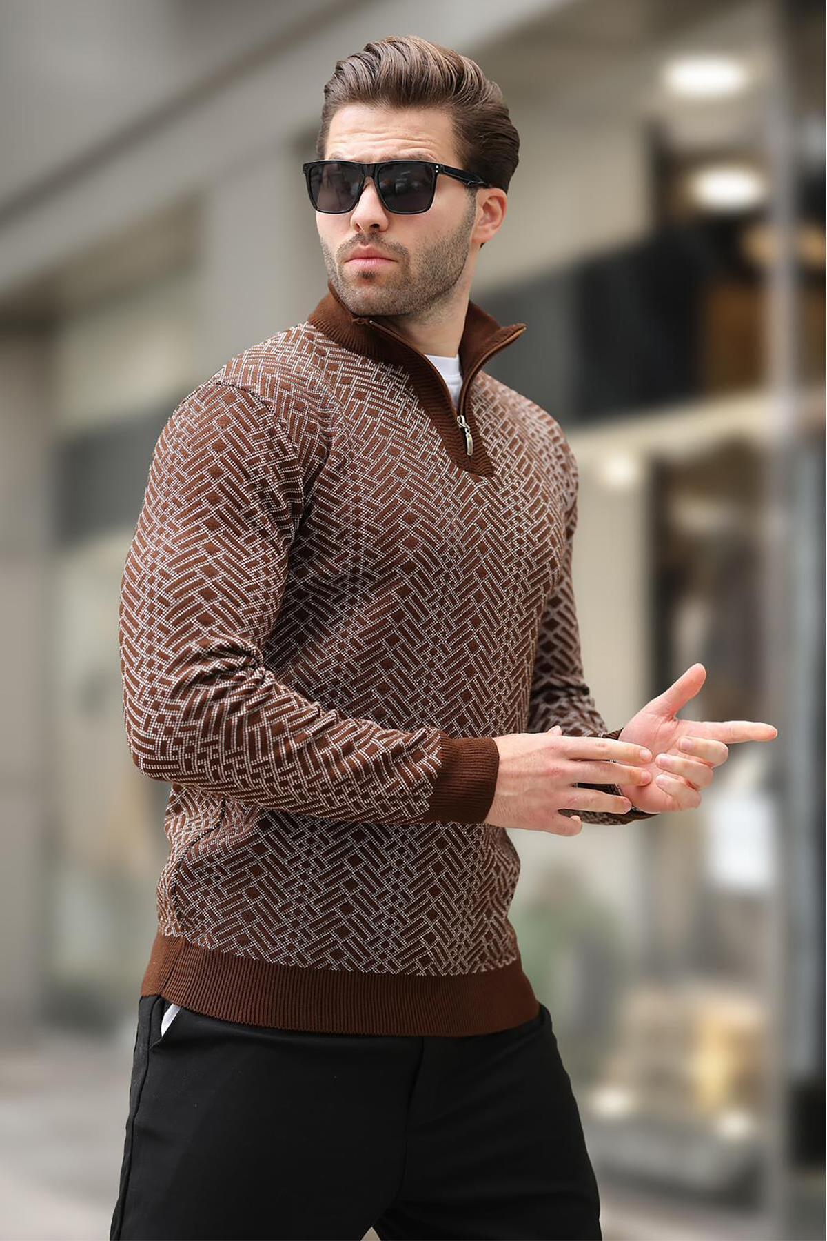 پلیور بافتنی زیپ دار یقه طرح‎دار آستین بلند قهوه‎ای برند Madmext کد 1735366201