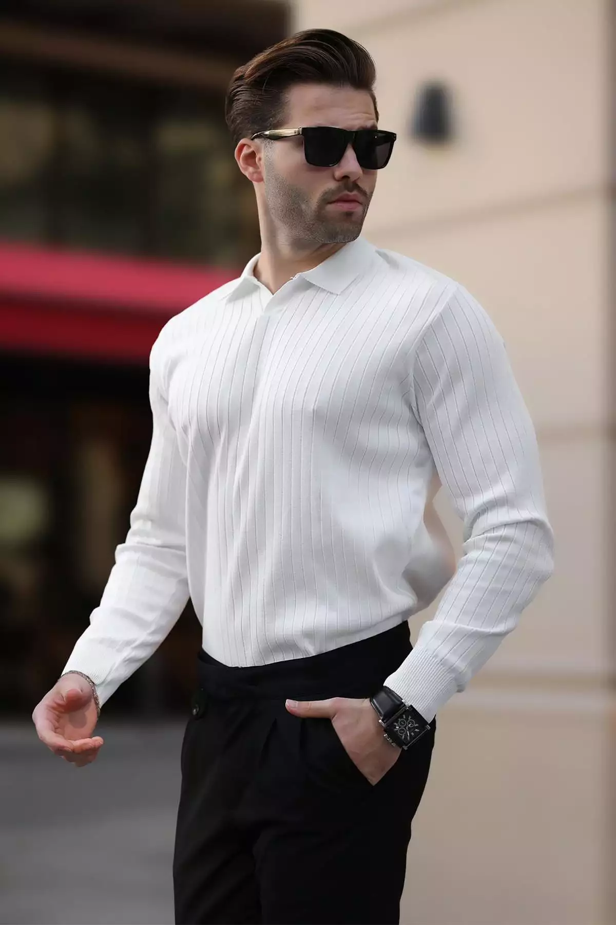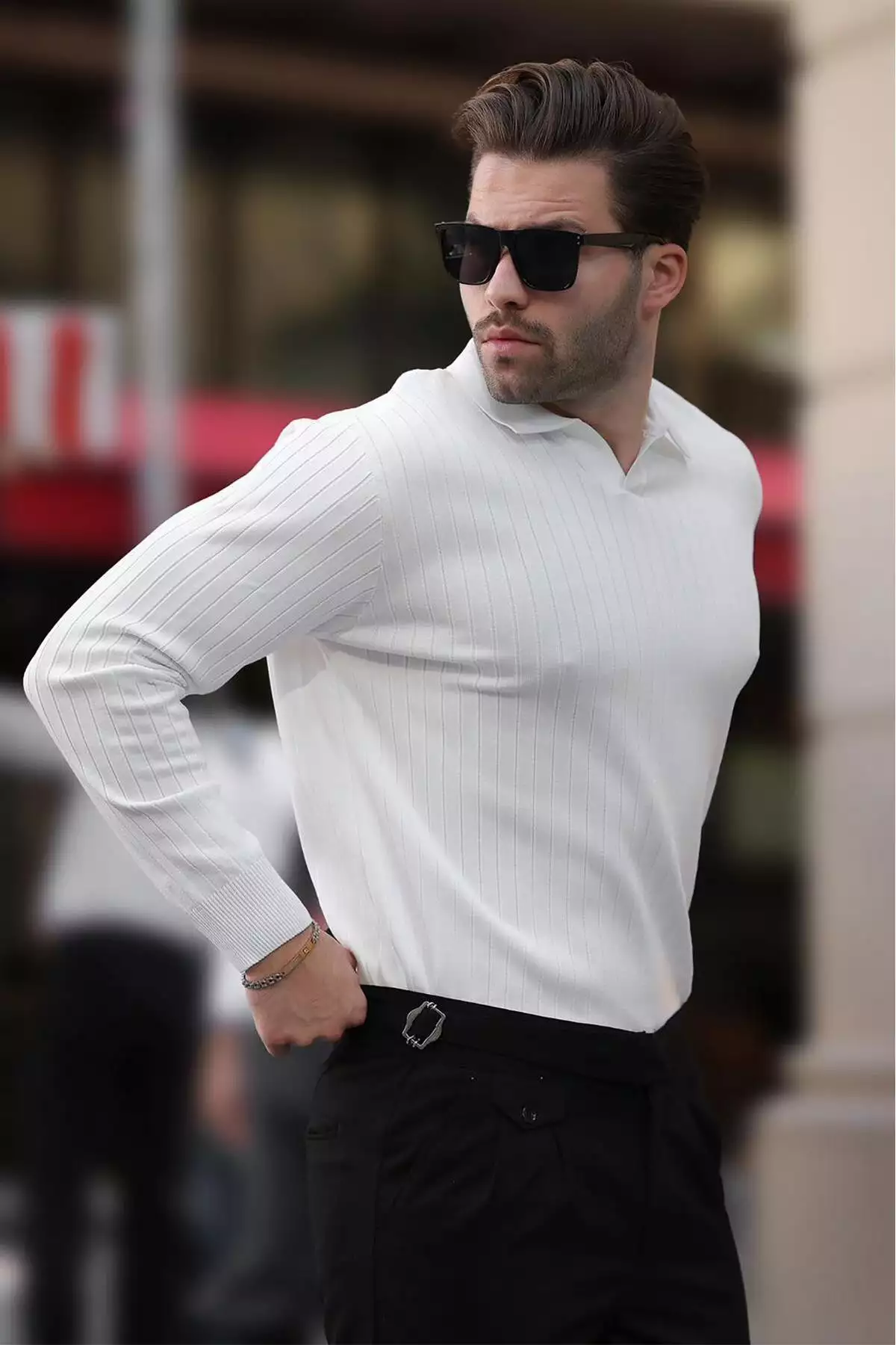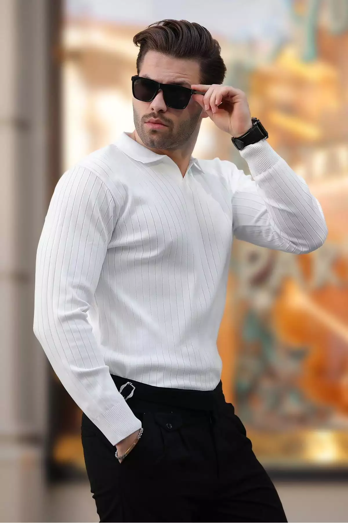 پلیور یقه دار خط دار سفید با آستین بلند ۷۲۳۹ برند Madmext