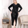 پیراهن مجلسی یقه V، مخمل با تزئینات پولک، دارای برش جلو، مخصوص مناسبتهای خاص، رنگ سیاه برند ADASTYLE