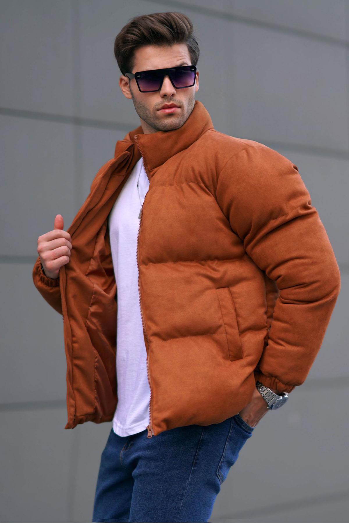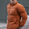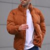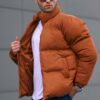 ژاکت پف دار مردانه قهوه ای رنگ با طرحی راحت و ساده، ایده آل برای استفاده روزانه.