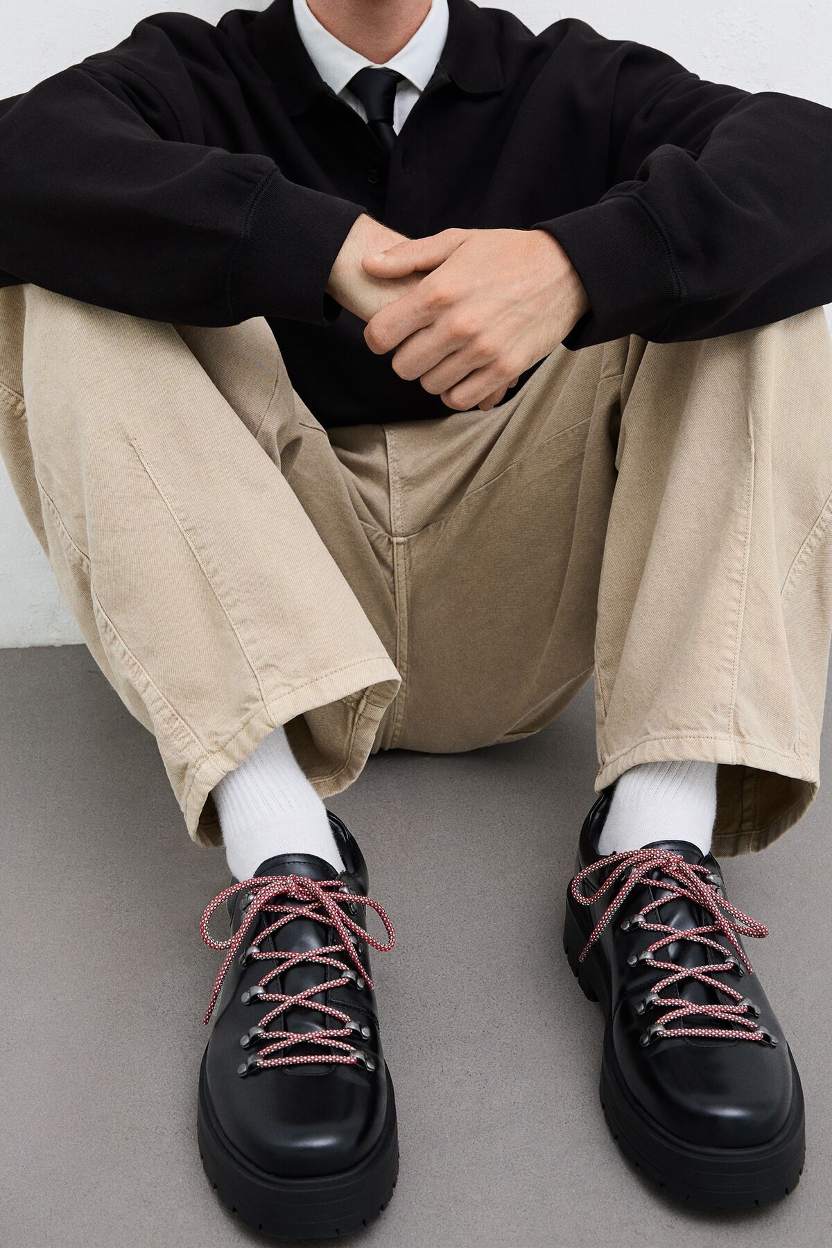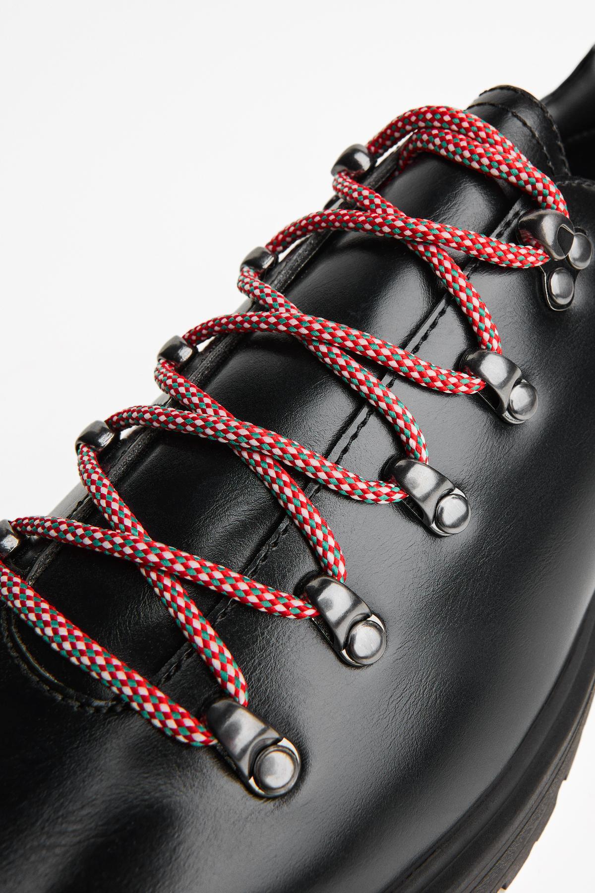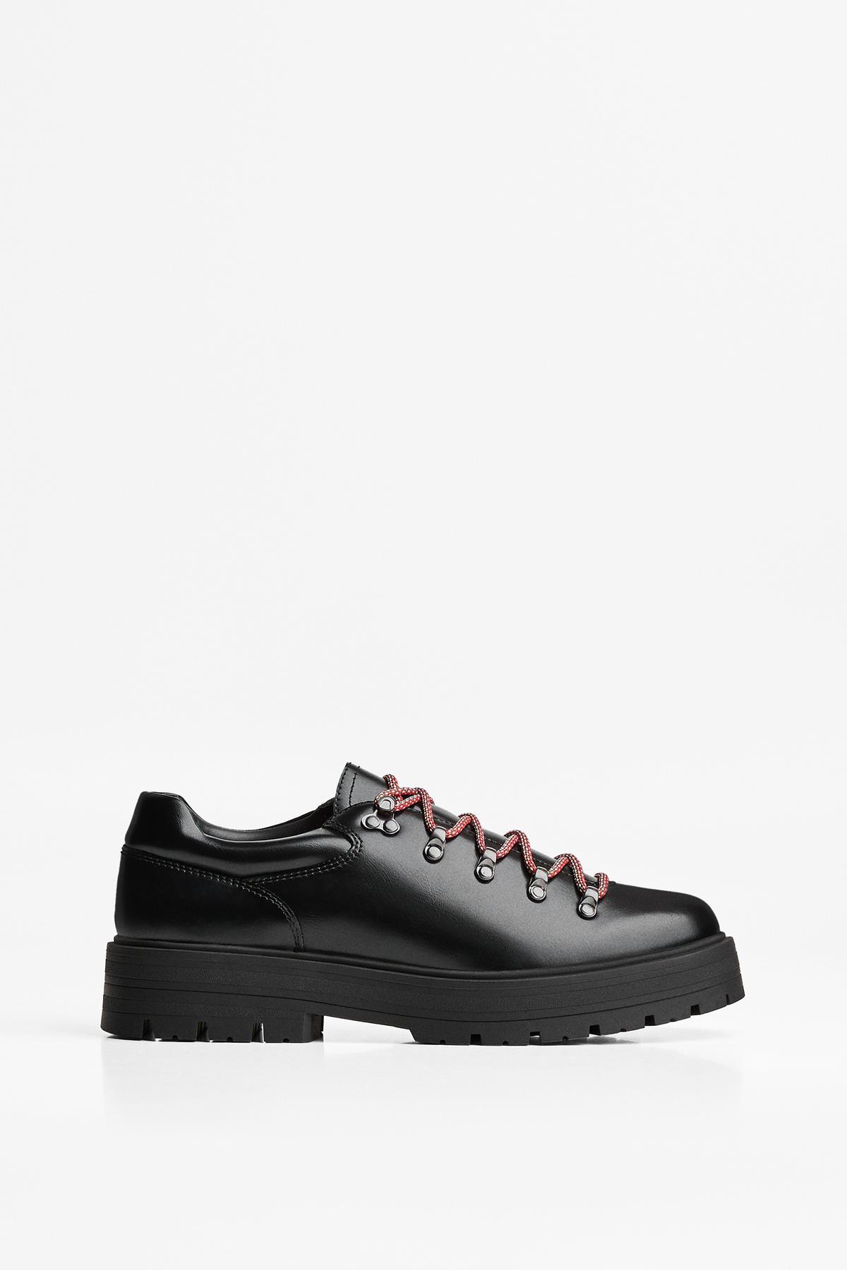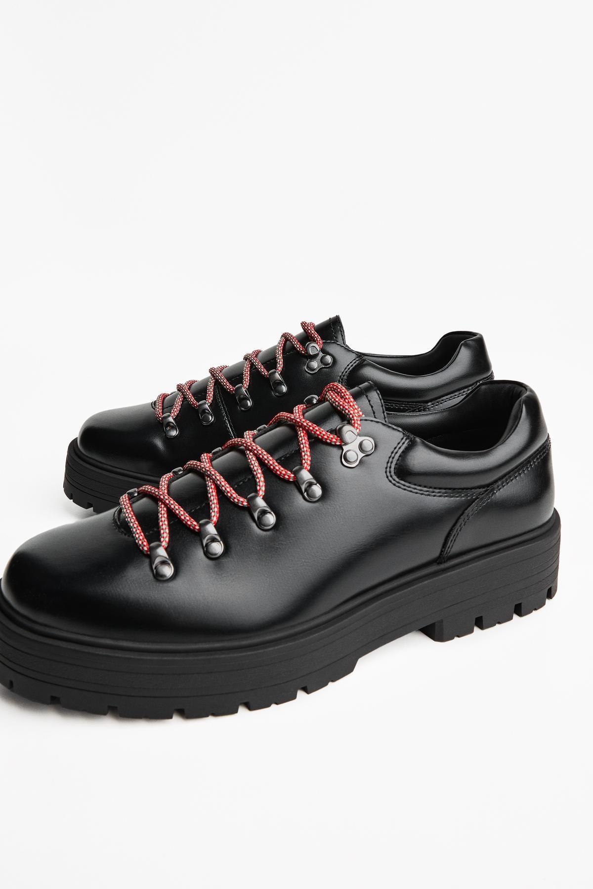 کفش با جزئیات فلزی Bershka در رنگ مشکی ارائه شده که به راحتی با هر نوع لباسی ست میشود. این رنگ به آن ظاهری کلاسیک و در عین حال مدرن میدهد.