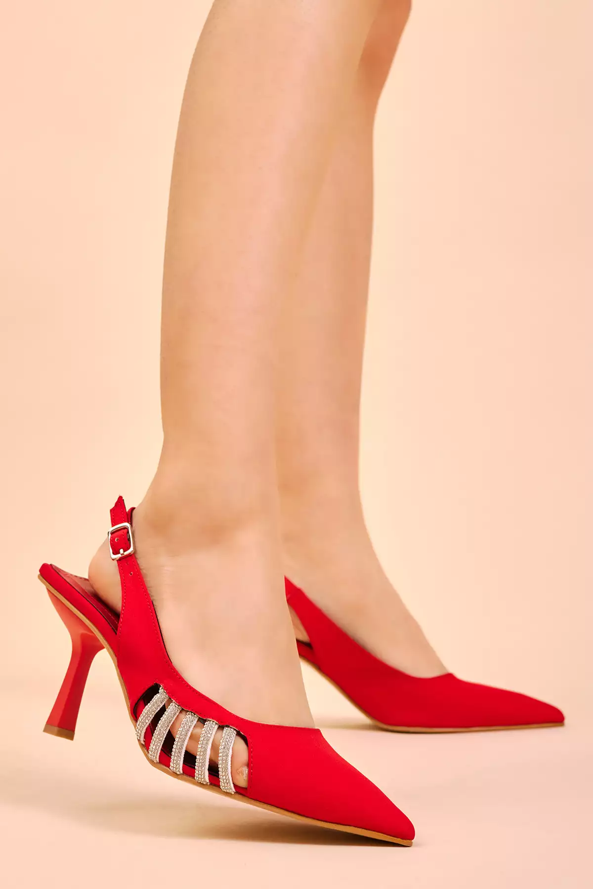 کفش پاشنه‌بلند سرپنجه‌ای زنانه سری شب قرمز با تزئینات سنگی کناری برند Tonny Black – 659934952