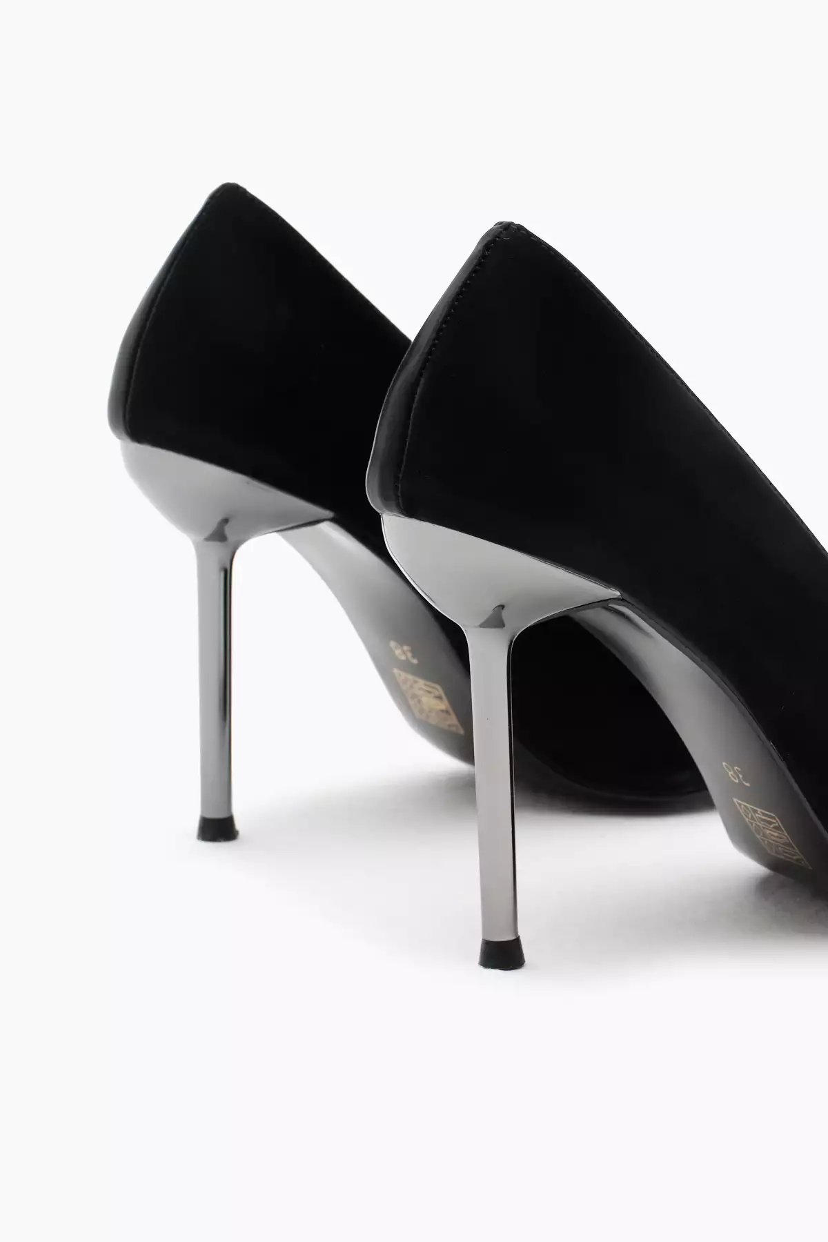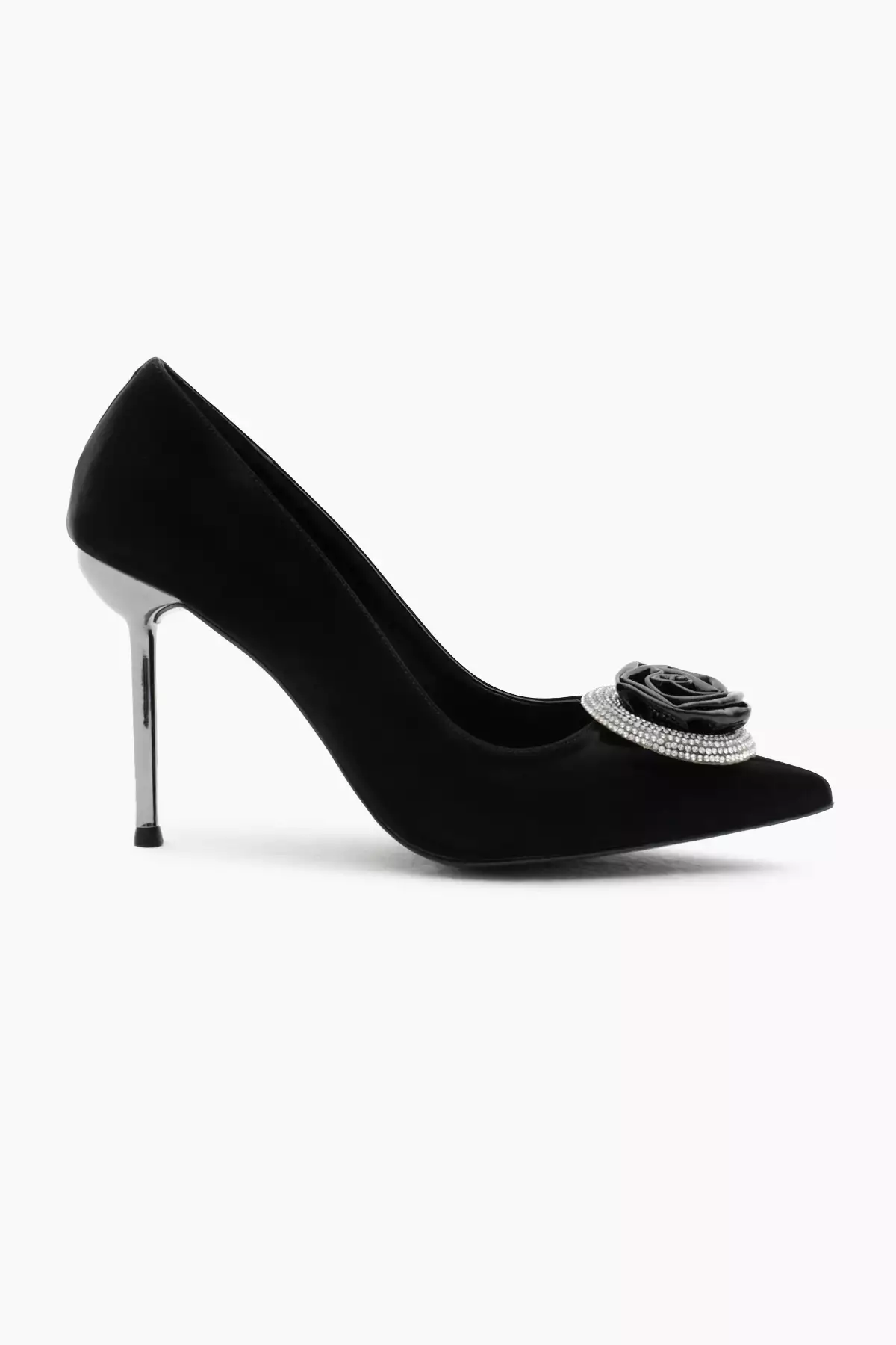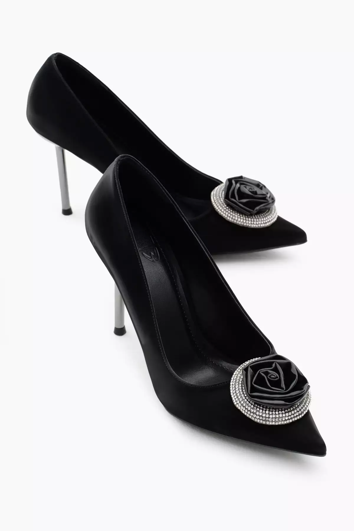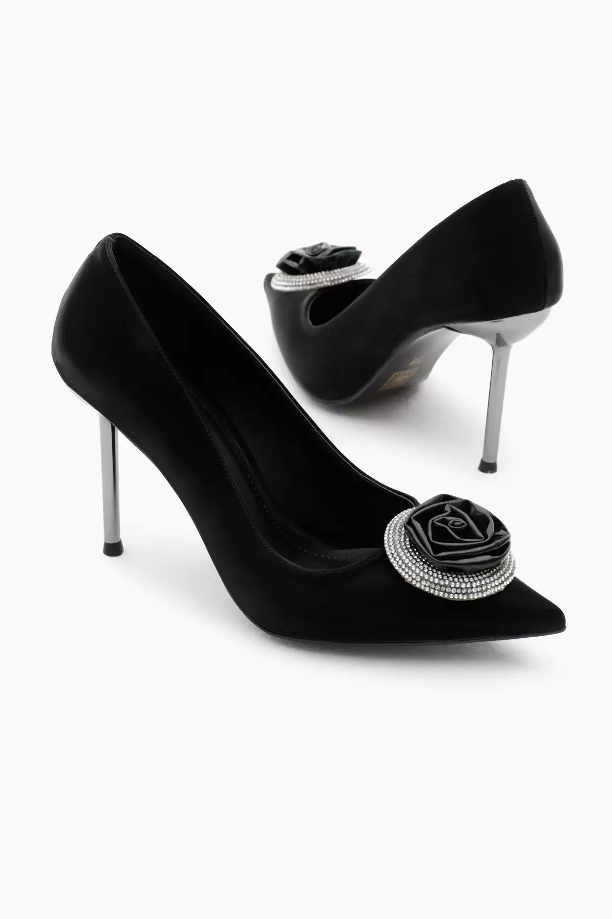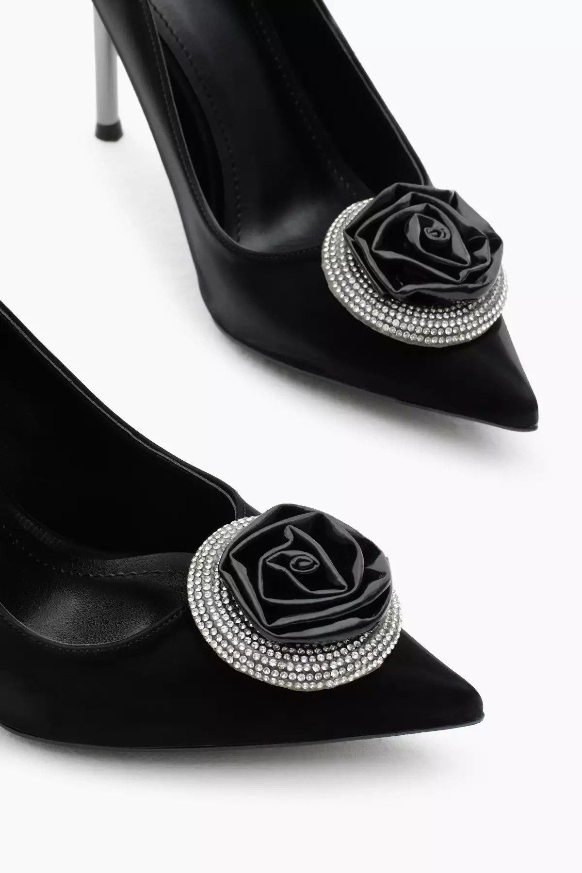 کفش پاشنه بلند نوک تیز مشکی زنانه با طرح گل و تزئینات سنگی روی سینه برند Tonny Black