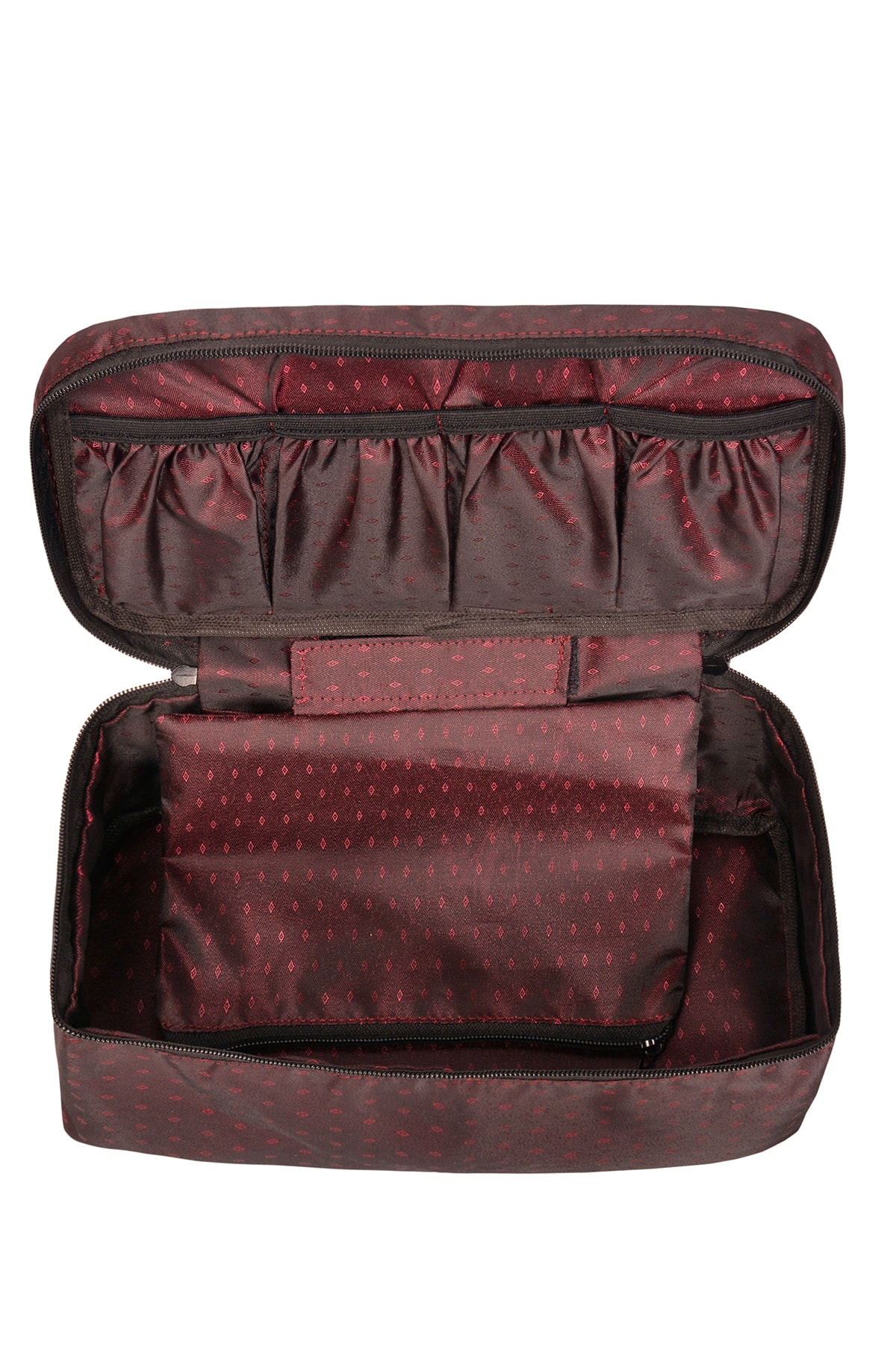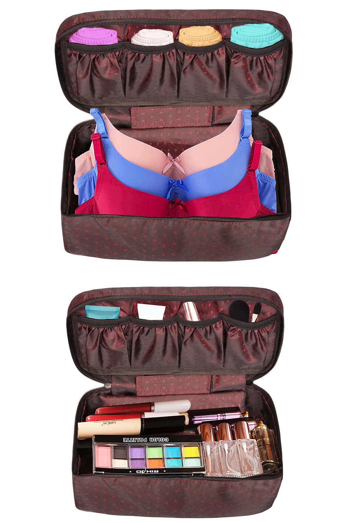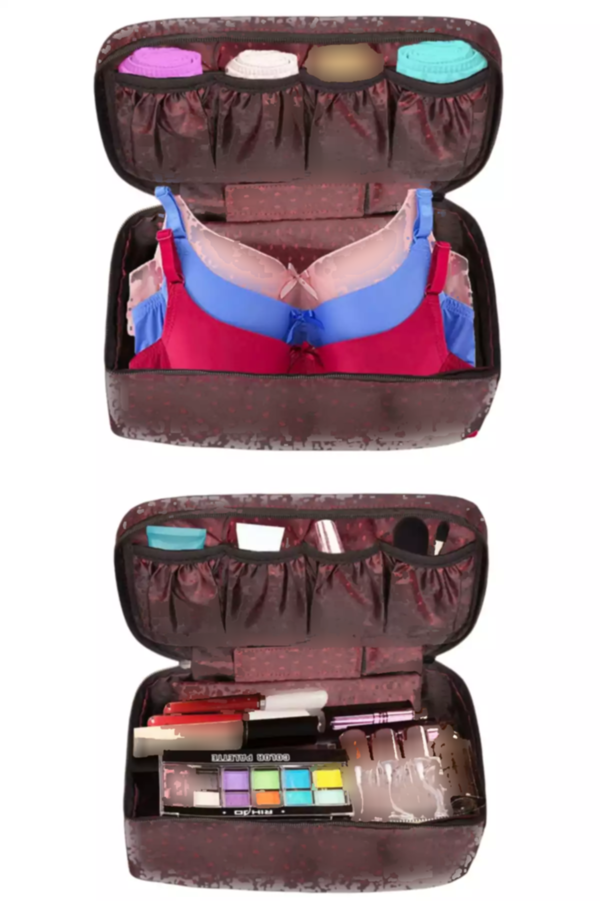 کیف آرایش bordo همچنین دارای چندین فضای جیب و کوچک است که میتواند برای نگهداری سوتین و لباس زیر نیز استفاده شود. این ویژگی به شما کمک میکند تا در سفرها یا حتی در خانه، همیشه لباسهای زیر و سوتینهای خود را به صورت مرتب و بدون چین و چروک نگه دارید. این کیف نه تنها برای استفاده شخصی مناسب است بلکه میتواند یک هدیه عالی برای دوستان یا اعضای خانواده باشد.