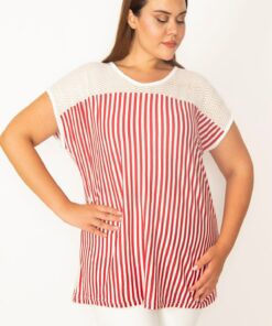 بلوز زنانه بزرگ سایز قرمز با دامن دانتل و آستین کوتاه خطی 65n27394 کد 1742308331